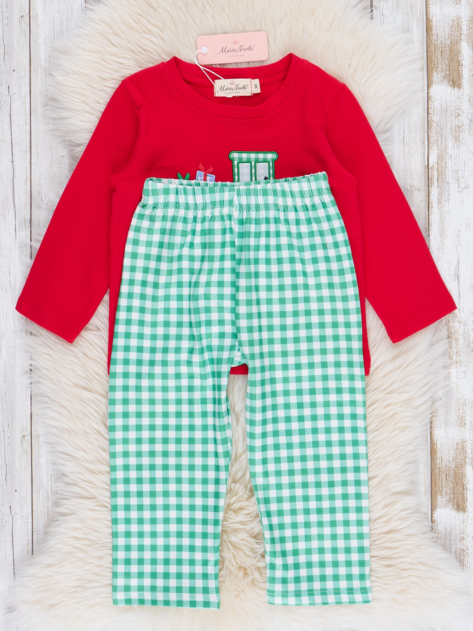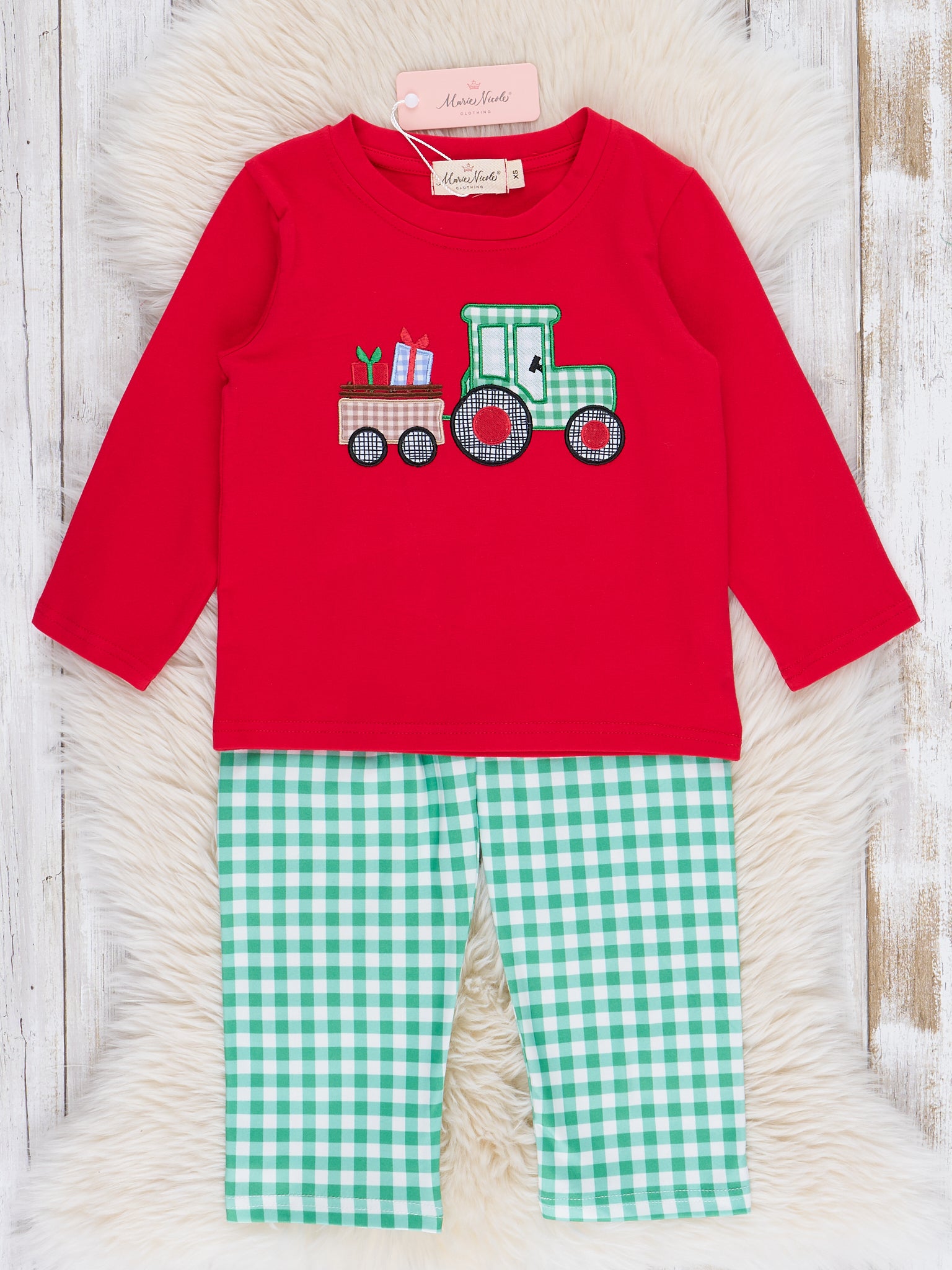 Red & Green Gingham Embroidered Holiday Tractor Outfit