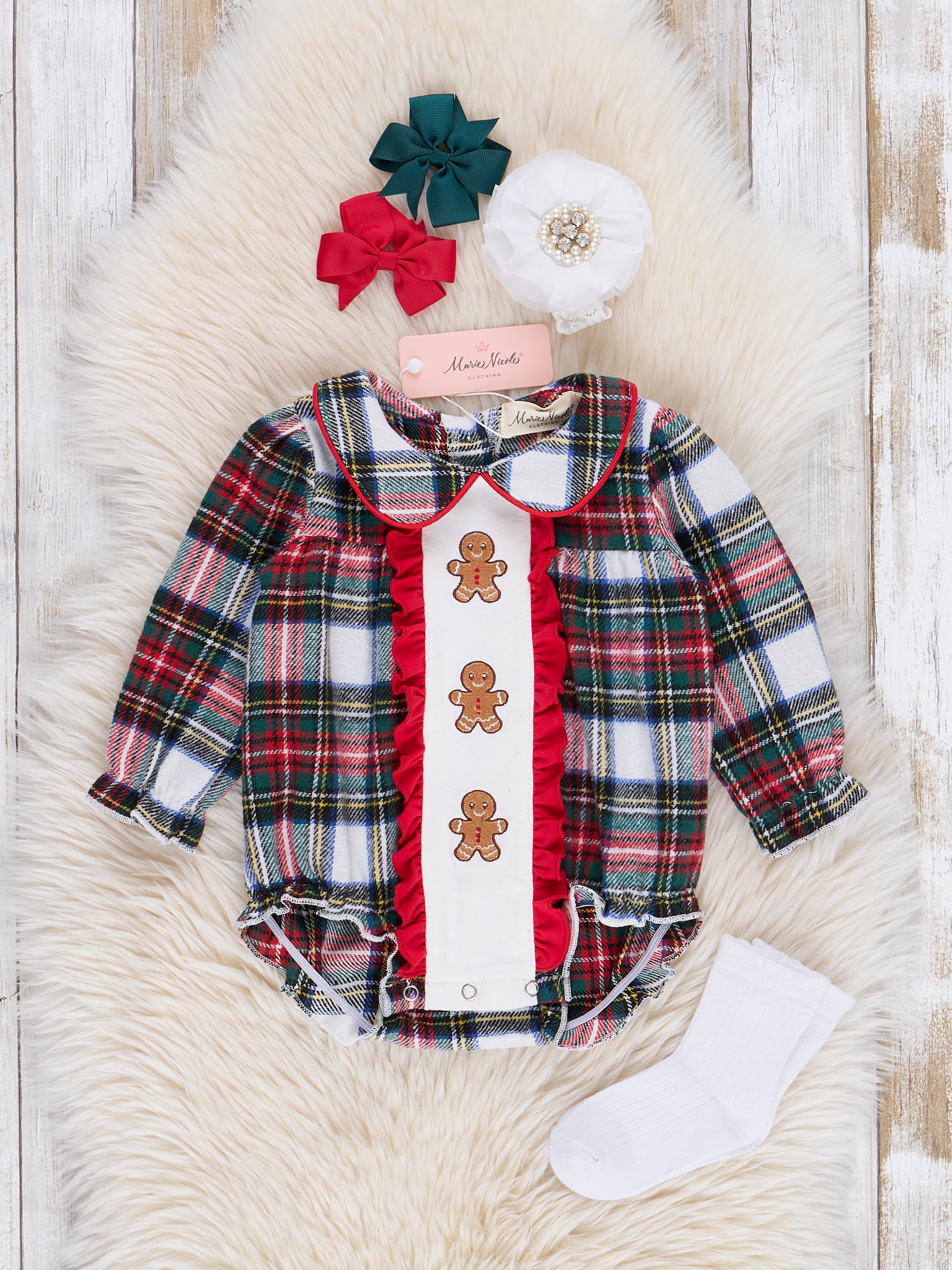 Red & Green Plaid Embroidered Gingerbread Ruffle Bubble