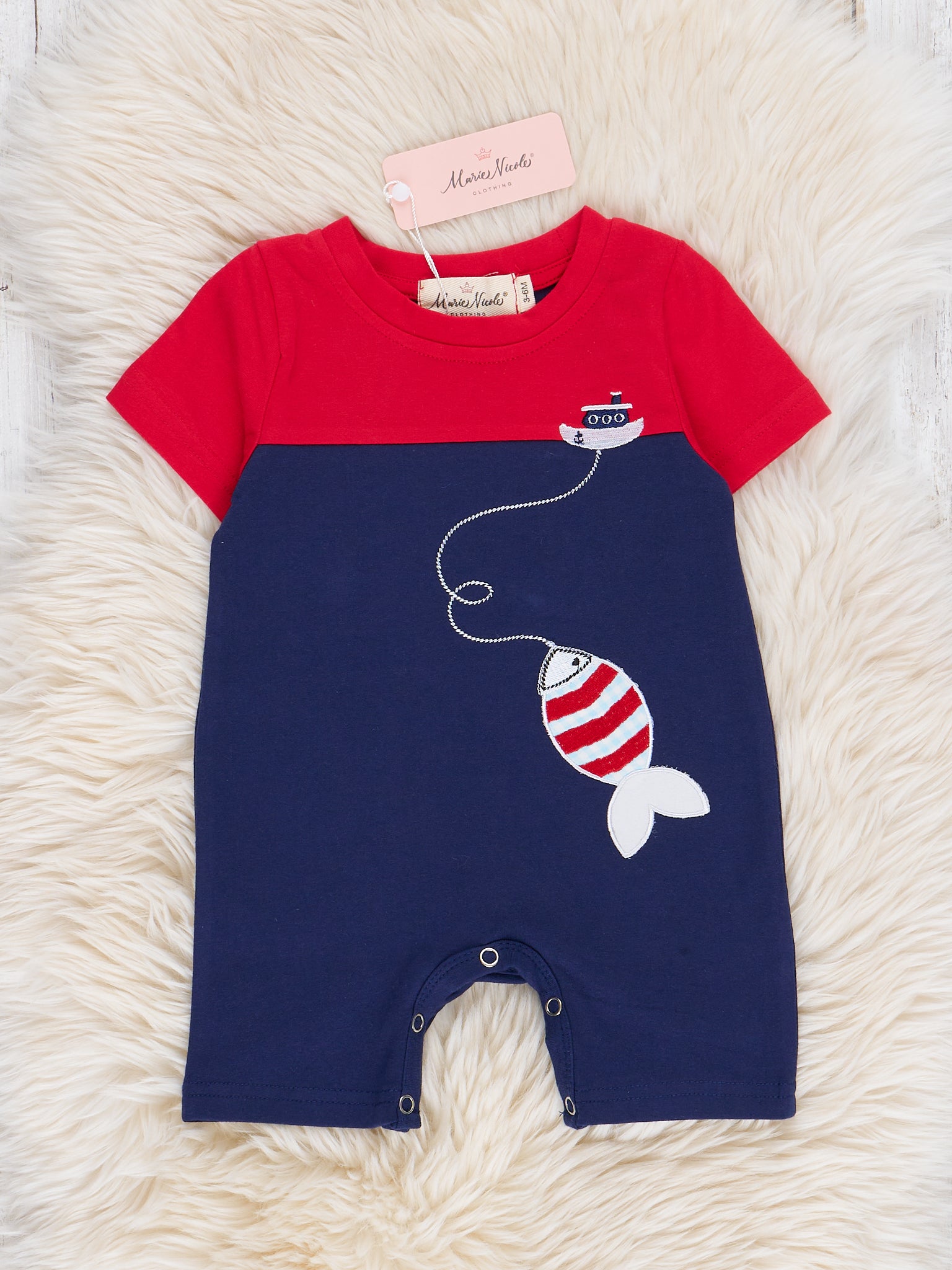 Go from lake to land in style with our Red & Navy Gone Fishing Romper. This boys' romper features a playful color block design with an embroidered fishing motif, perfect for the summer season. Coordinate with our brother set for a matching look. From Marie Nicole Clothing.