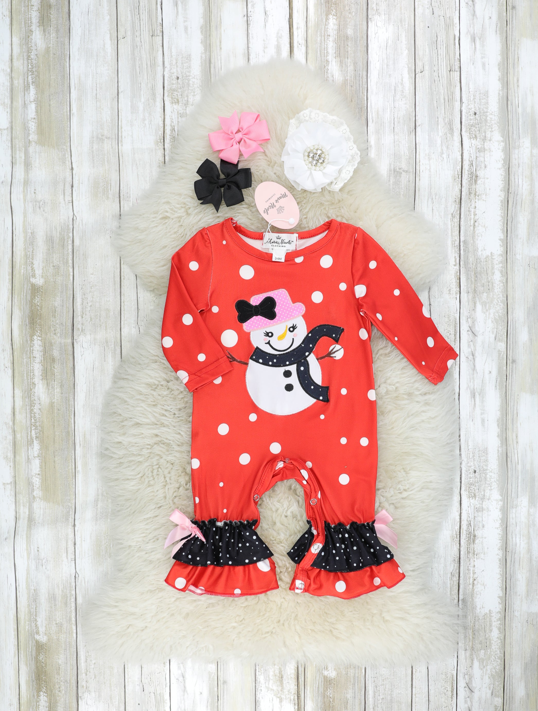 This gorgeous sister set is snow very beautiful! This red romper features polka dots, a sassy snowman appliqué, ruffle details, & bow details at the ankles.