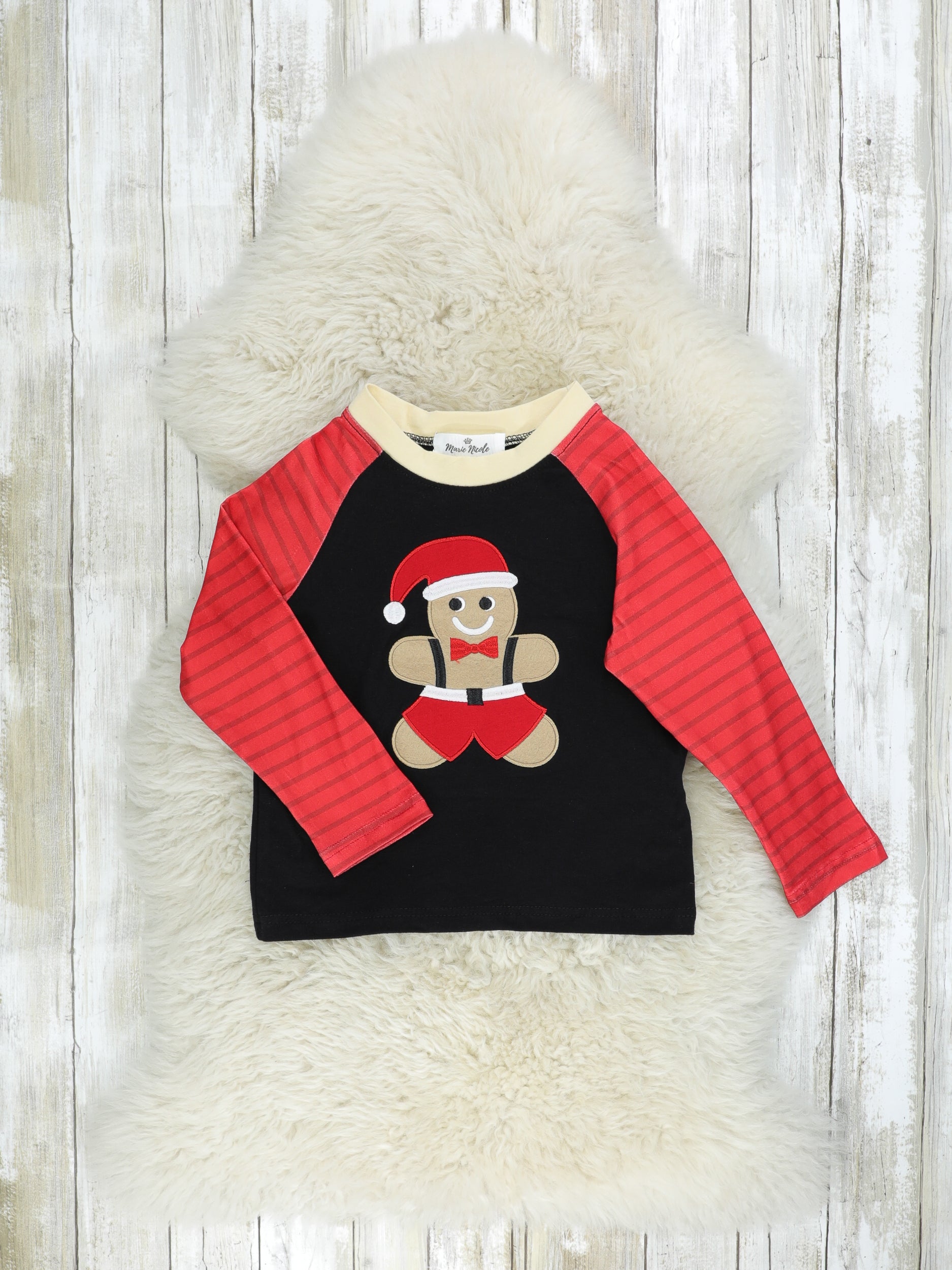 Whisk your little ones a Merry Christmas with this darling shirt! This black shirt features striped raglan sleeves & a gentle gingerbread appliqué.