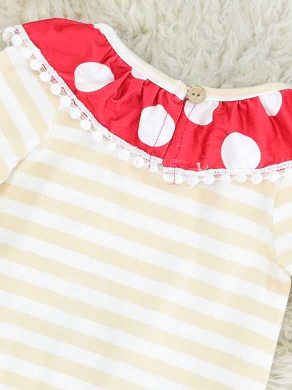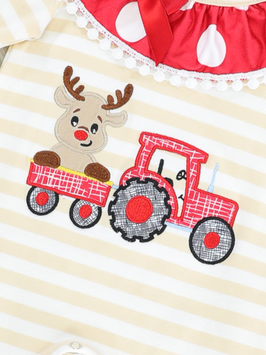 The perfect Christmas sibling set for your little farmers! This striped romper features an adorable reindeer on a tractor detail, a round ruffle neckline, pom pom trim, & red polka dot ruffle details at the ankles.