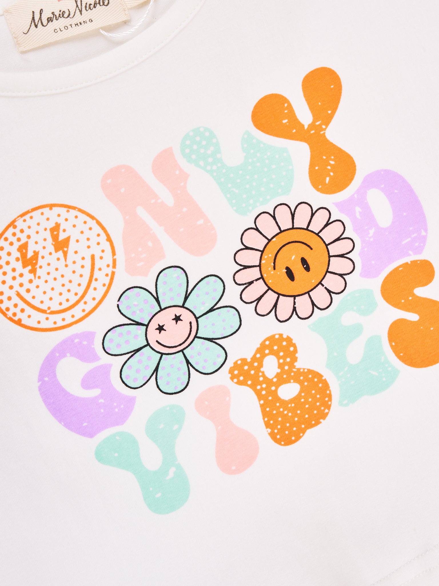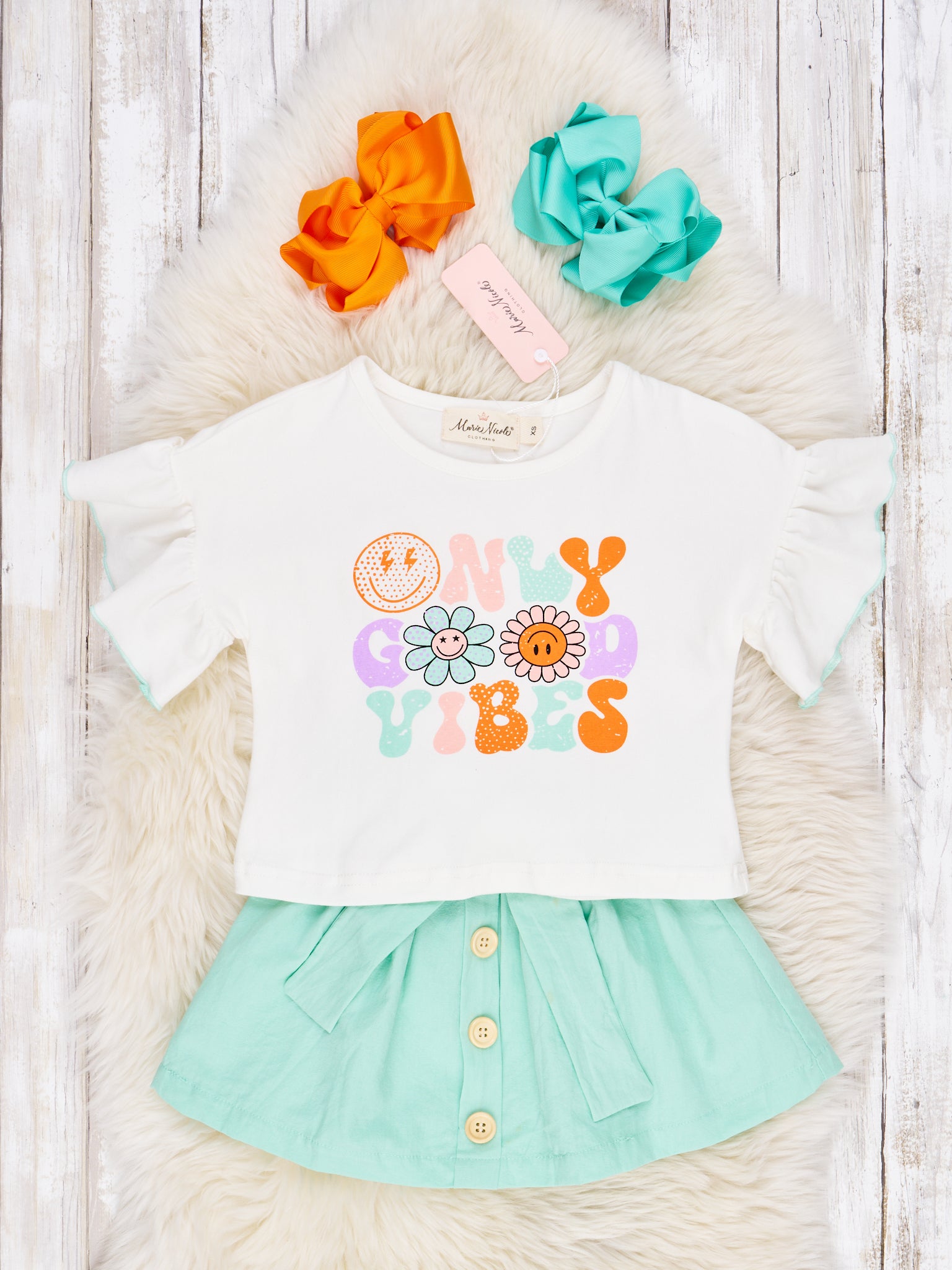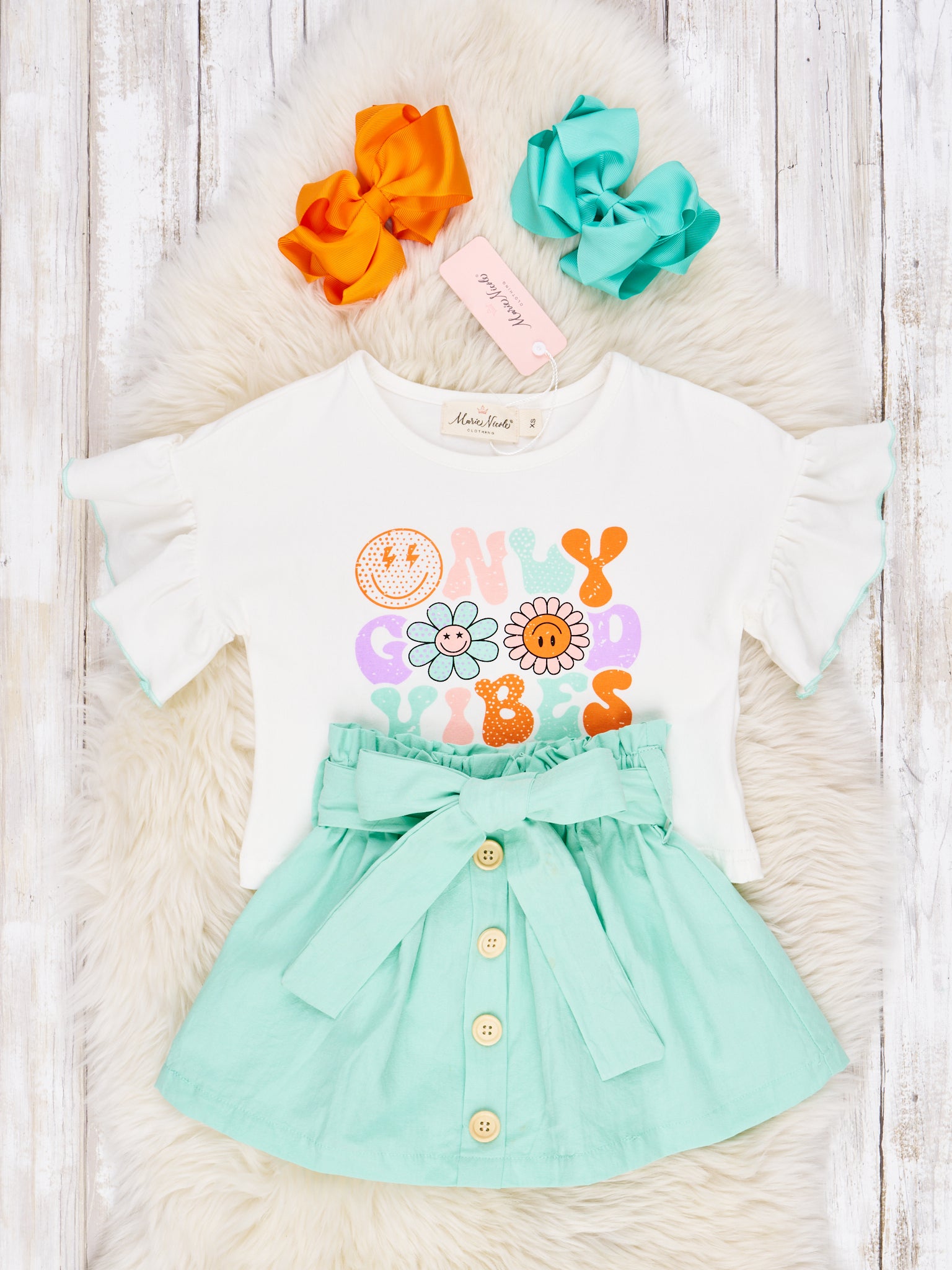 Make a statement with this sassy retro "Only Good Vibes" outfit! From the white top with its smiling sunflower graphic, to the mint skirt with a meaningful ruffle detail, it's sure to bring out your little one's inner fashionista!
