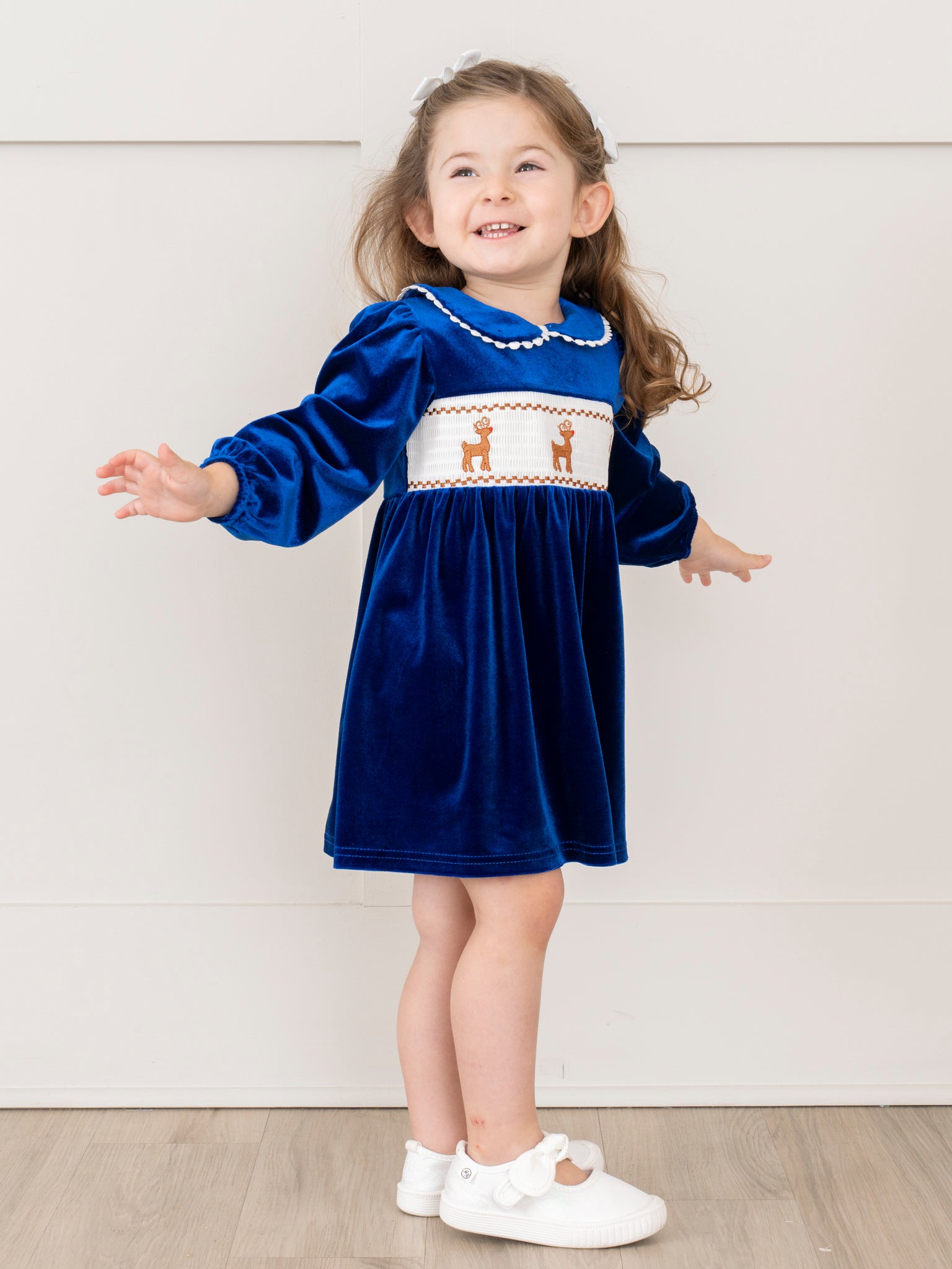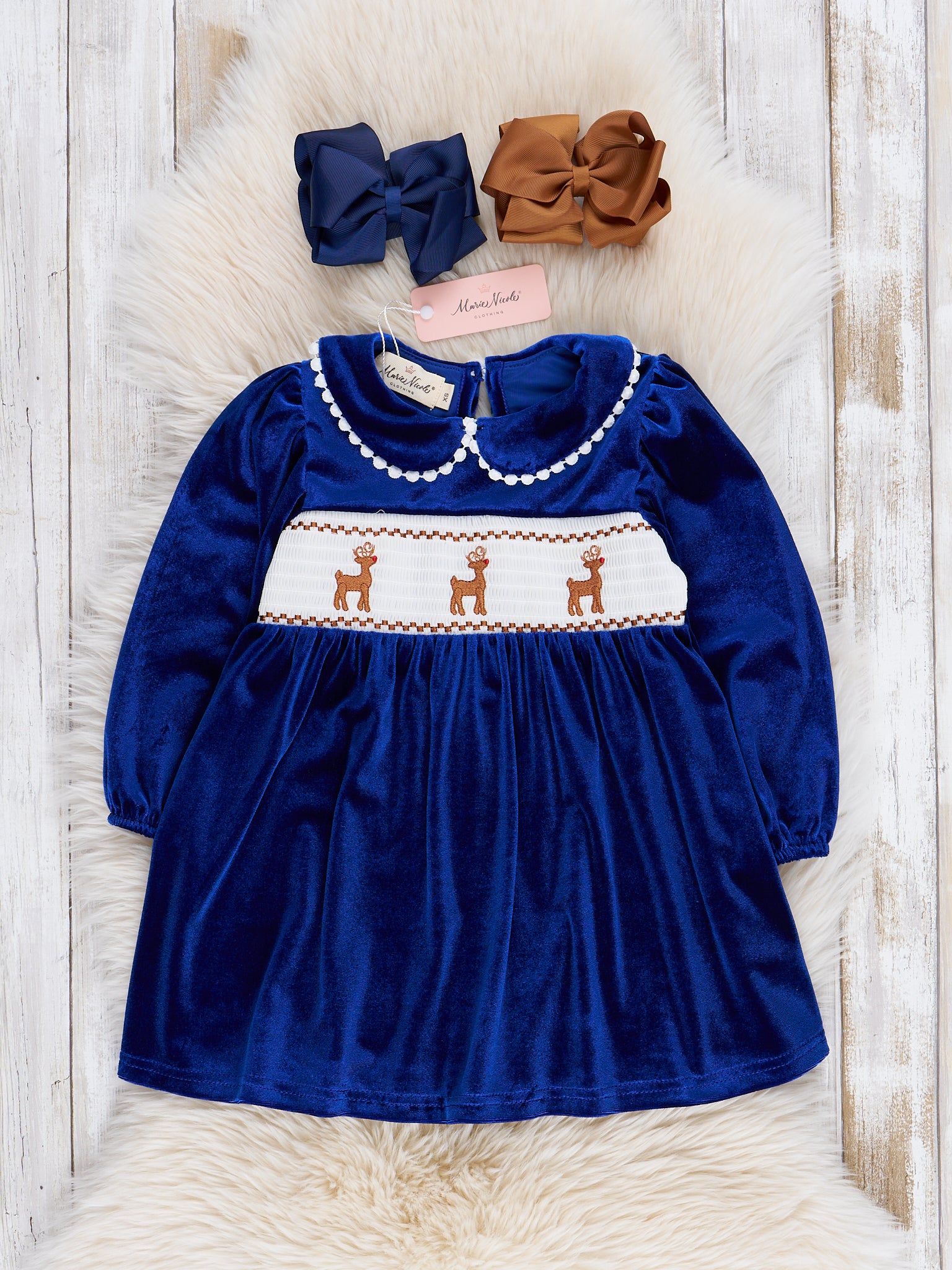 Dress up your little one in this playful Royal Blue Smocked Reindeer Velvet Dress. Featuring embroidered reindeer over a smocked design, this Christmas dress is ideal for your festive family photos. Made with soft blue velvet, this stunning sister set is the perfect Christmas attire. Ho ho how adorable!