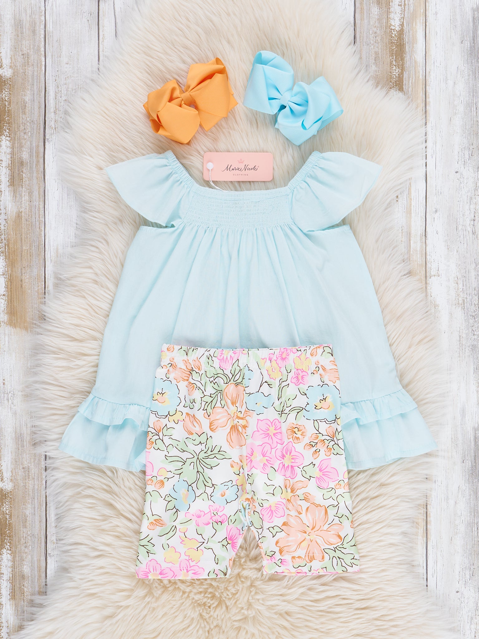 Ride into spring with this darling girls outfit from Marie Nicole Clothing. The light blue swing top features delicate ruffle details, while the wildflower doodle print biker shorts add a playful touch. This sister set is sure to make any little one look and feel like a wildflower!