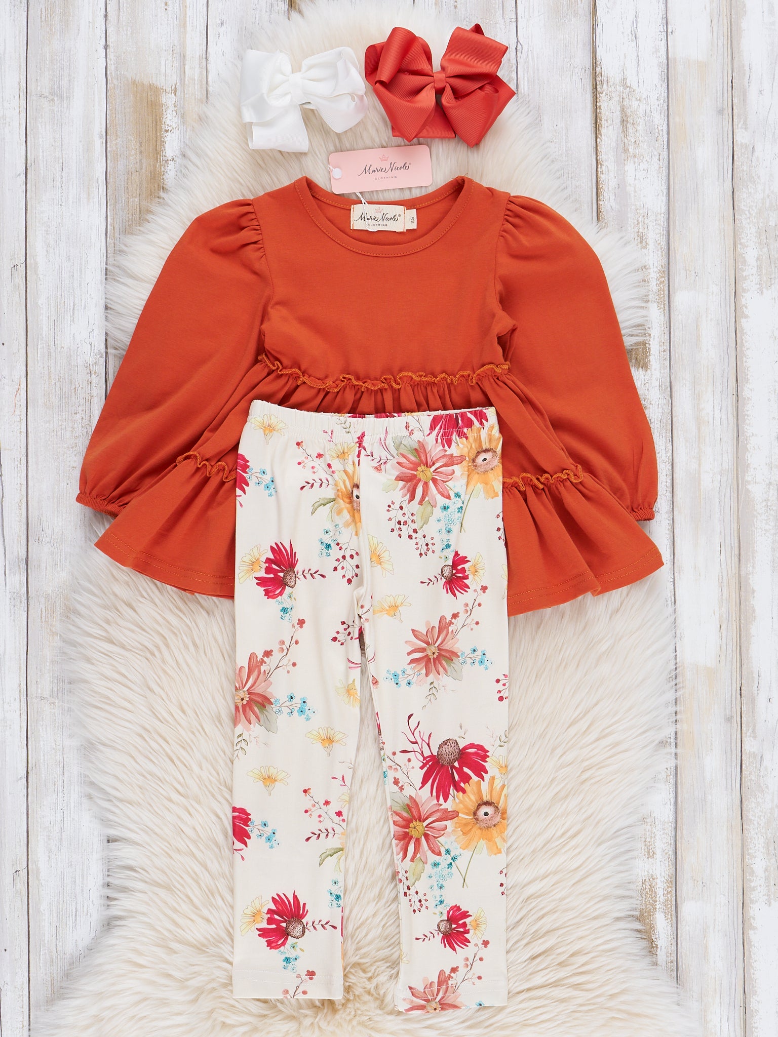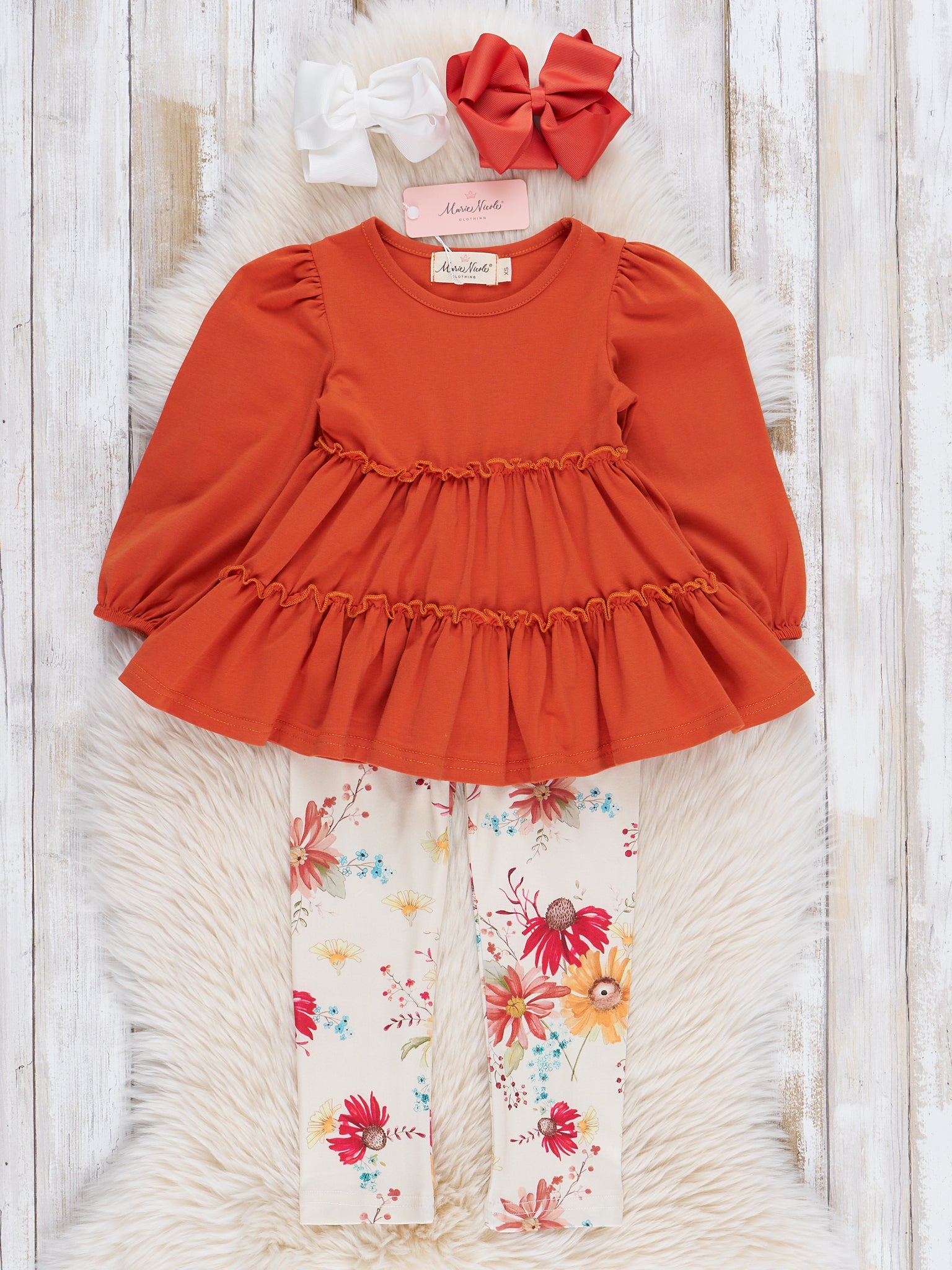 Get ready for autumn with our Rust Tiered Ruffle Floral Outfit! This adorable girls' ensemble features a rust orange ruffle top that adds a touch of whimsy, paired with floral print leggings for a stylish and comfortable look. Perfect for any fall adventure! By Marie Nicole Clothing.