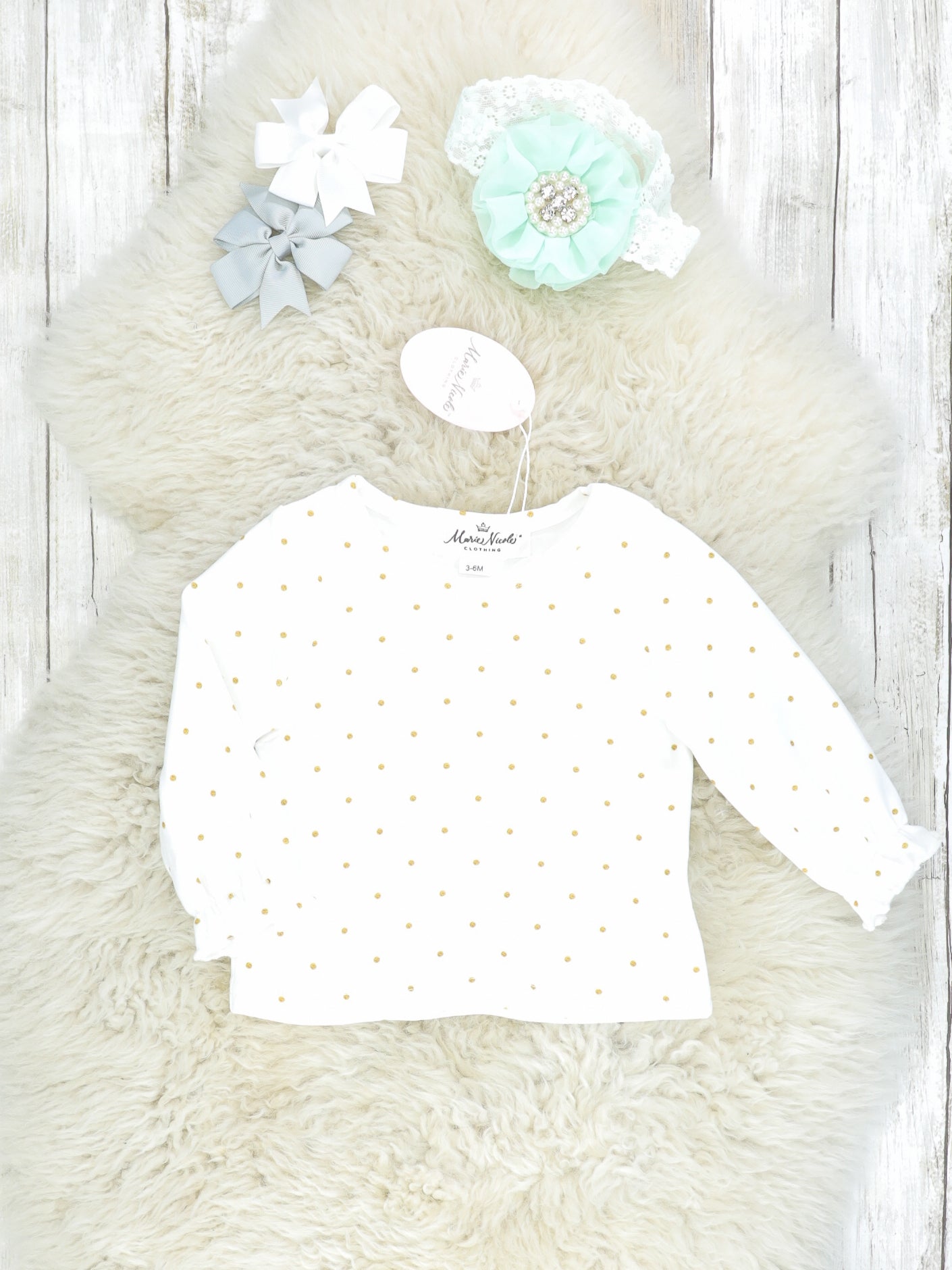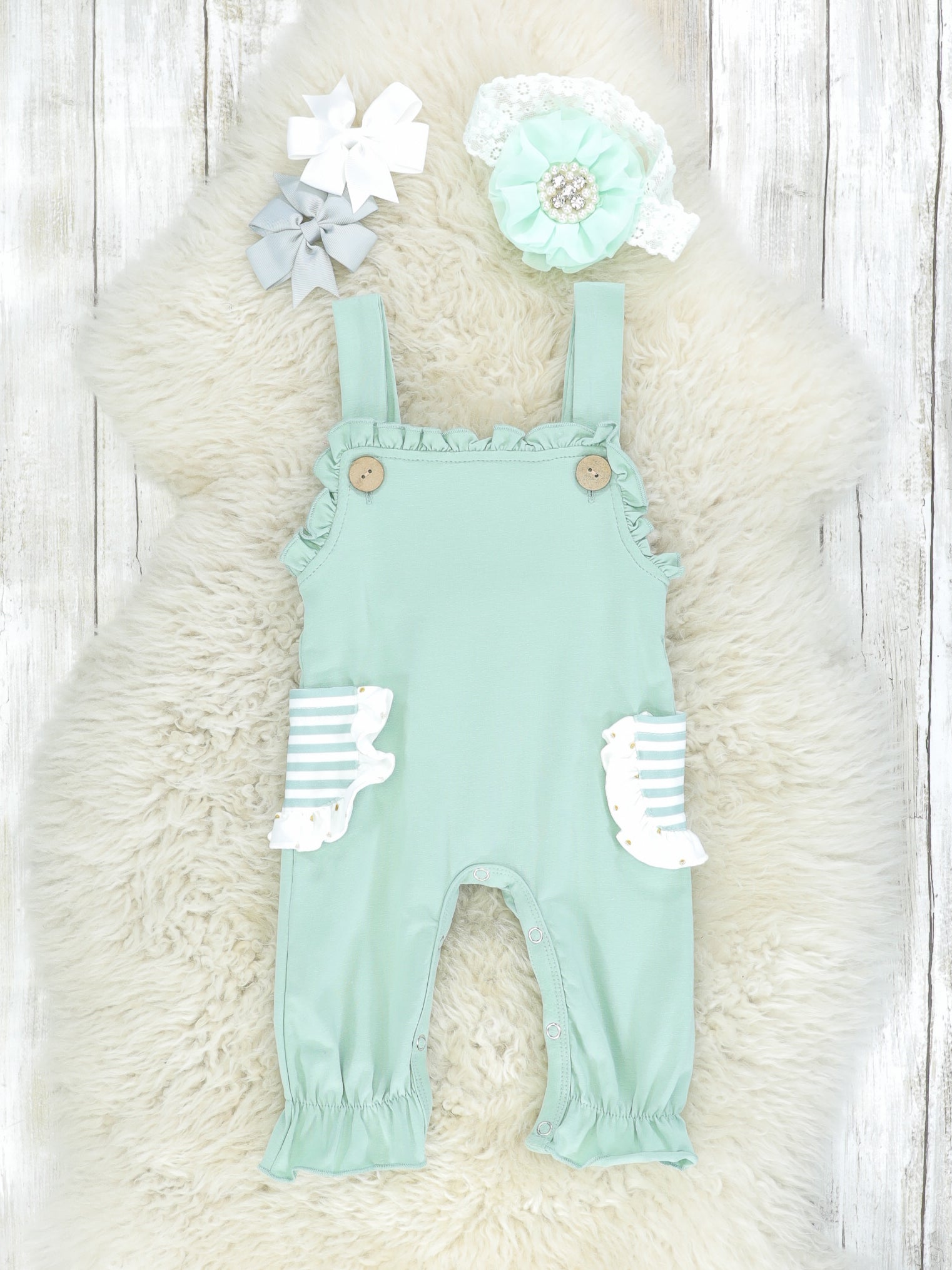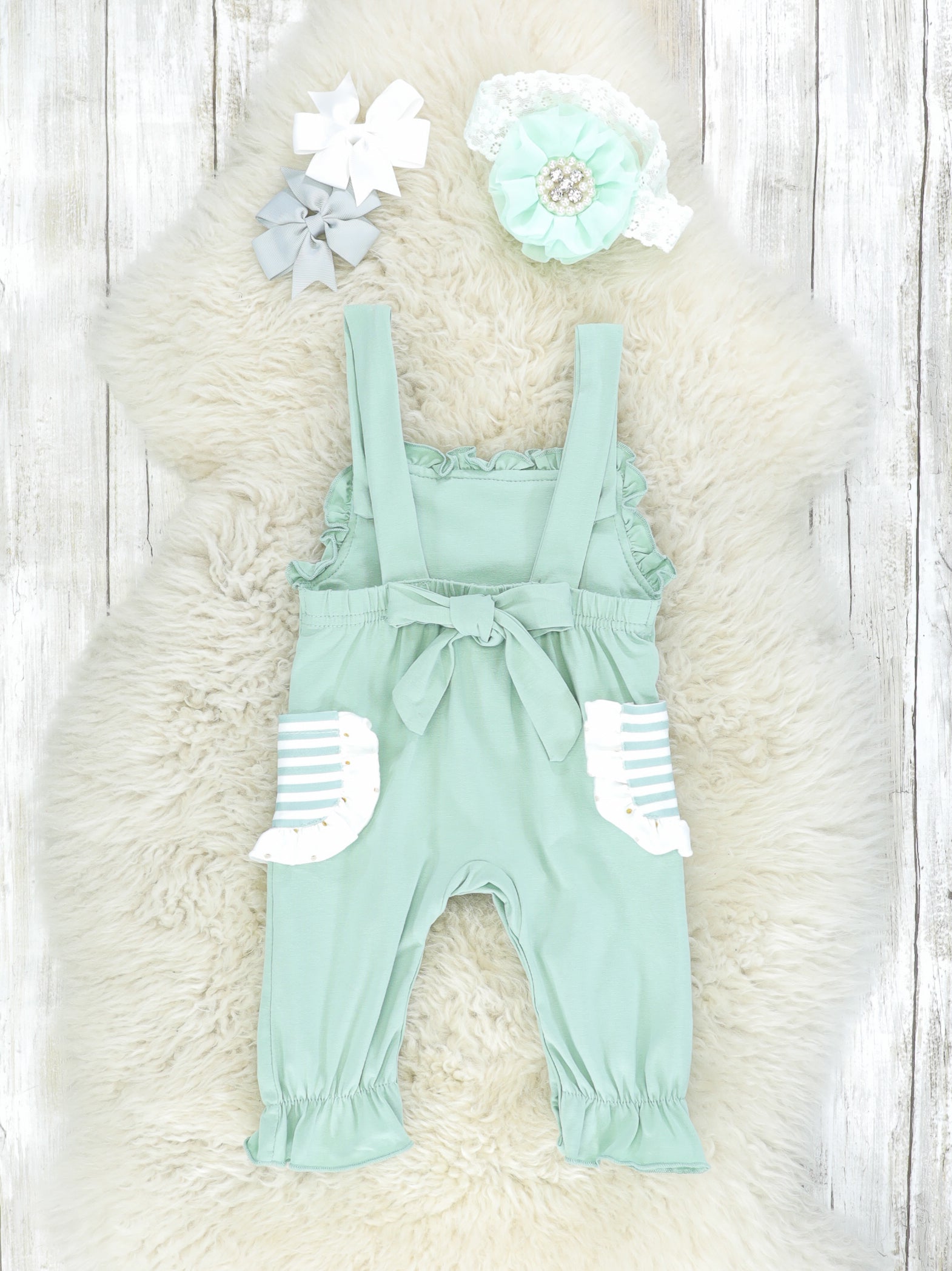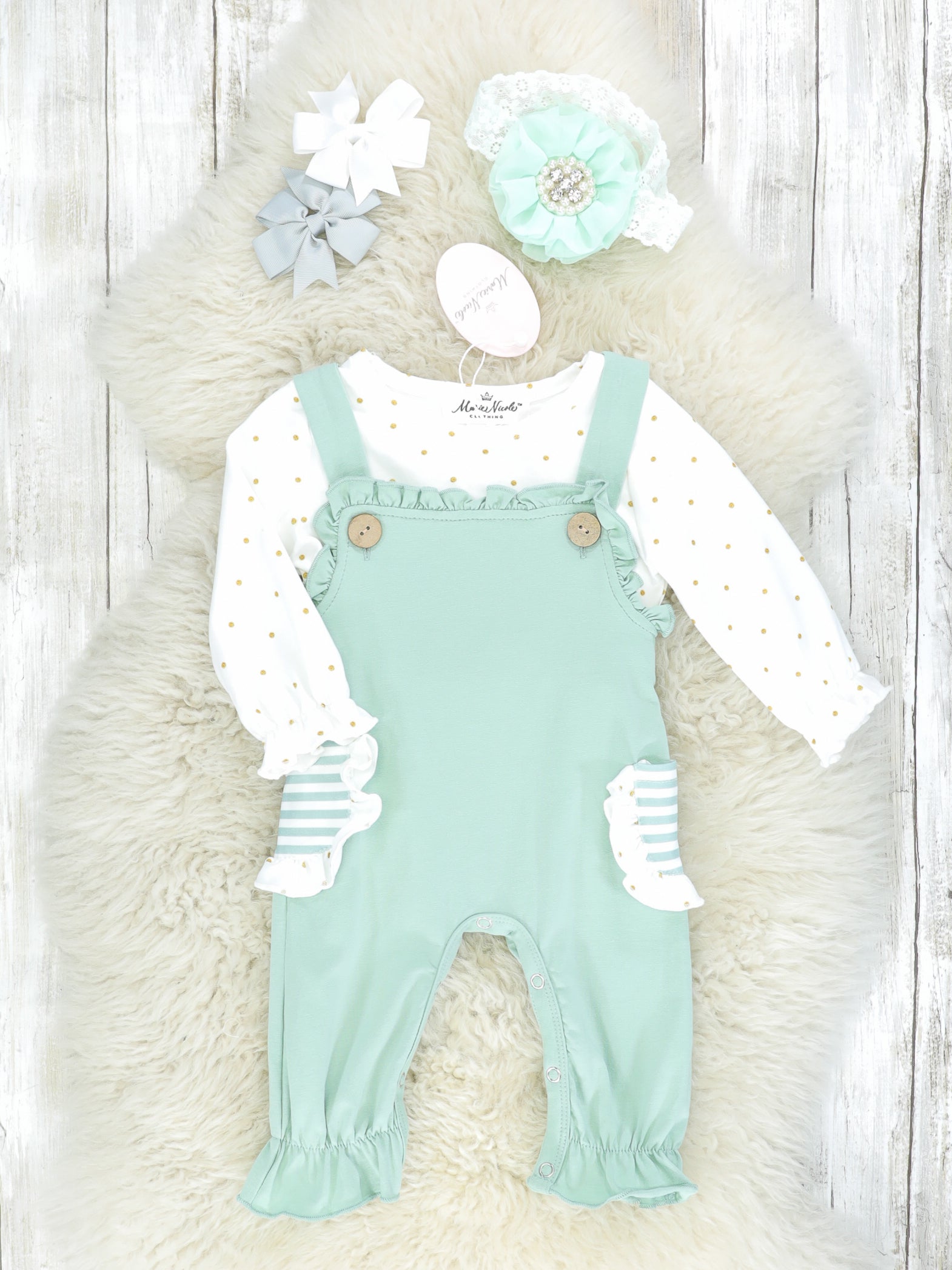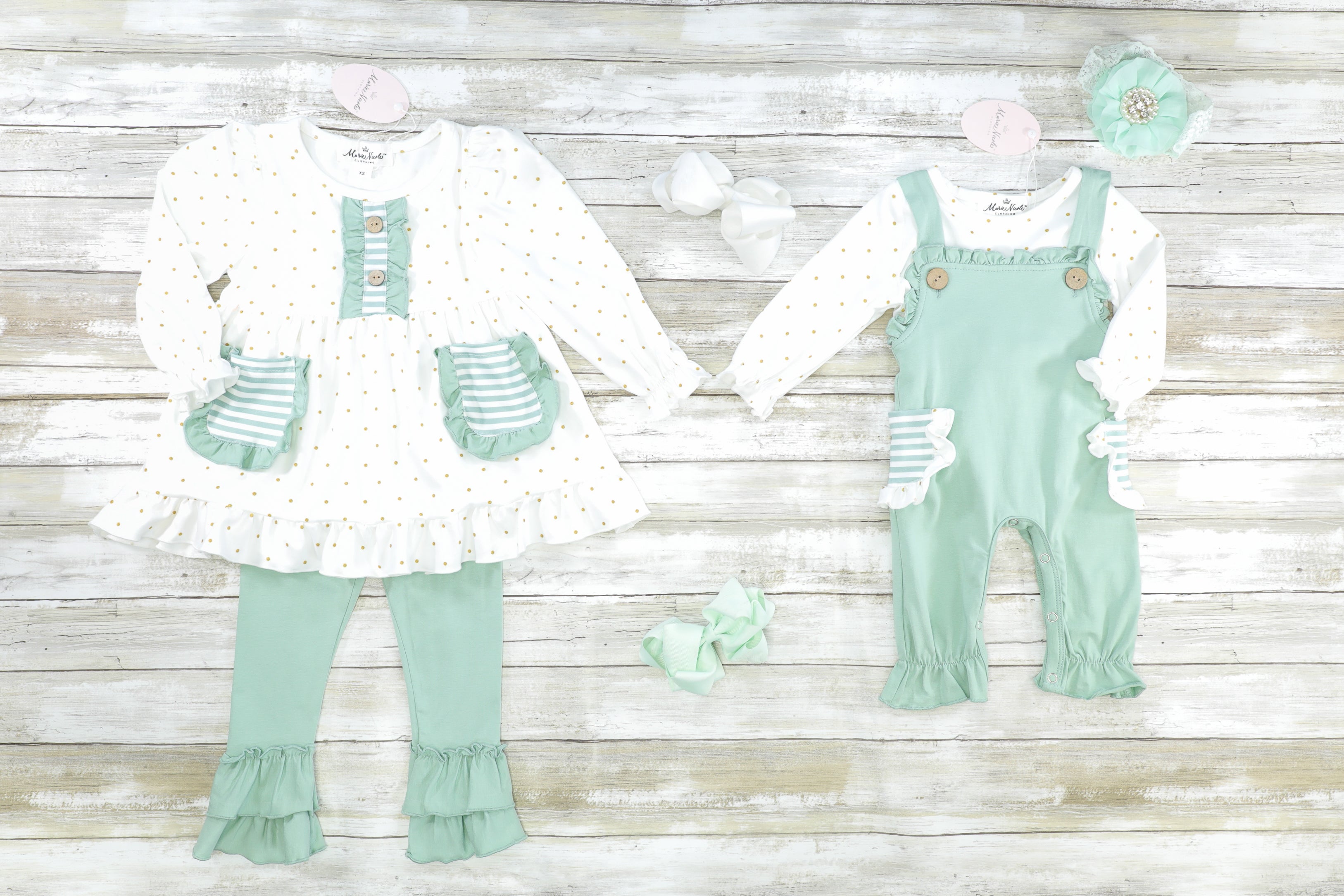 A stunning sister set that is perfect for your dainty girls! This set features a white polka dot tunic & sage overalls with striped pockets, ruffle details, and decorative buttons.