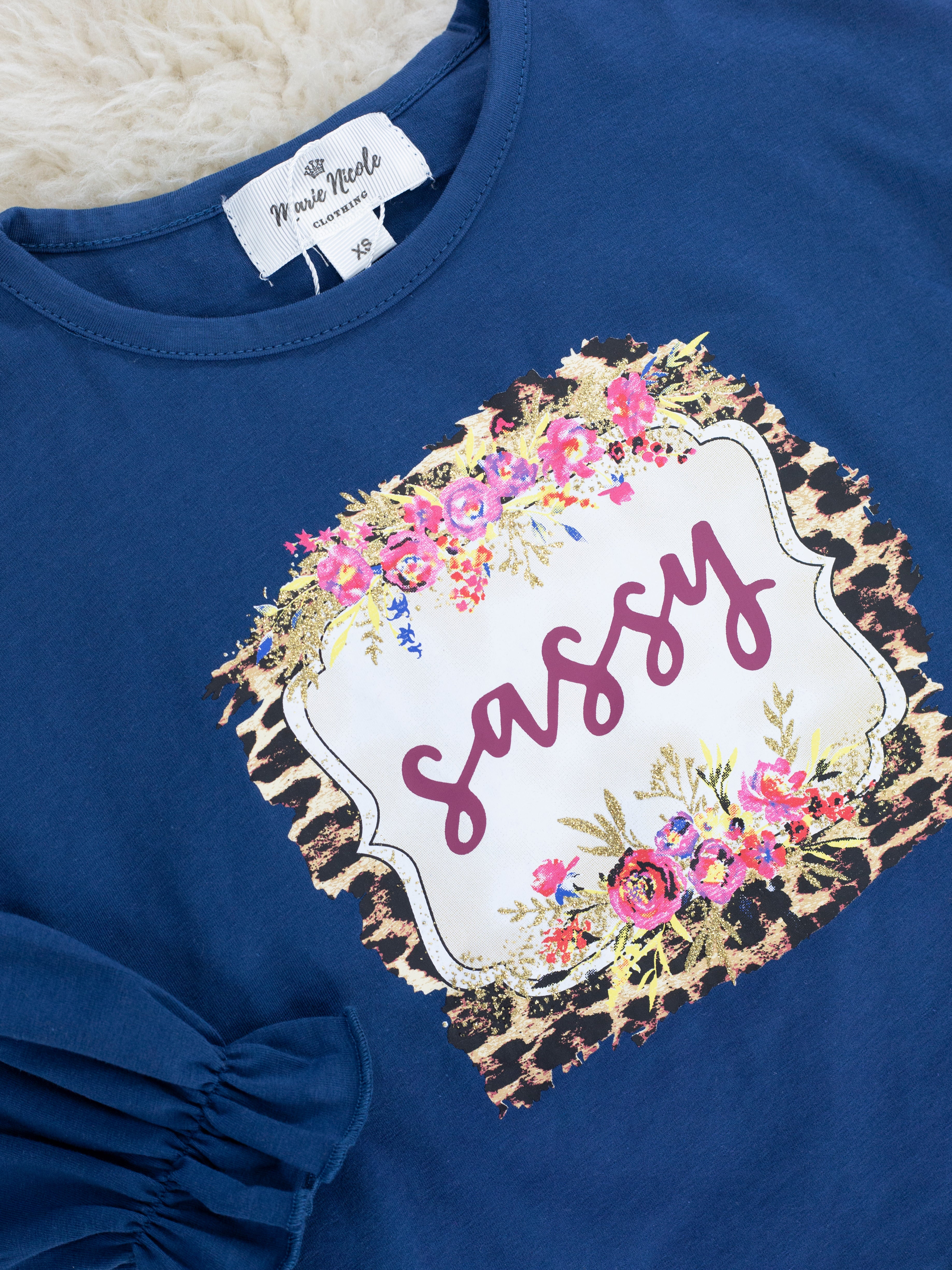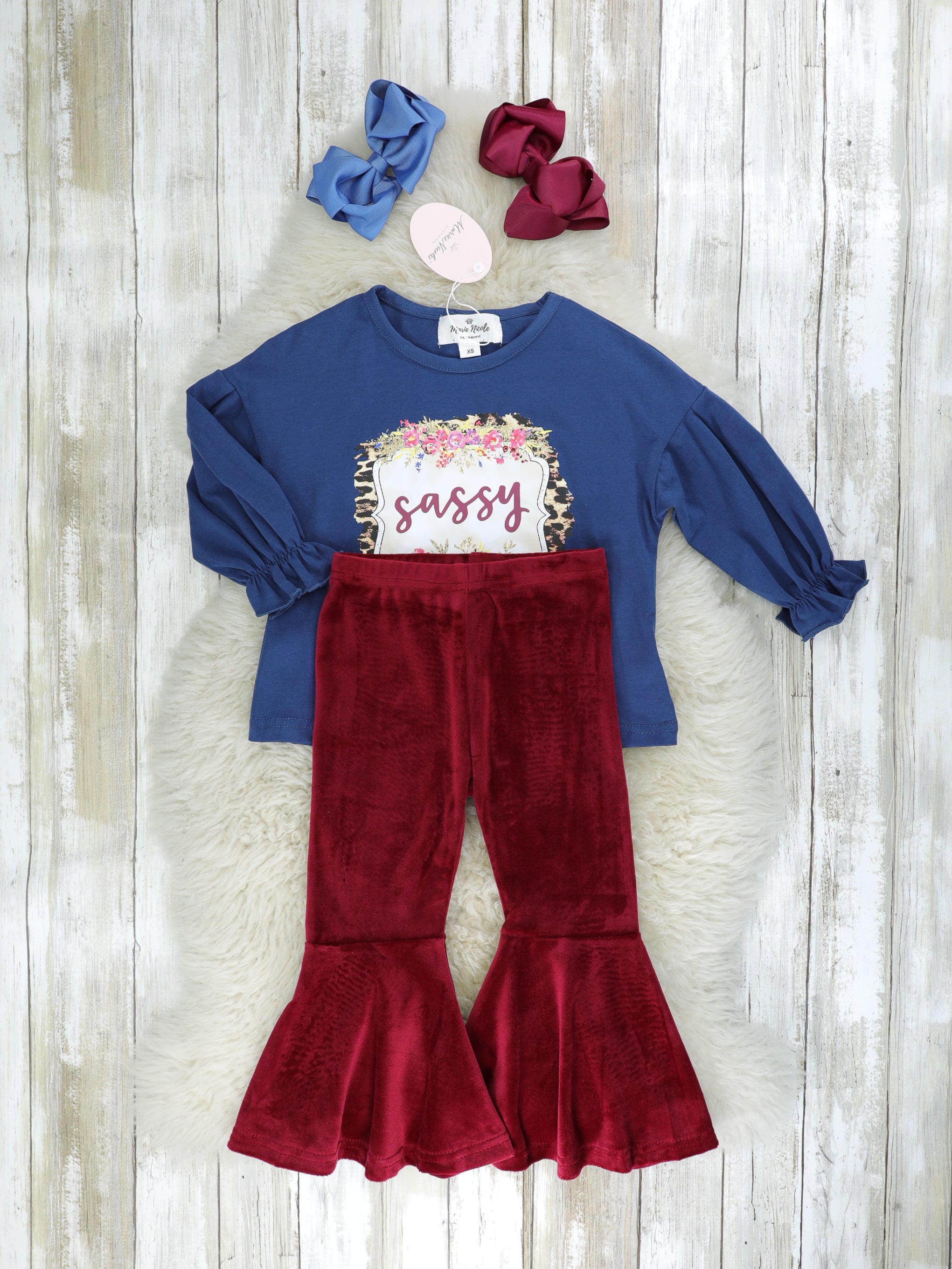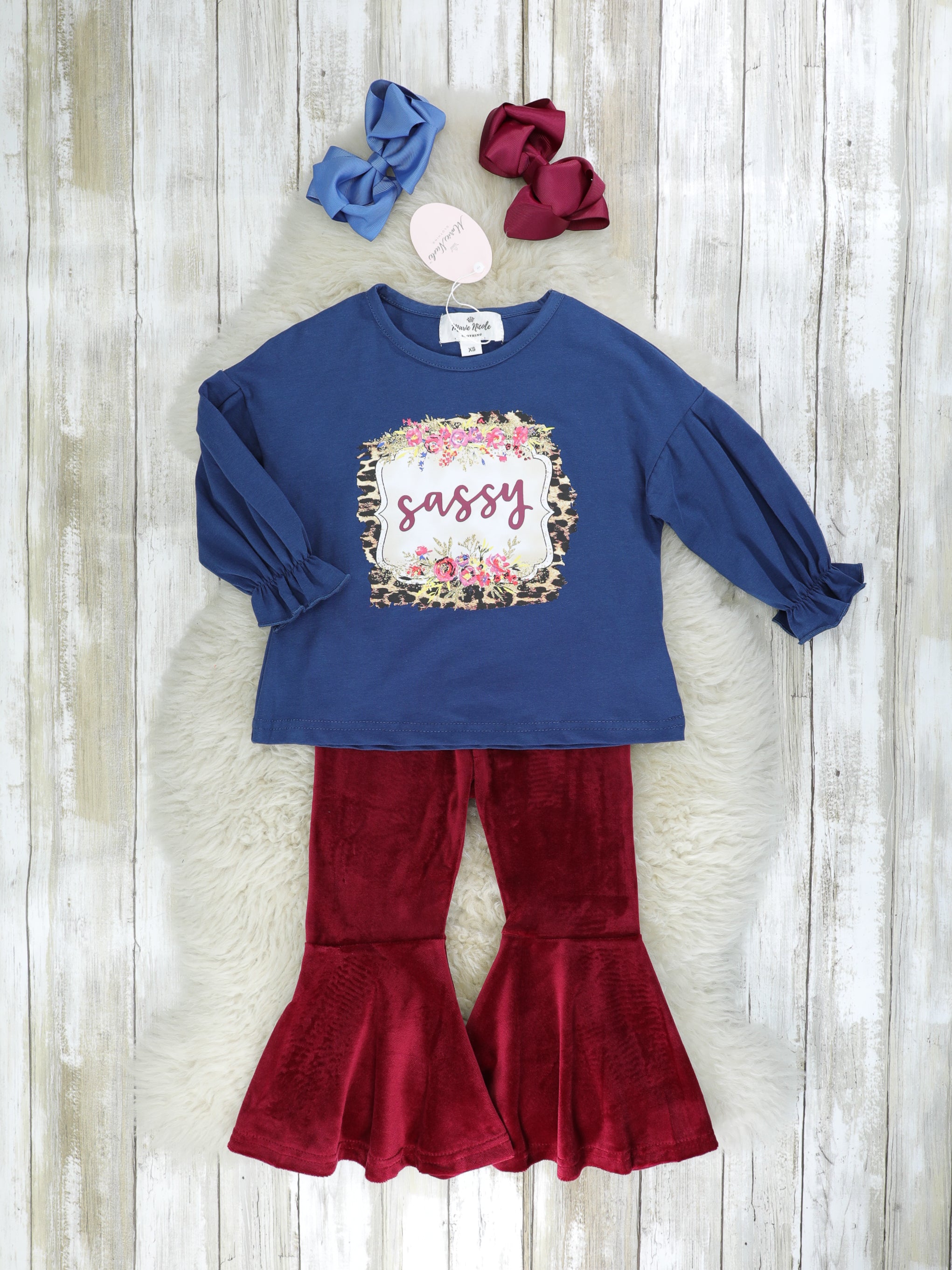 This darling outfit is perfect for your sassy girls! This outfit features a blue long sleeve with cinched wrists, a leopard "sassy" detail, & burgundy velvet bell bottoms.
