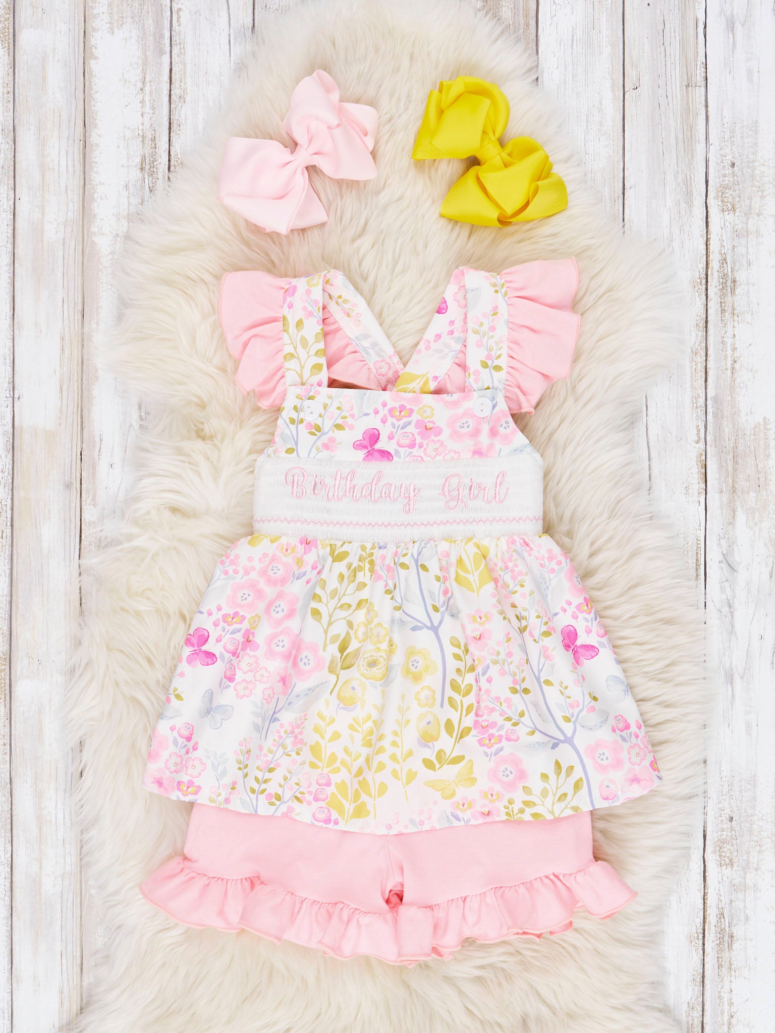 Dress up your little birthday girl in style with this adorably smocked sister set! It's the perfect way to make her day extra special, featuring a colorful floral pattern, embroidered "birthday girl" front and center, and delightful ruffles.