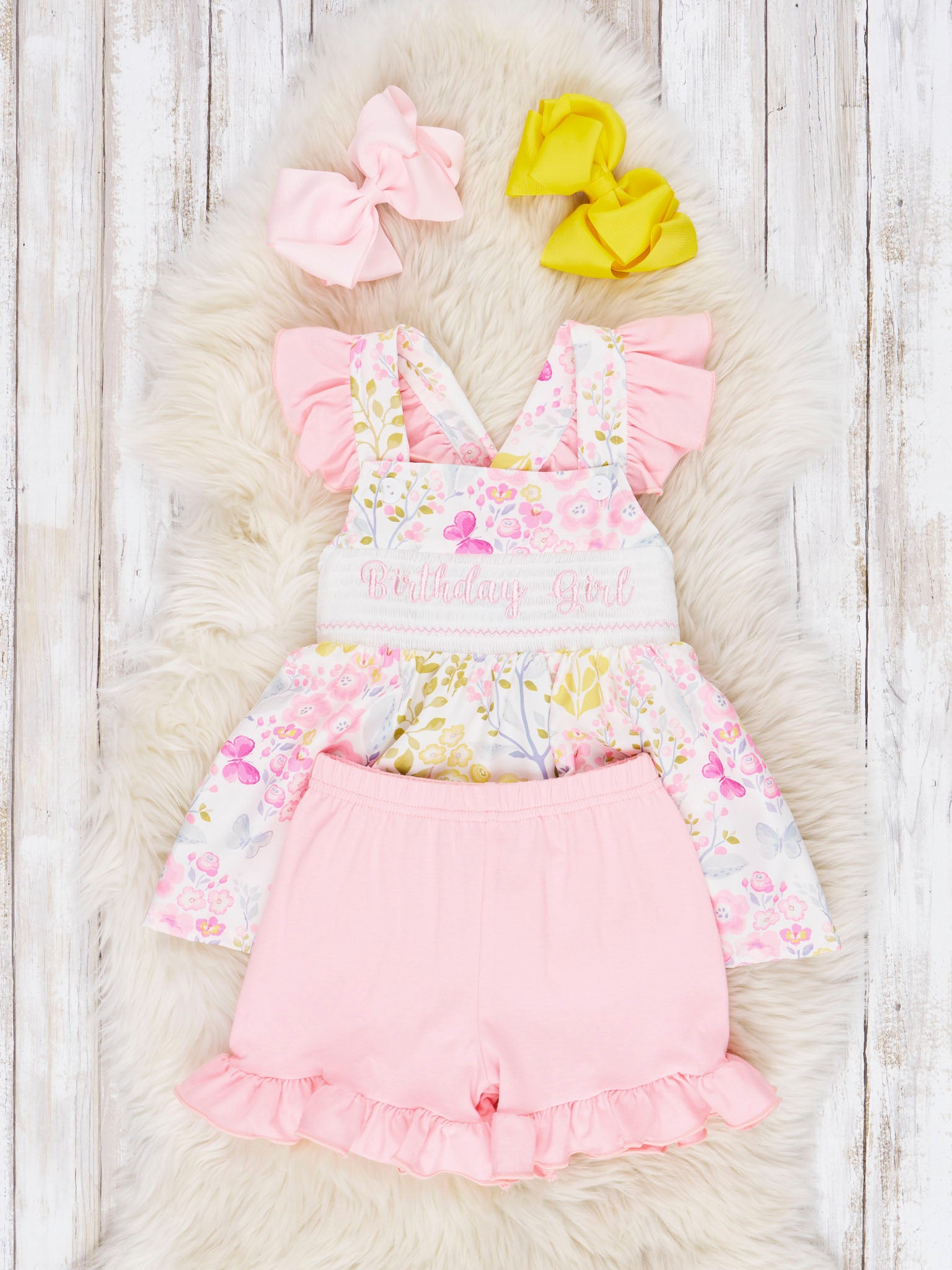 Smocked "Birthday Girl" Floral Ruffle Outfit