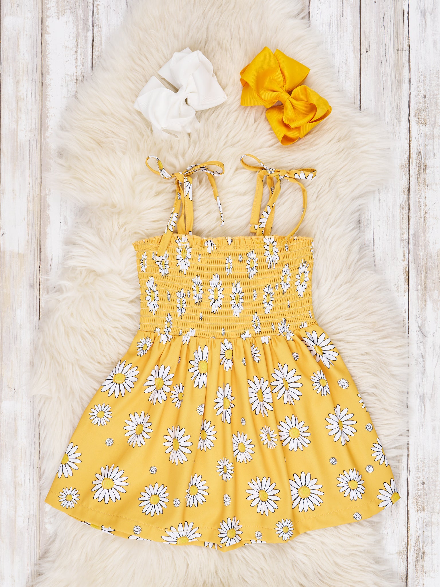 Your little fashionistas will be in style with this sister set! The smocked daisy print dress features a tie strap detail, perfect for a fun look.