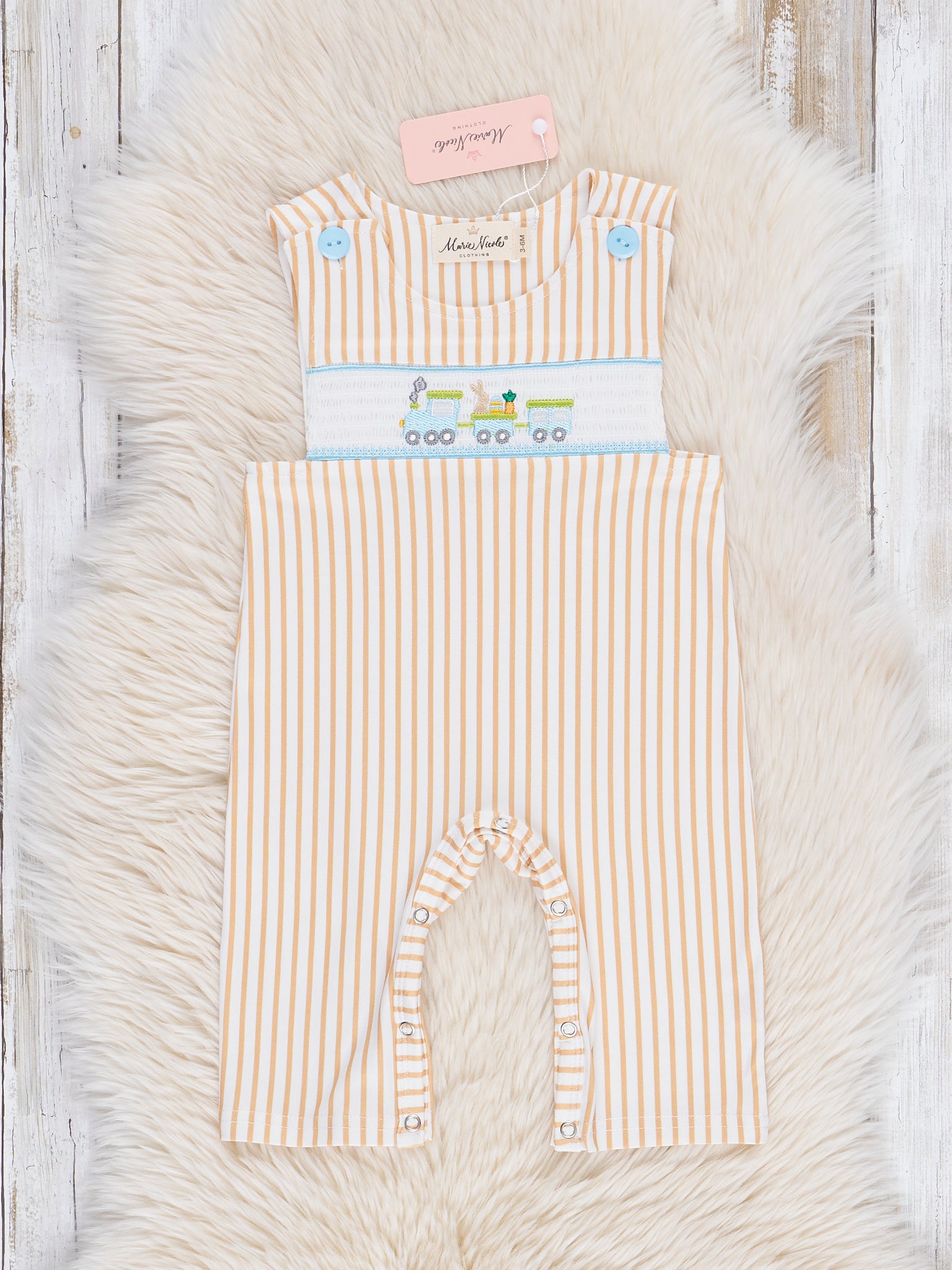 Choo-choo into Easter with this adorable matching brother set! Featuring tan stripes, detailed smocking, and an embroidered train, your little ones will be the cutest on the Easter train (literally!). Hop on board this stylish and playful ensemble by Marie Nicole Clothing. All aboard!