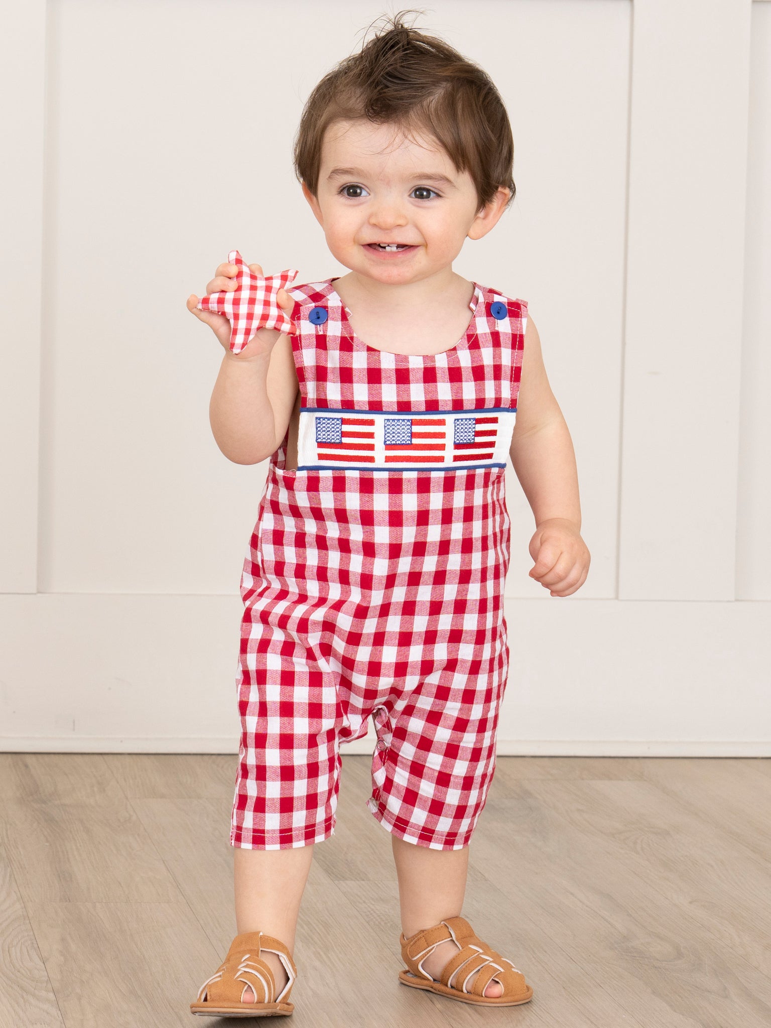 Let your kids rock the red, white, and blue in style with this smocked gingham American flag johnny! Perfect for little patriots, this sibling set by Marie Nicole Clothing is sure to turn heads with its classic gingham pattern and bold embroidered flag. Sure to provide a spark of independence and a feeling of freedom!