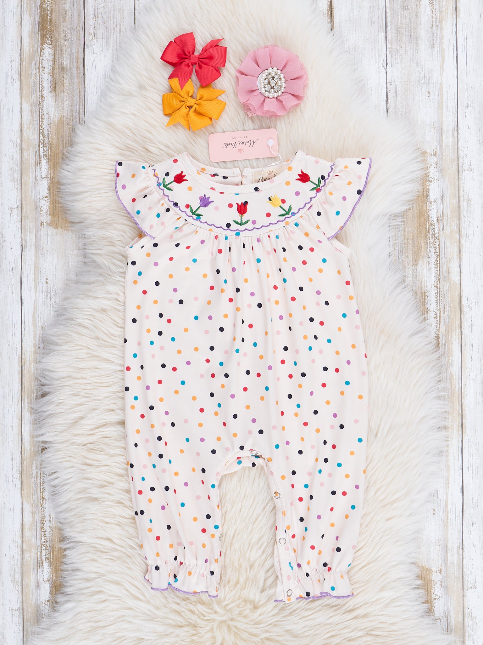 Get ready to bloom in style with this sister set! Featuring a playful smocked collar and embroidered flowers, this polka dot romper is perfect for adding a touch of whimsy to any outfit. Effortlessly elevate your look with this quirky and fun piece.