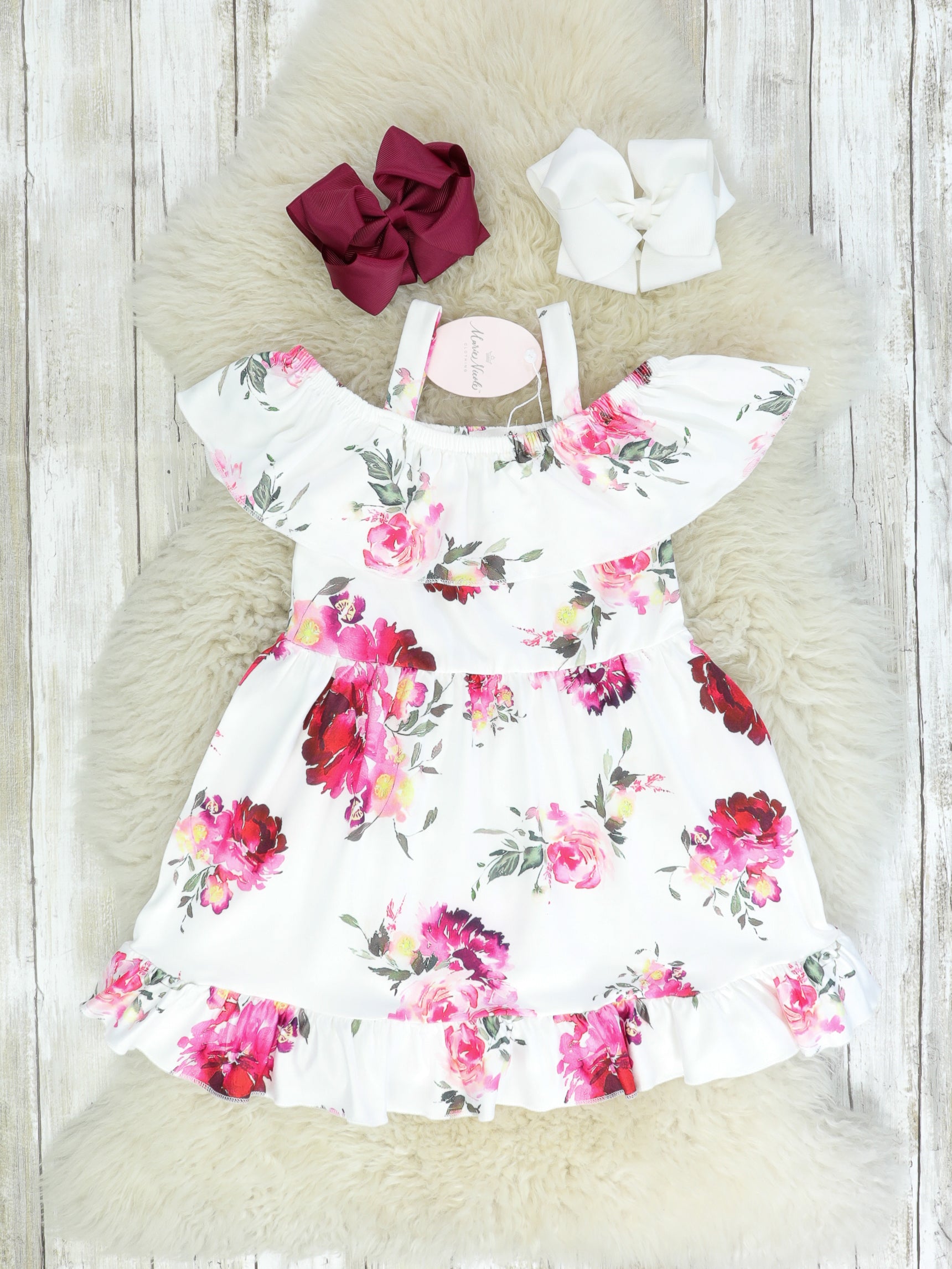This Spring floral dress is perfect for a day out with mom on a pretty day! This white dress features an off-the-shoulder detail, ruffles, and a pink and red floral detail.
