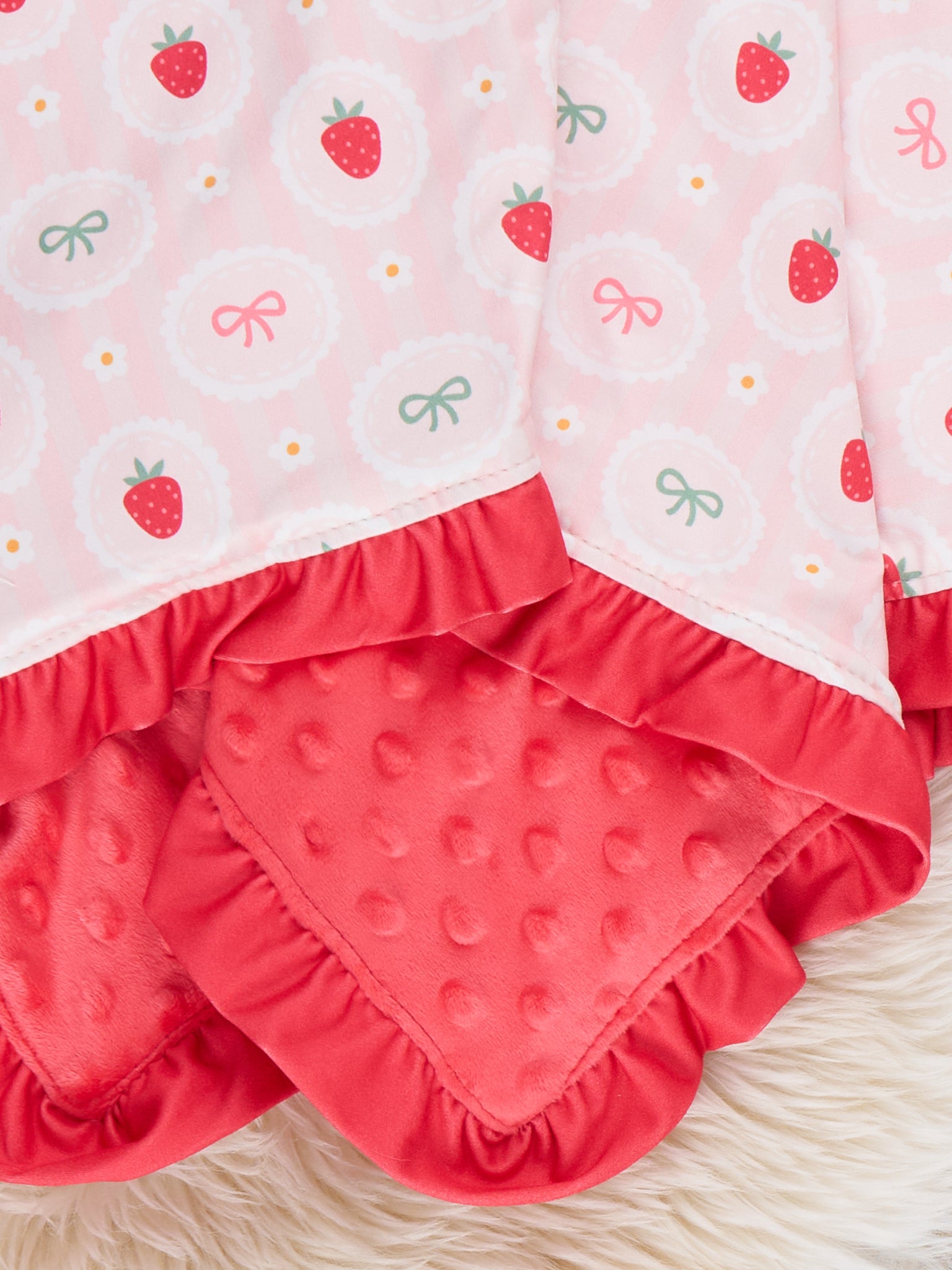 The Strawberry Dreams Blanket by Marie Nicole Clothing wraps little ones in berry-sweet comfort, featuring a playful strawberry print backed with ultra-soft, textured fabric. Ruffled edging adds a touch of boutique charm, making this blanket perfect for stroller rides, tummy time, nursery décor, or cozy cuddles during storytime and naps.