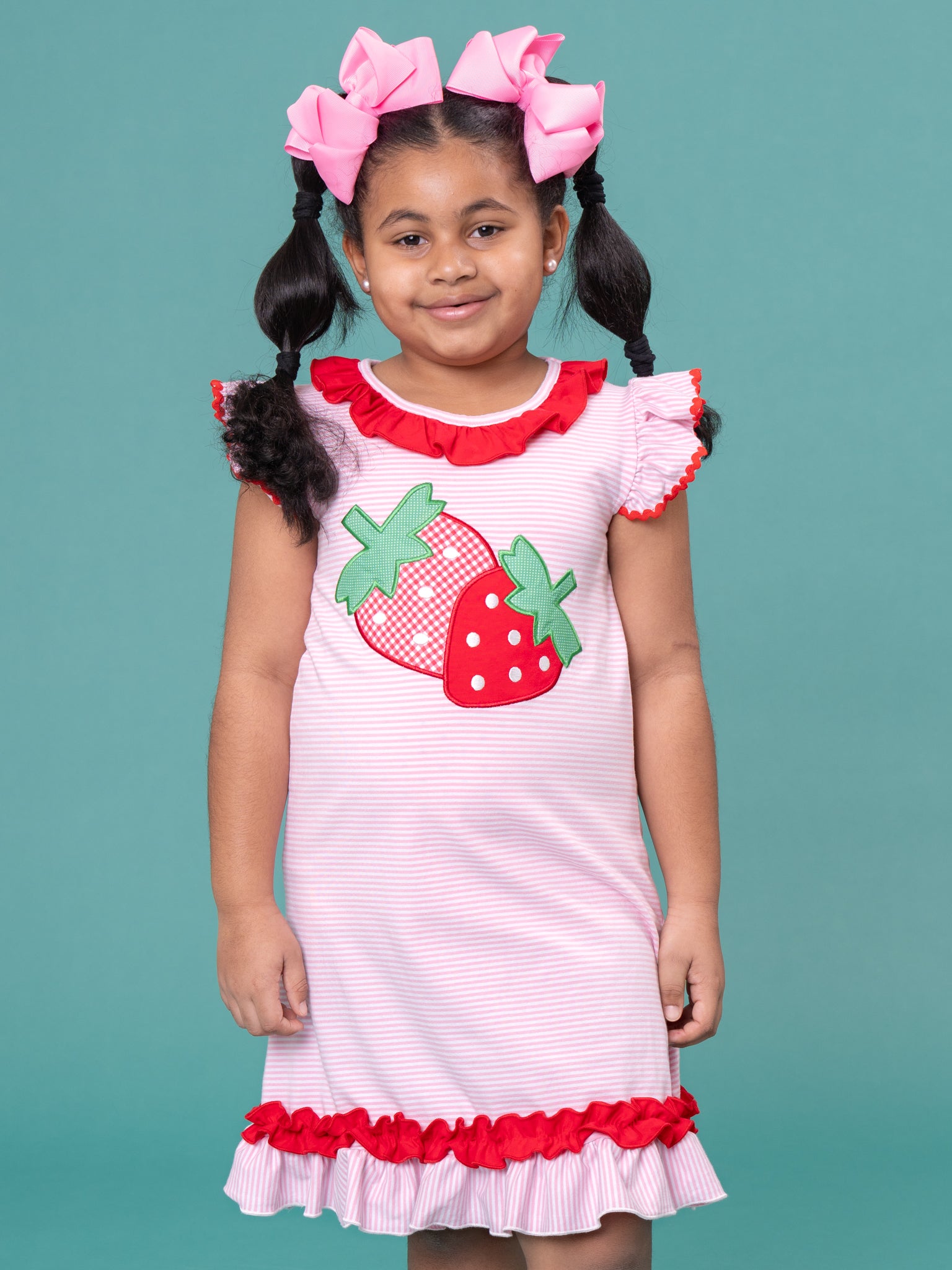 The Strawberry Twins Striped Embroidered Cotton Ruffle Dress by Marie Nicole Clothing doubles the sweetness with twin strawberry appliqués on a soft stripe peplum dress trimmed in playful ruffles. comfy, stretchy fabric make this dress perfect for warm-weather playdates, parties, and picture-ready berry-cute days.