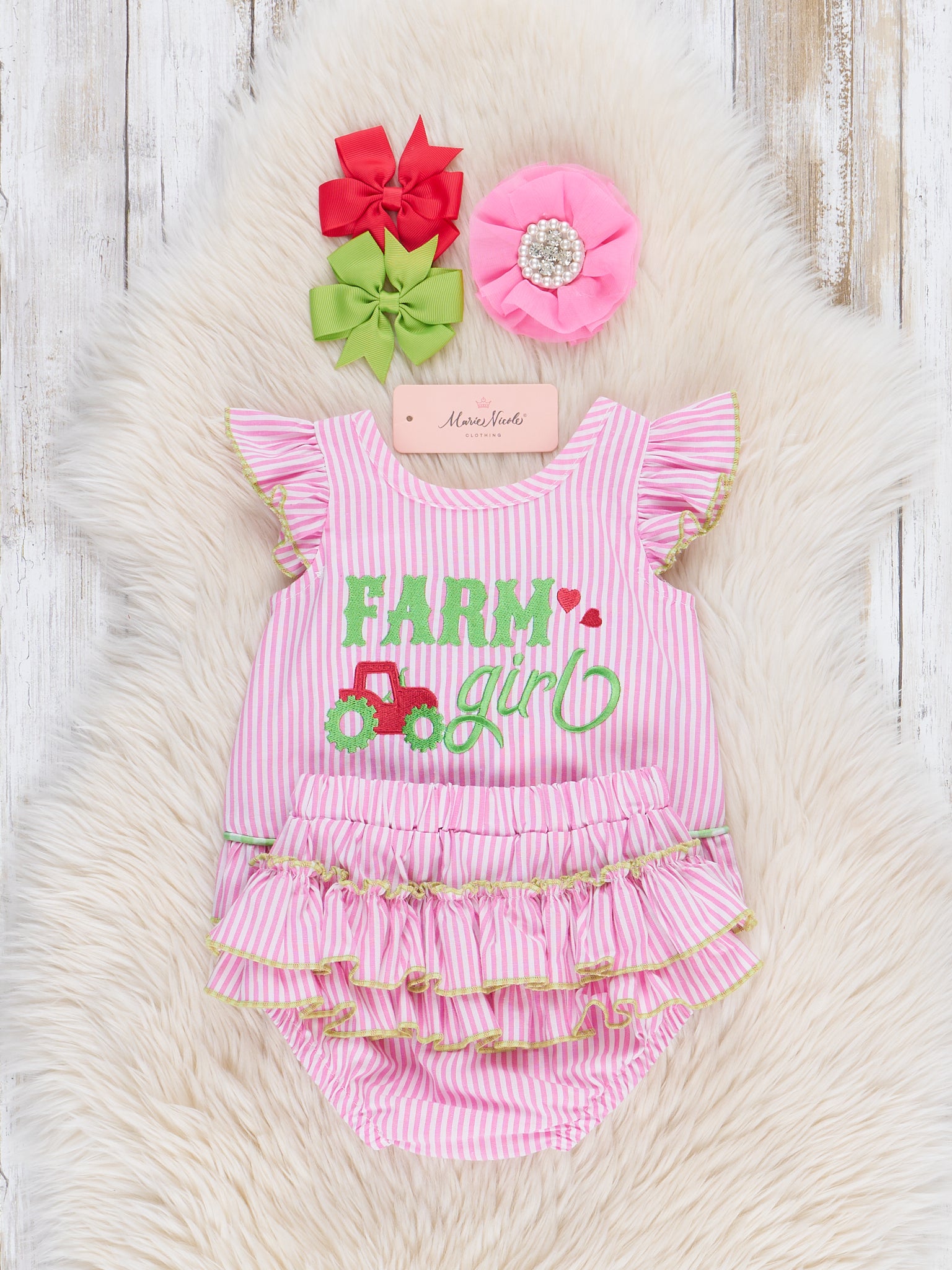 Get ready to play on the farm with this Striped Farm Girl Embroidered Bloomers Outfit. The pink stripes and flutter sleeves add a playful touch to this adorable sister set. The embroidered Farm Girl and tractor add a fun twist, while the ruffle hem top and bottom bloomers add a cute and frilly touch. By Marie Nicole Clothing.
