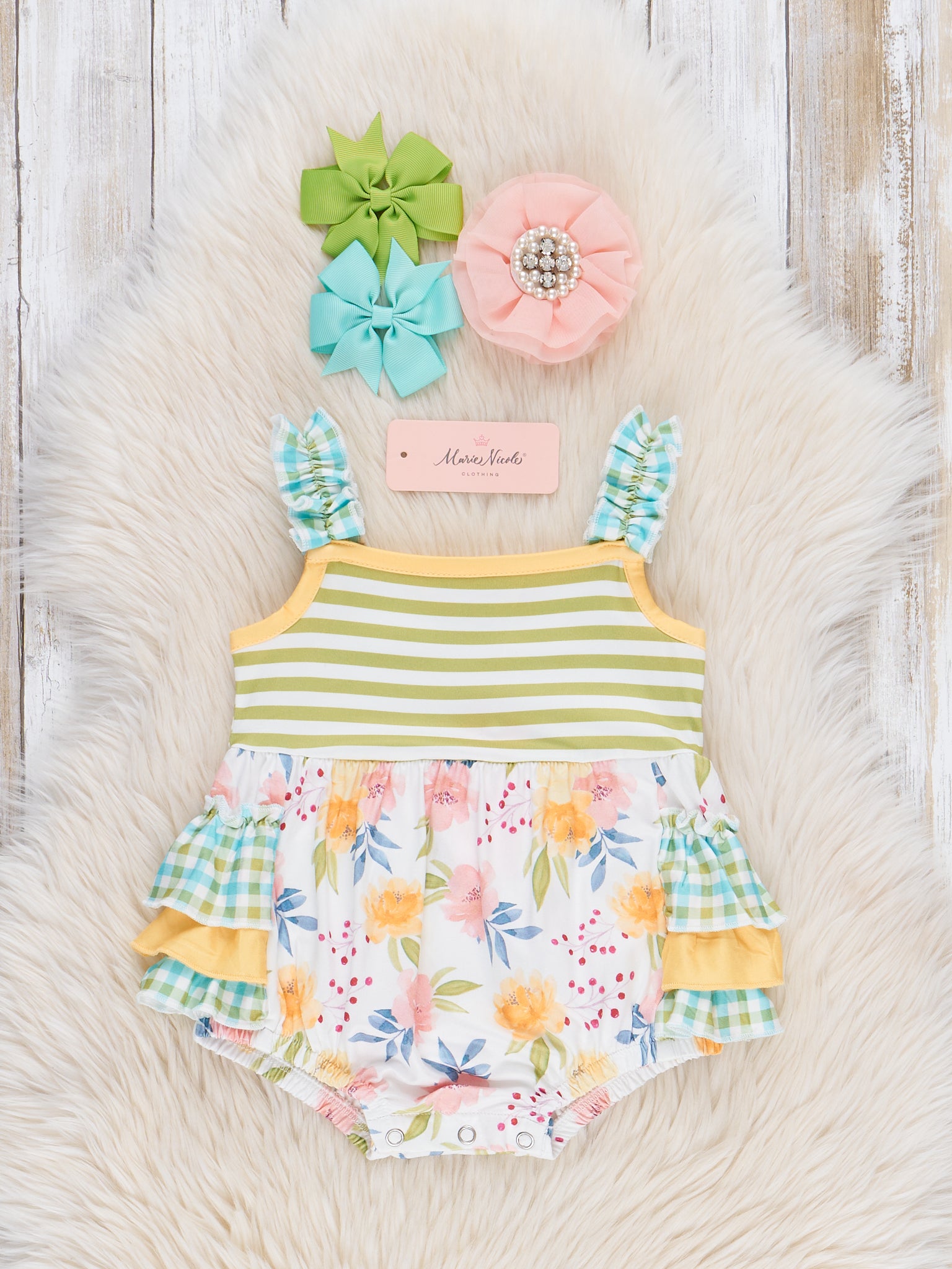 The Striped Hibiscus Garden Ruffle Bubble is a fresh and feminine look that’s perfect for spring and summer days. Featuring soft stripes paired with a beautiful hibiscus floral print, this bubble from Marie Nicole Clothing is finished with delicate ruffle details for an extra touch of sweetness. Lightweight and comfortable, it's ideal for playdates, picnics, or any day your little one wants to bloom in style.