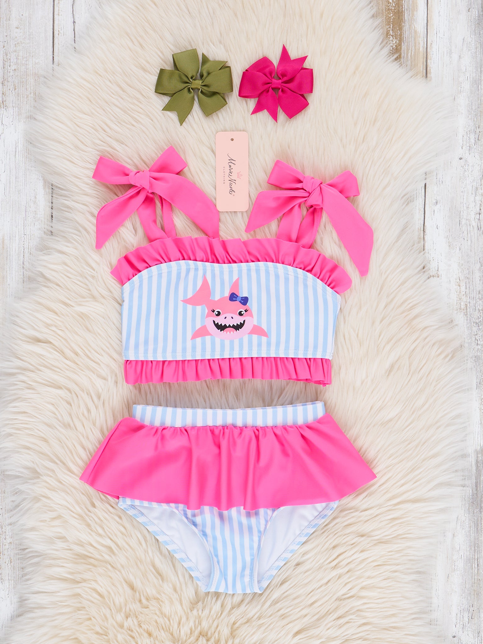 Make a splash at the beach this summer with our Striped Shark Attack Swim Ruffle Swimsuit! This girls two piece swimsuit features playful blue stripes, a pink ruffle trim, and adorable bow accents. The blue striped high waist peplum bottoms add an extra touch of cuteness. Perfect for a sibling set, this suit is sure to make a statement. By Marie Nicole Clothing.