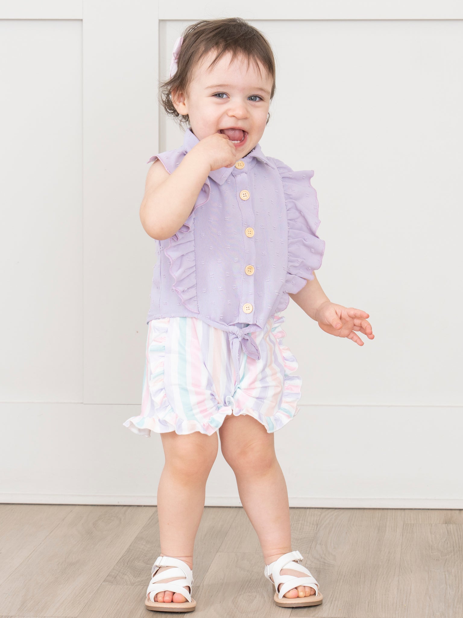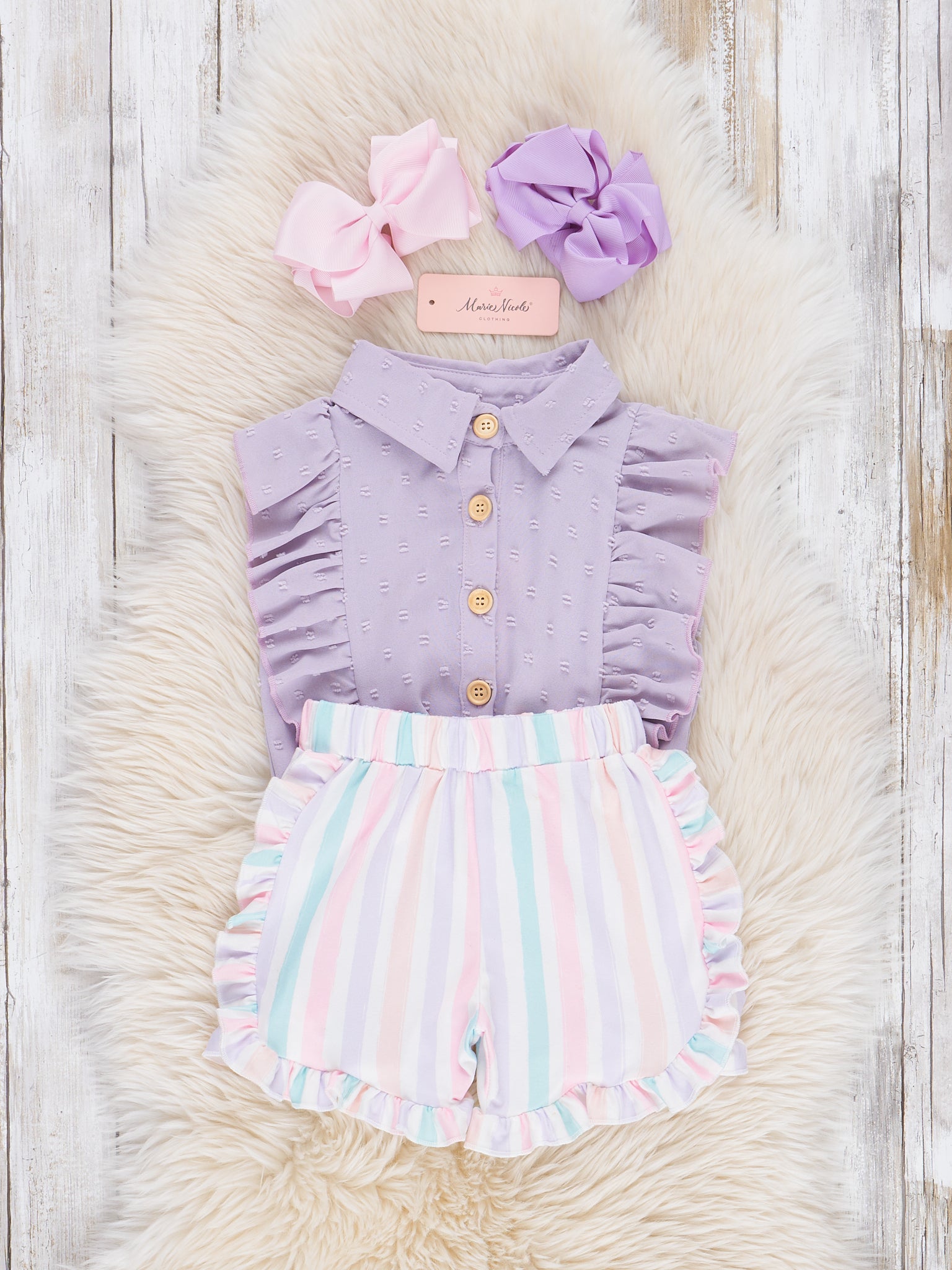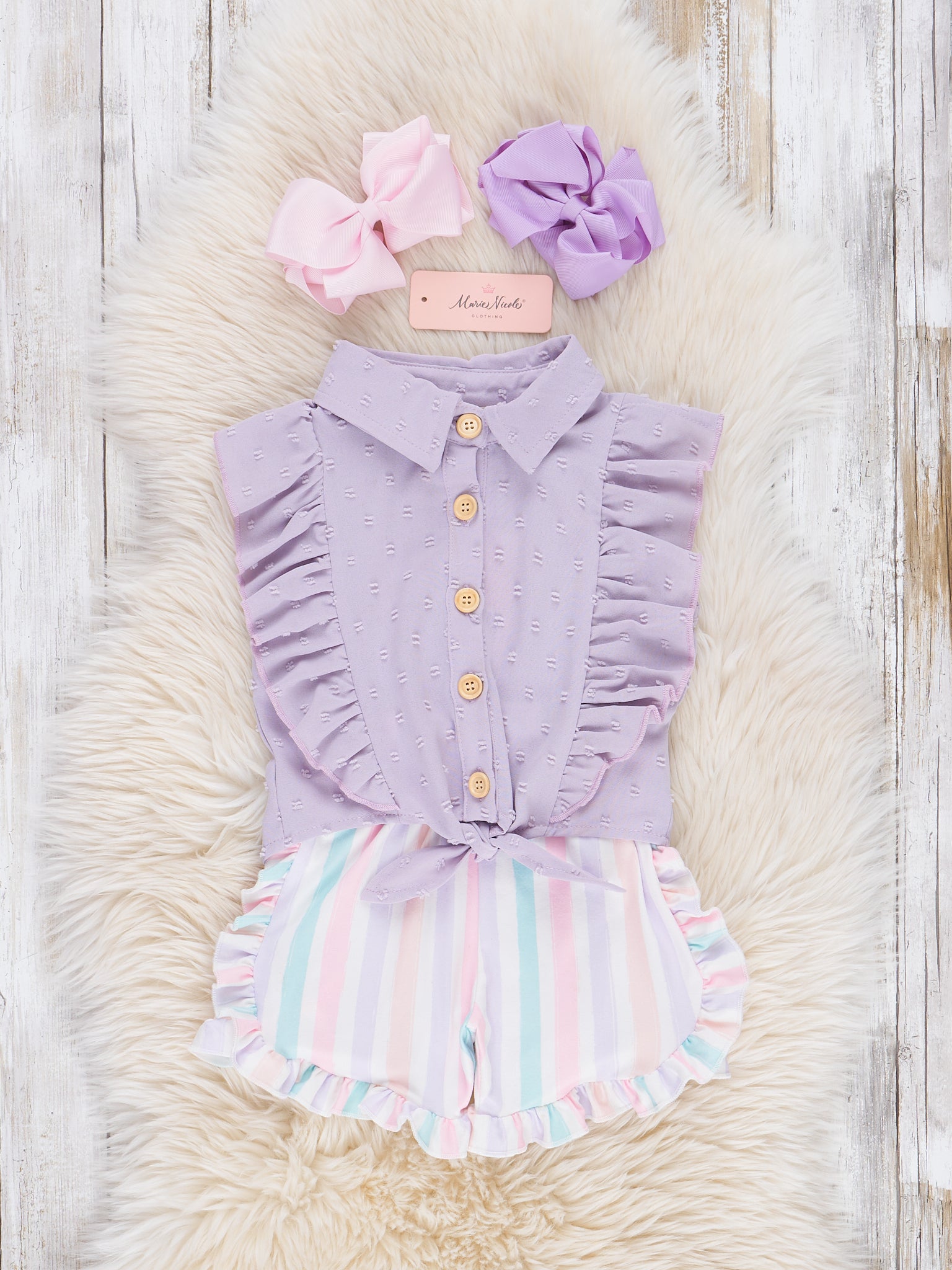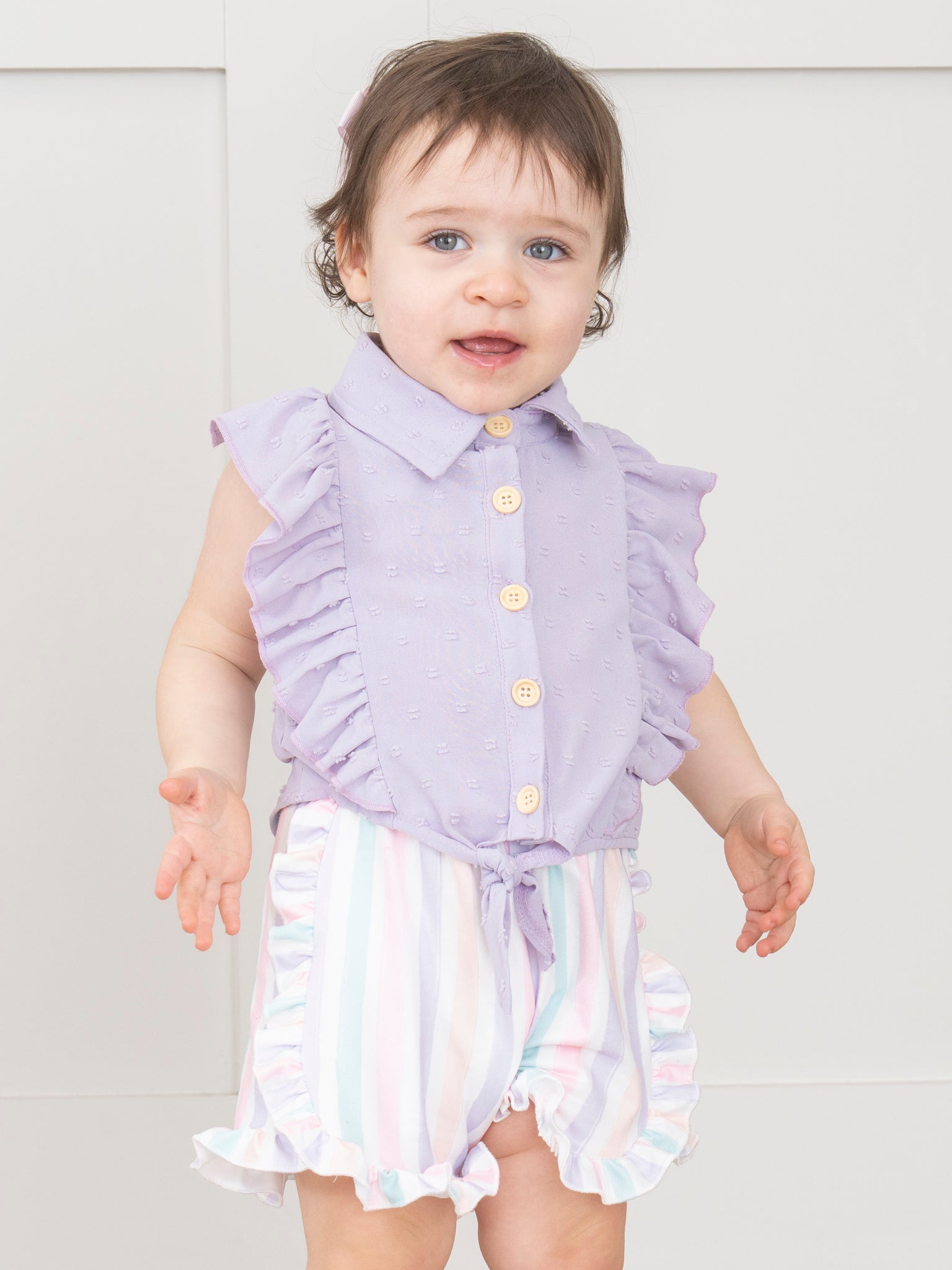 Get ready for some serious summer style with this girls' lilac outfit from Marie Nicole Clothing. The sleeveless button up top features a fun ruffle detail, while the striped ruffle shorts add an extra touch of flair. Stay cool, comfortable, and stylish all season long!