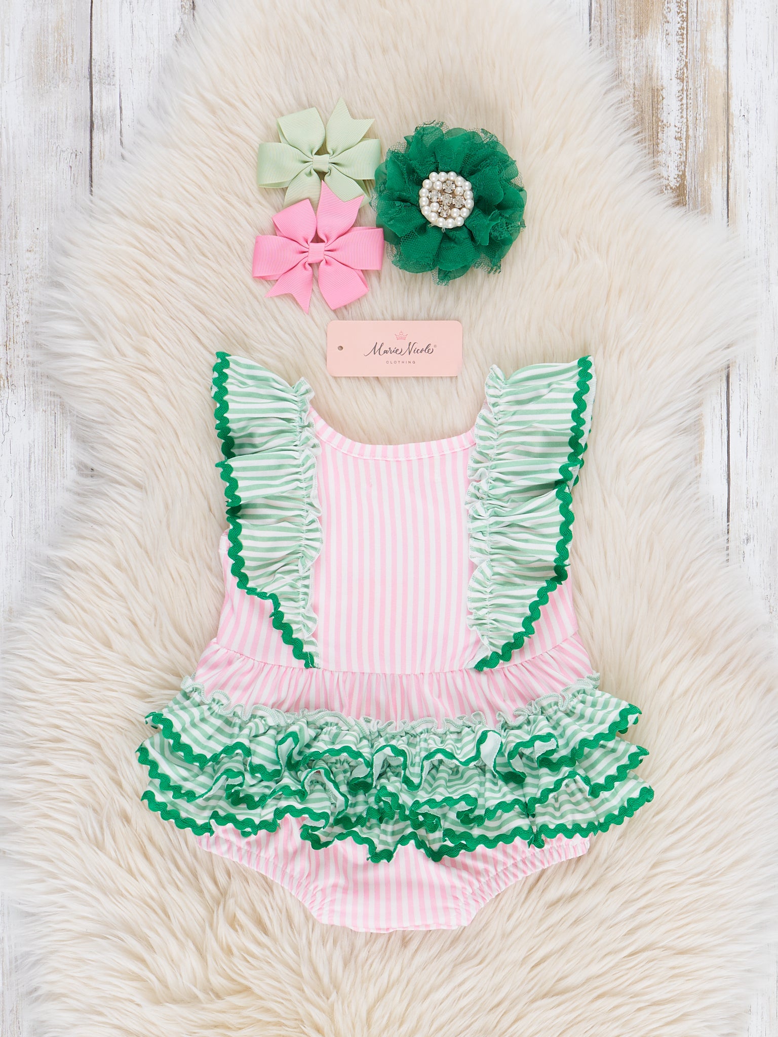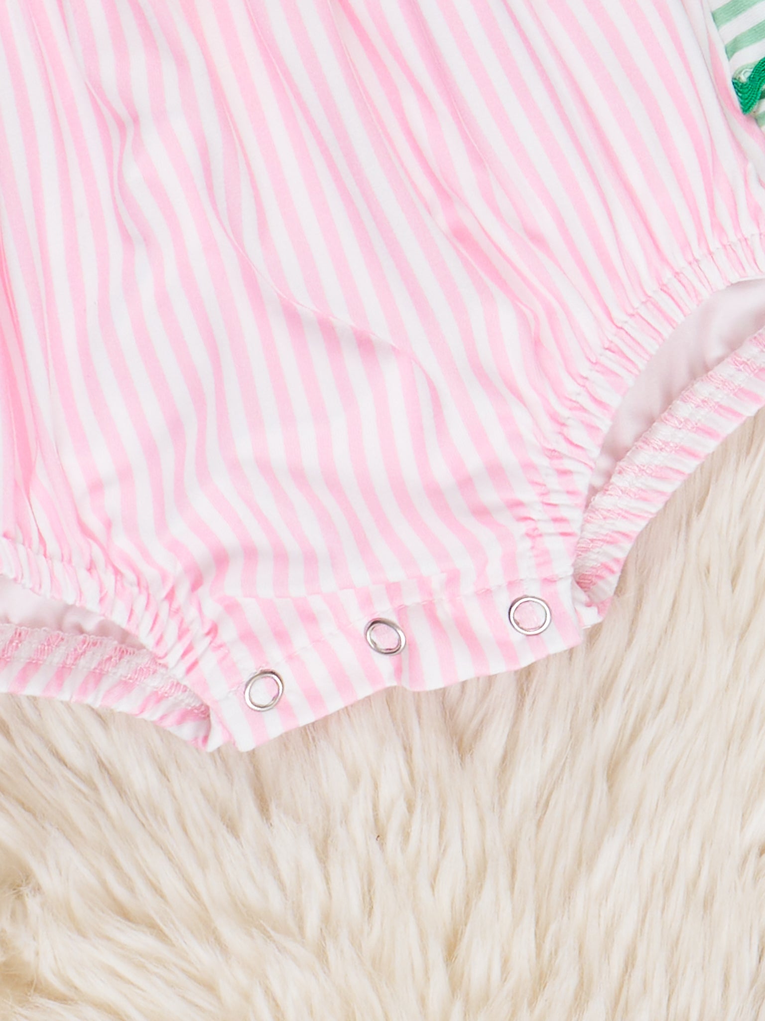 Add some whimsy to your little one's wardrobe with our Striped Watermelon Pop Ruffle Bubble. Made from soft and breathable cotton, this girls bubble features a playful pink stripe pattern and a fun green stripe ruffle sleeve detail. Embroidered with a cute watermelon pop, it's the perfect addition to our sister set from Marie Nicole Clothing.