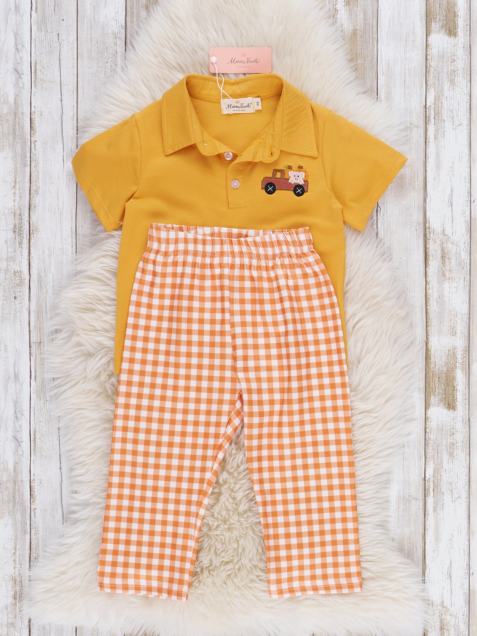 Shine bright with the Sunshine Pumpkin Embroidered Plaid Outfit by Marie Nicole Clothing! The polo top is embroidered with a truck, pumpkins, and adorable piggy, and the pants are a classy gingham. Crafted with soft fabric, this two-piece set will bring your little boy sunny fall cheer to every day!