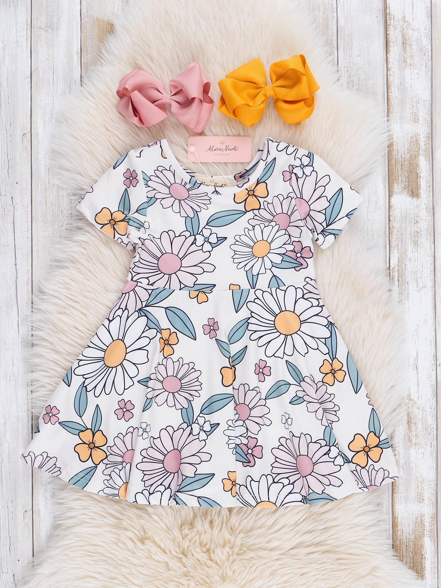 This girls dress features a classic swing silhouette adorned with a playful daisy garden print. Swing into style with this must-have dress!