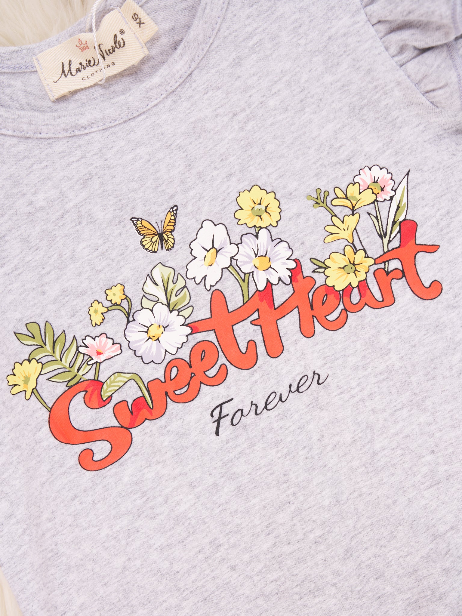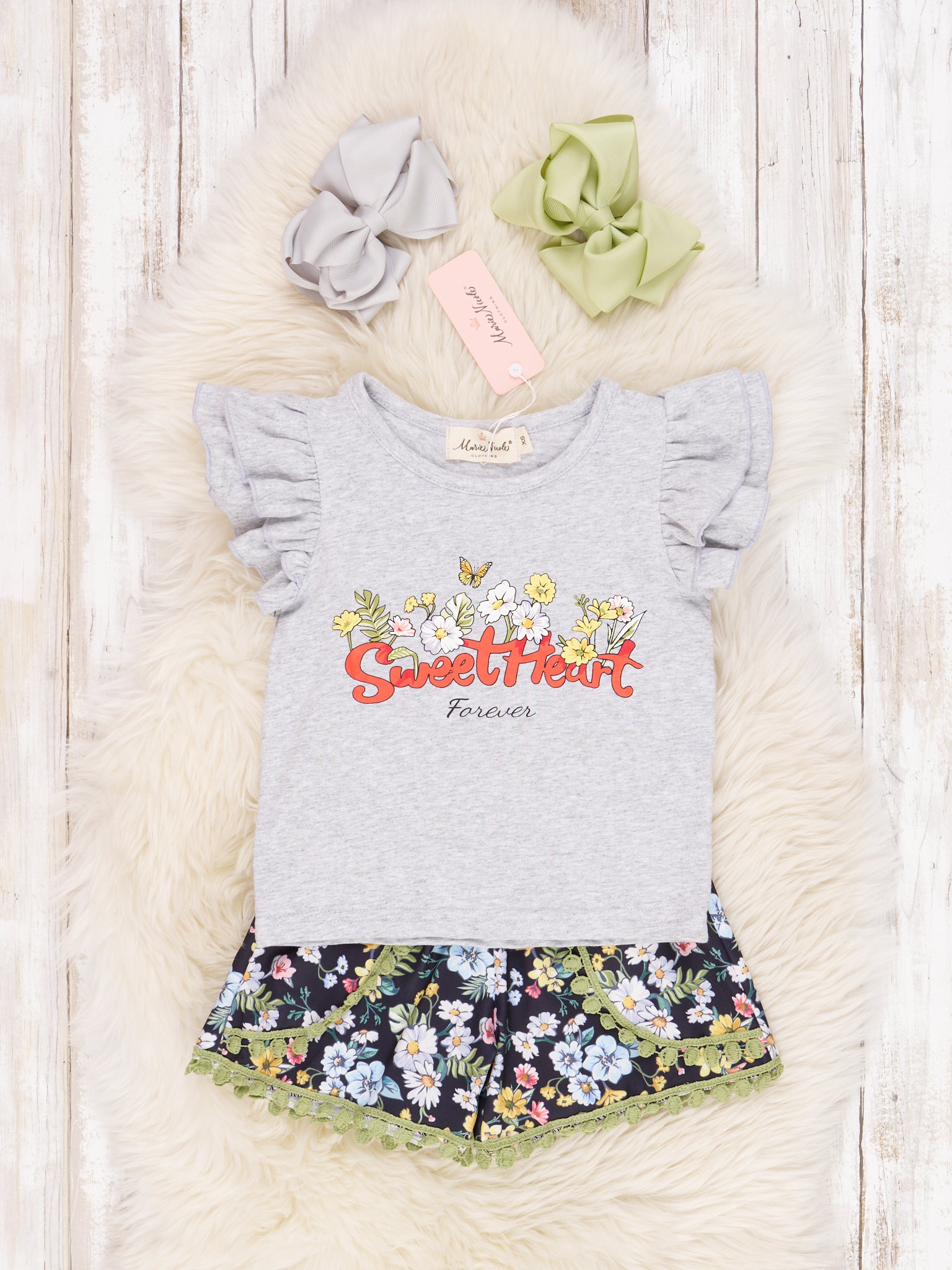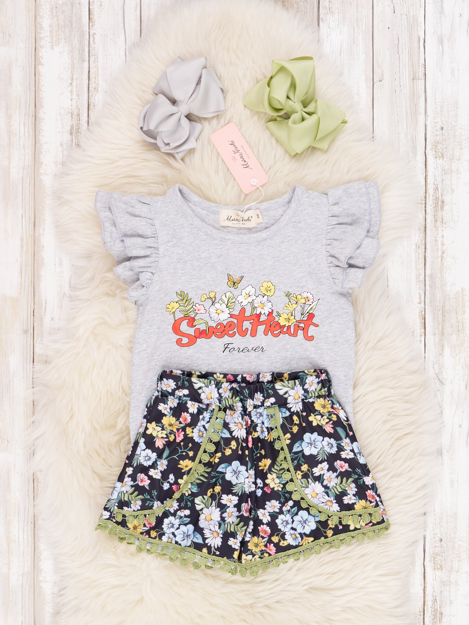 She'll shine from neck to knees in this oh-so-sweet "Sweet Heart" outfit! With a grey top featuring ruffle sleeves and a “Sweet heart forever” slogan, plus floral shorts with an elastic waistband, it's just the dazzler your kiddo needs to stand out in style.