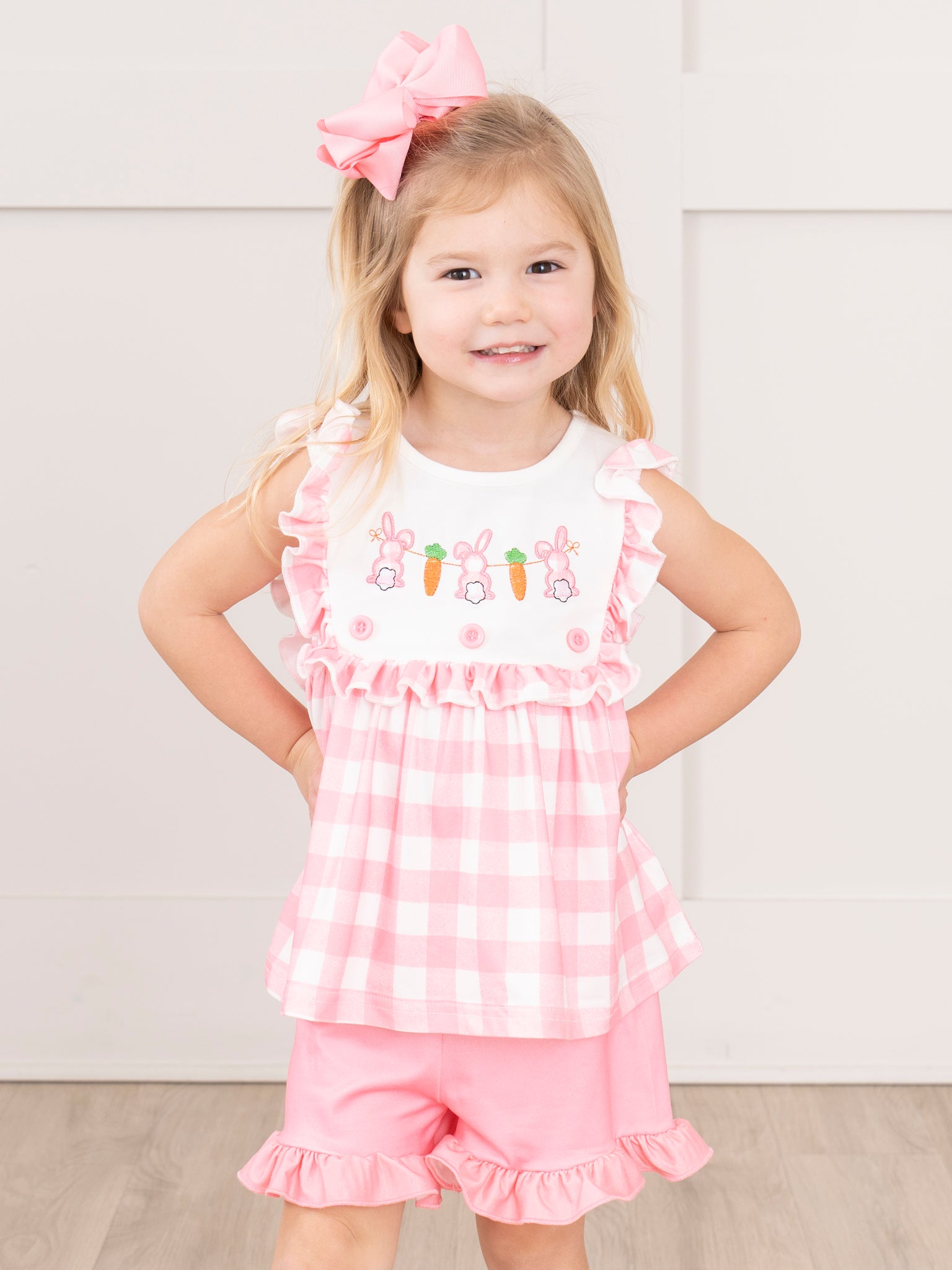 Your sweet bunnies will feel pretty in pink in this sister set by Marie Nicole Clothing! This sweet pink outfit features gingham, decorative buttons, a bib collar, embroidered bunnies with carrots, ruffles, & pink ruffle shorts with an elastic waistband.