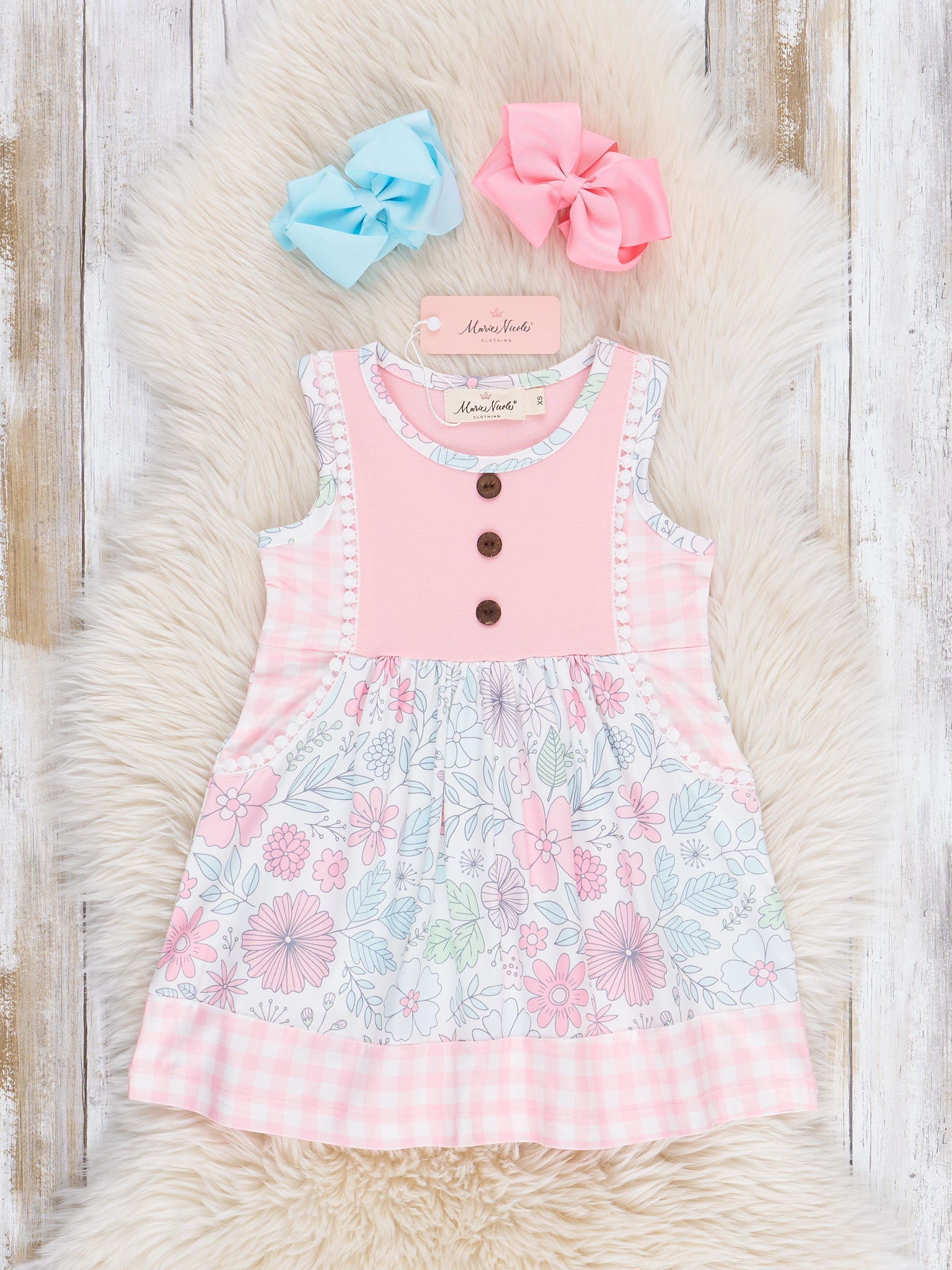 Get ready for spring with our Sweet Pink Wildflowers Gingham Dress! This playful dress features a pink gingham detail and a charming wildflower design. Perfect for twirling, it also has pockets for storing little treasures. Coordinate with our sister set from Marie Nicole Clothing. Bring some flower power to your little one's wardrobe!