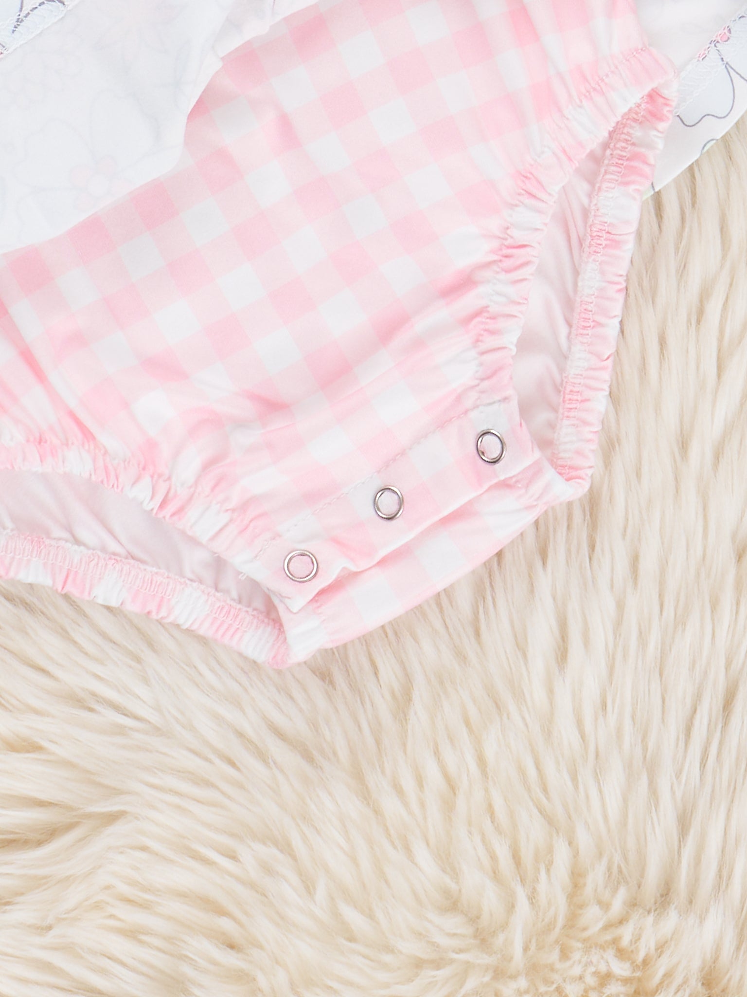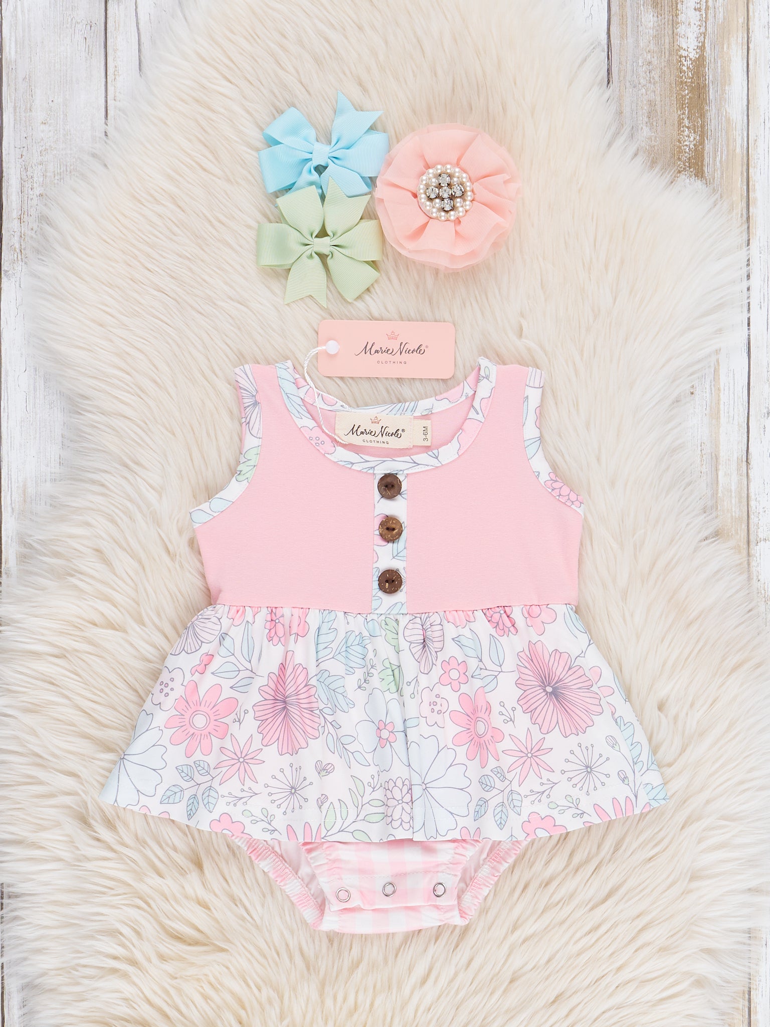 Get ready for spring with our Sweet Pink Wildflowers Gingham Peplum Bubble! This playful bubble features a pink bodice with gingham detail and a charming wildflower peplum design. Coordinate with our sister set from Marie Nicole Clothing. Bring some flower power to your little one's wardrobe!