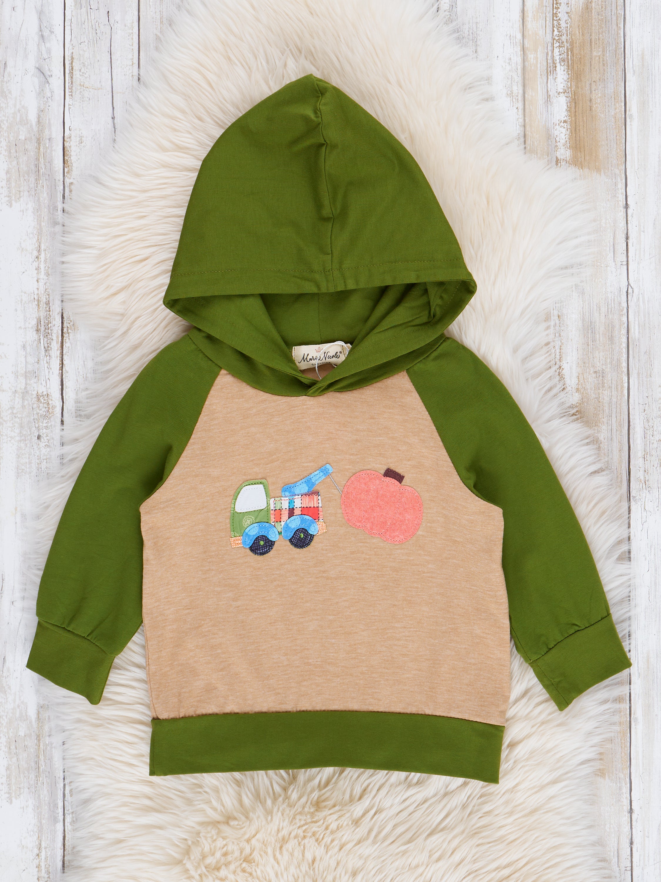 Experience the perfect blend of style and comfort with our Tan & Green Pumpkin Picker Hoodie. This boys hoodie features trendy green raglan sleeves  adorned with a fun pumpkin picker design. Complete the look with our brother set for double the cuteness!
