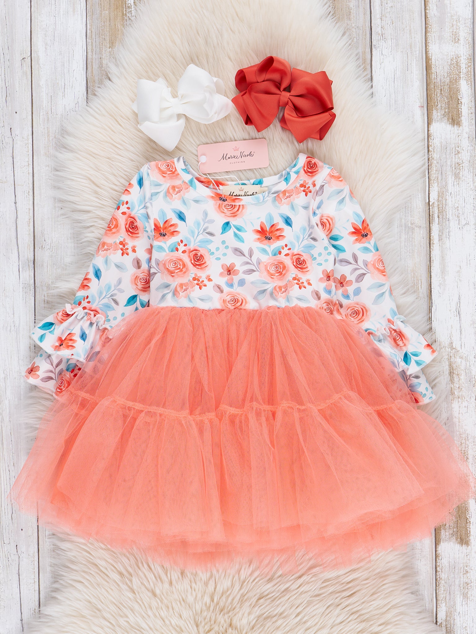 Sprinkle some sunshine into her wardrobe with our Tangerine Blooms Tulle Dress! This girls dress boasts a floral bodice, accented with playful ruffle sleeves, and a bold tangerine tulle skirt. An irresistible combination of sweet and sassy--just like her!