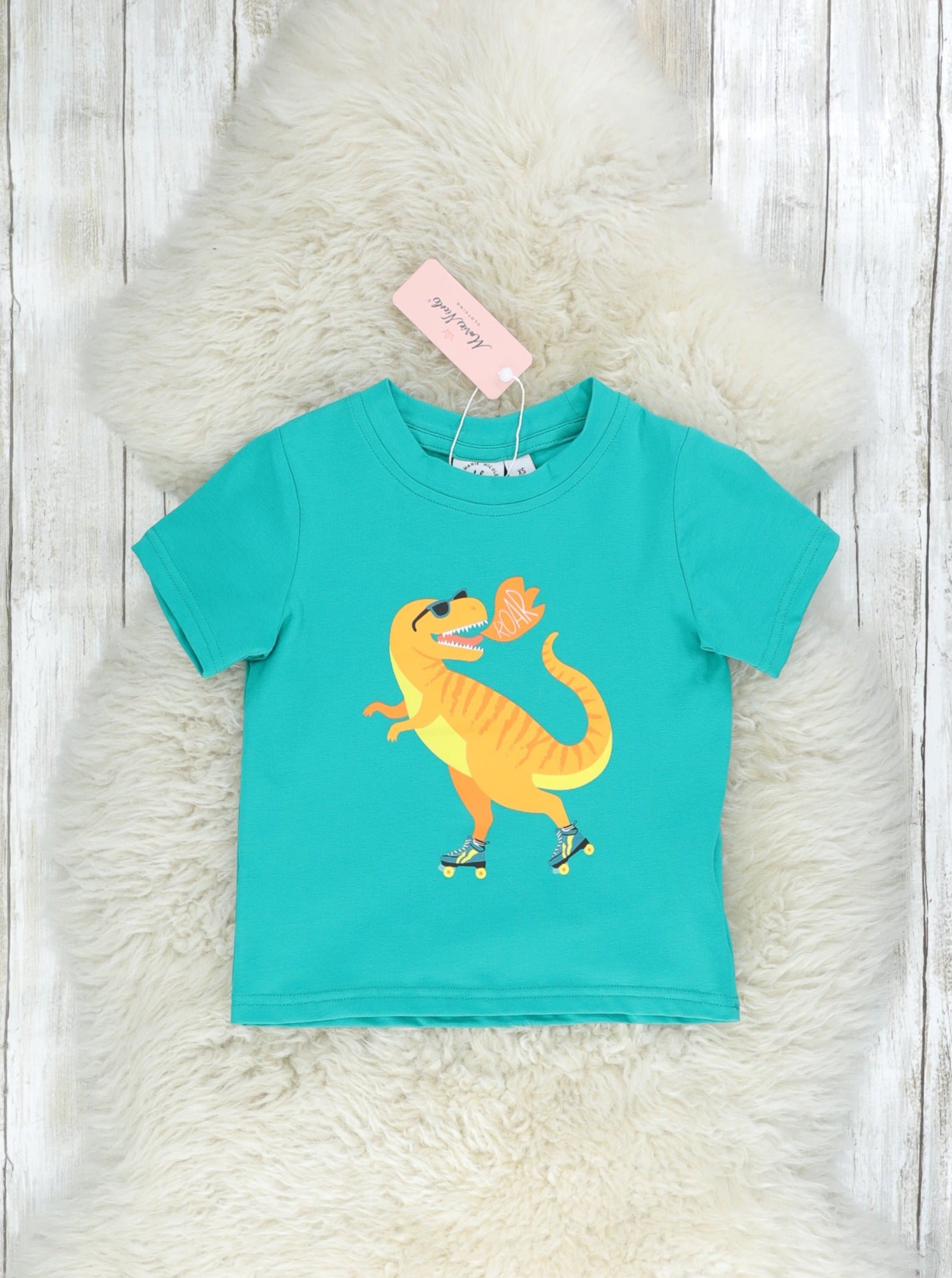 This adorable brother set is RAWRdiculously perfect! This teal shirt features a T-Rex on roller skates with a fiery roar.