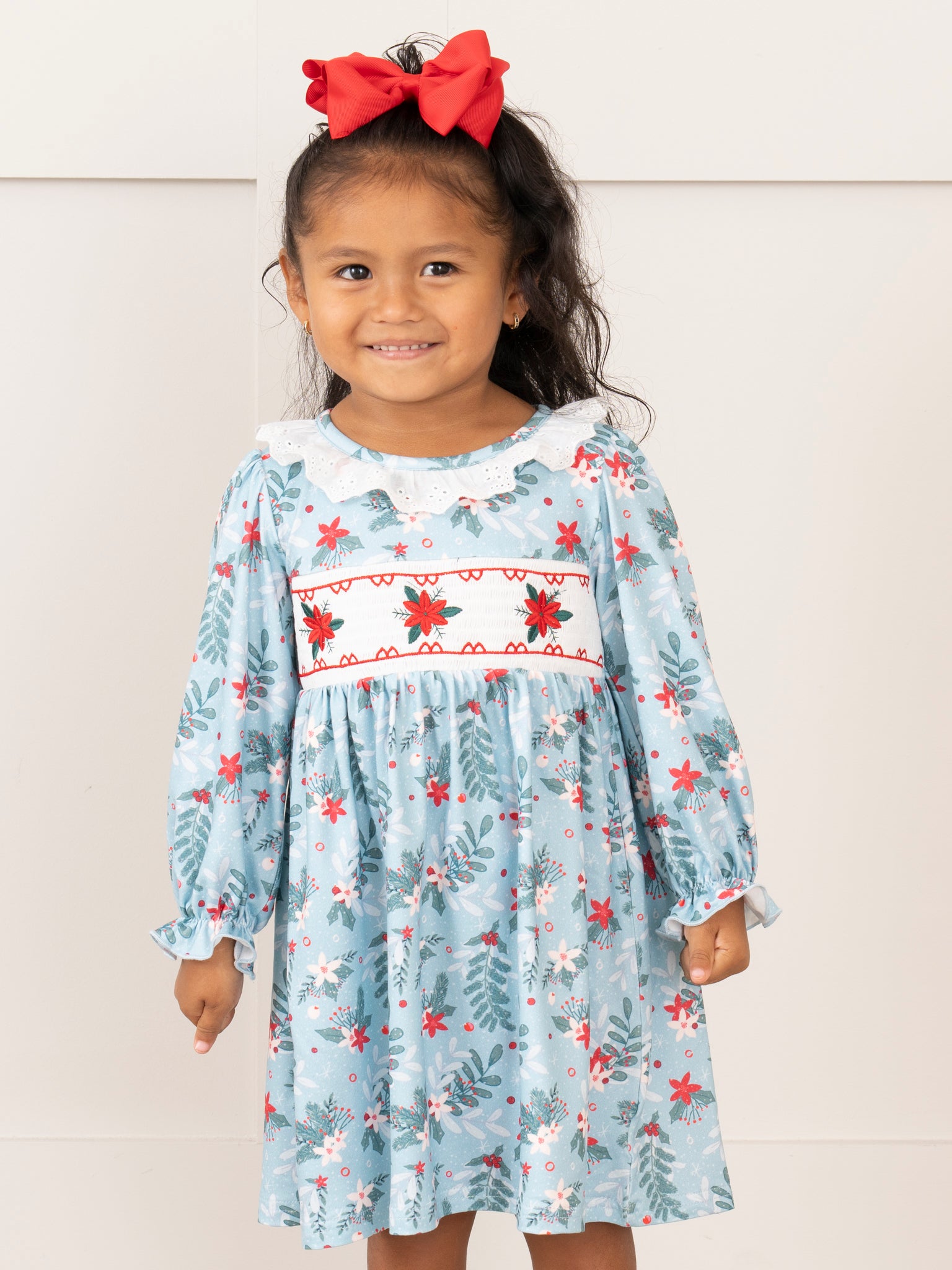 Get festive with this teal smocked dress for girls! Featuring a unique poinsettia print bodice and delicate embroidered poinsettia flowers over smocking, this dress is perfect for celebrating the season. The lace collar adds an extra special touch. Also available as part of a sister set.