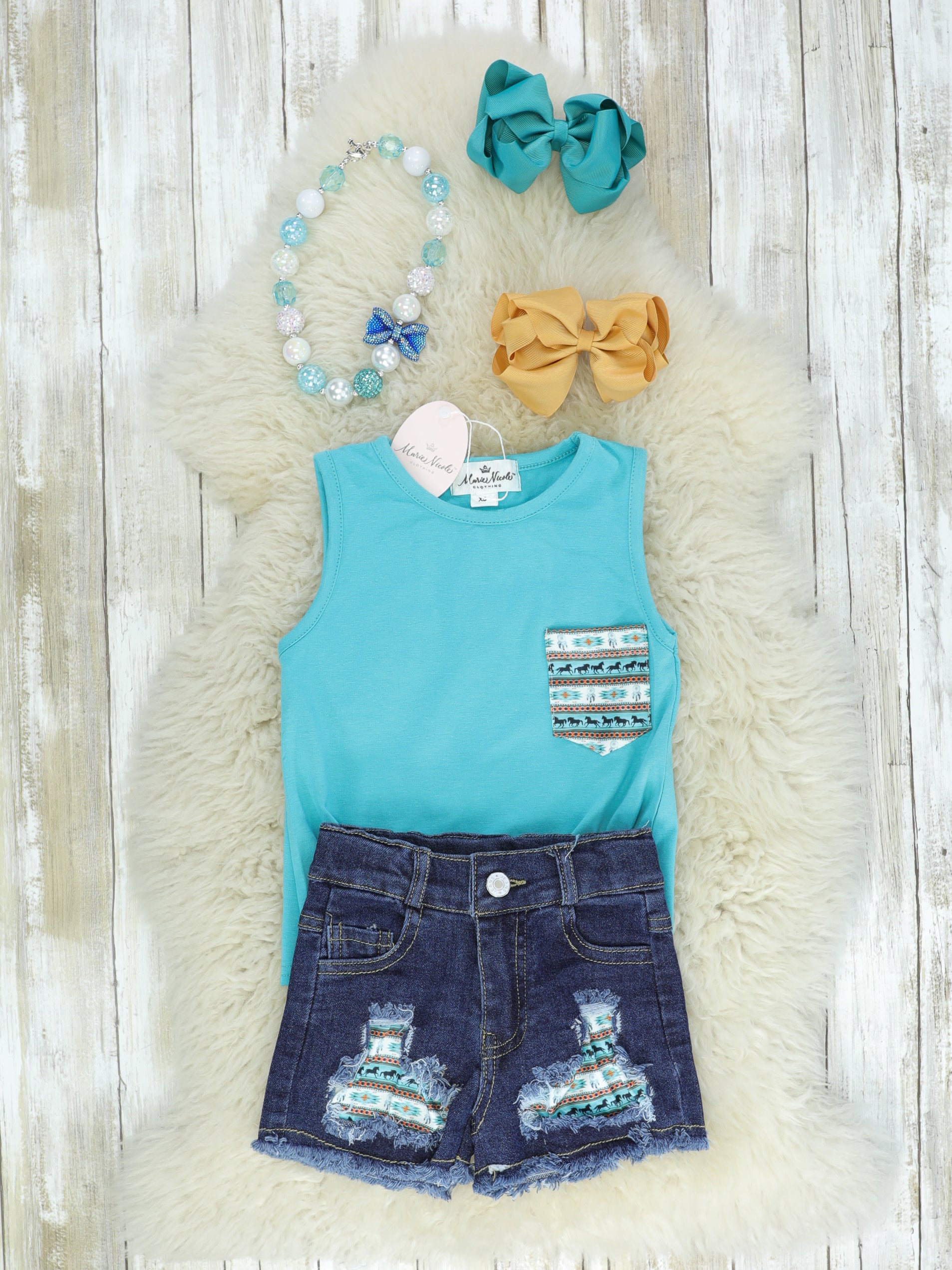 The cutest Summer fit for your horse loving girl! This outfit features a teal tie tank with a horse aztec detail pocket & distressed denim shorts with matching horse aztec detailed patches. Shop the sister set here!