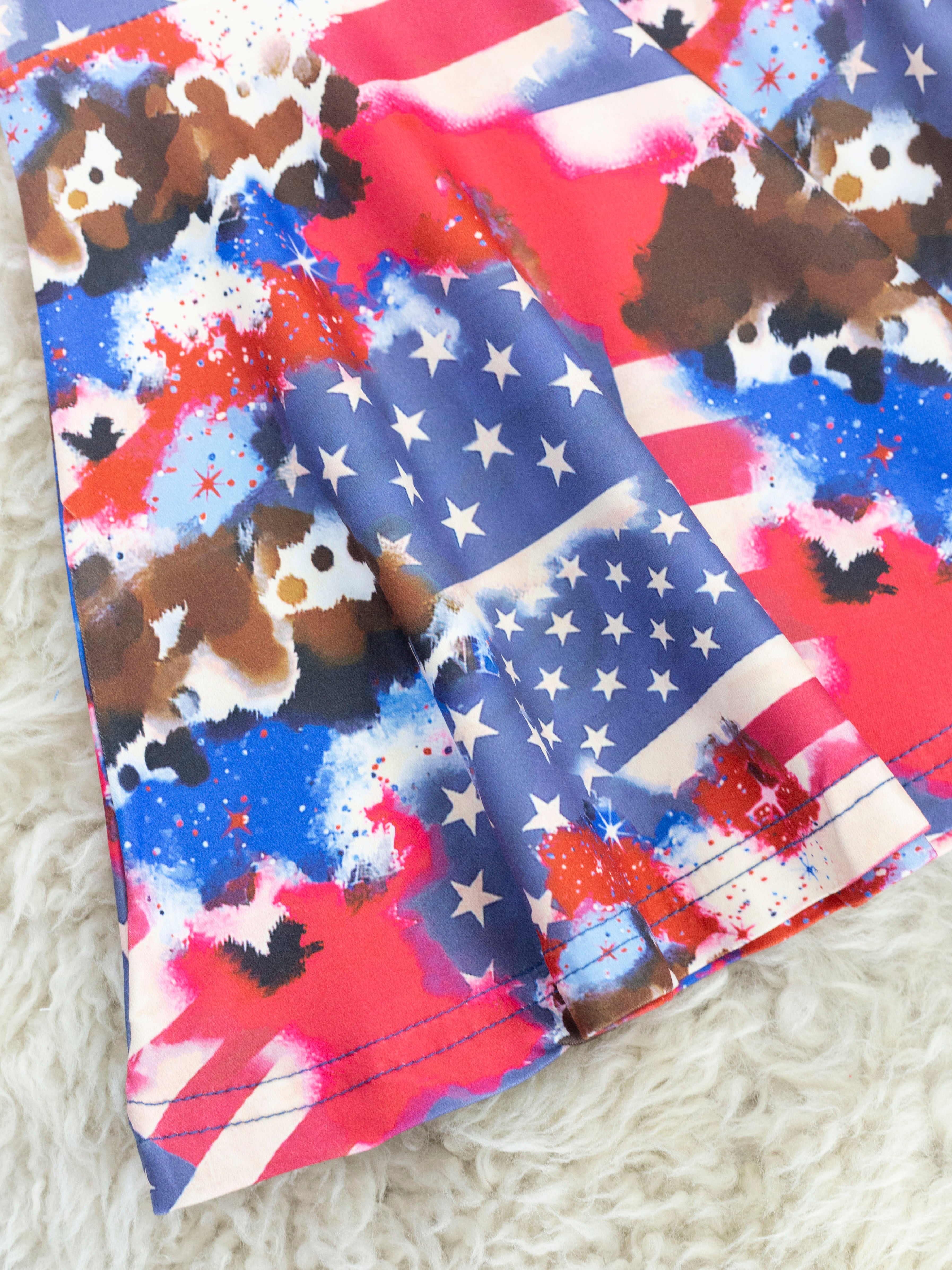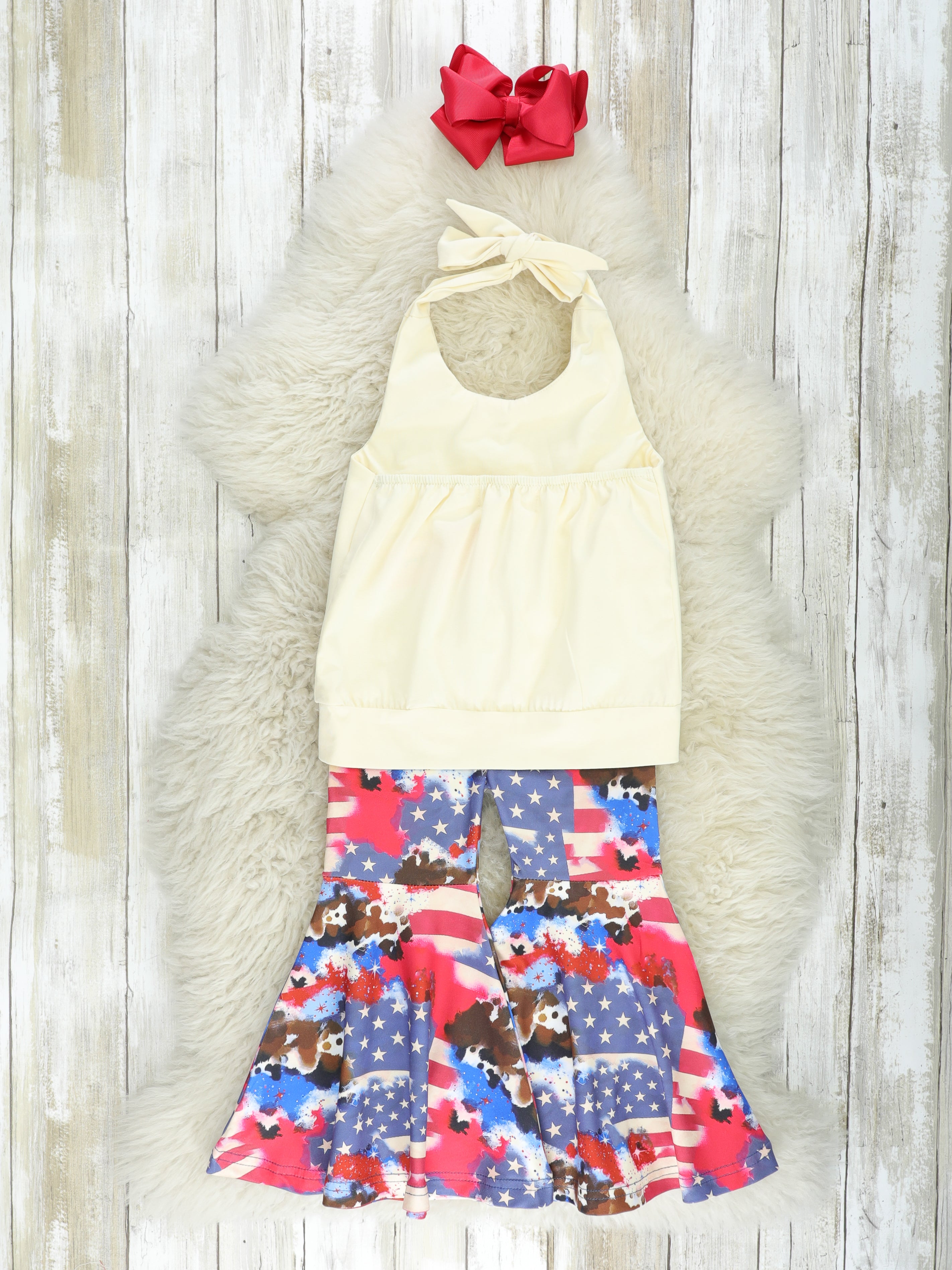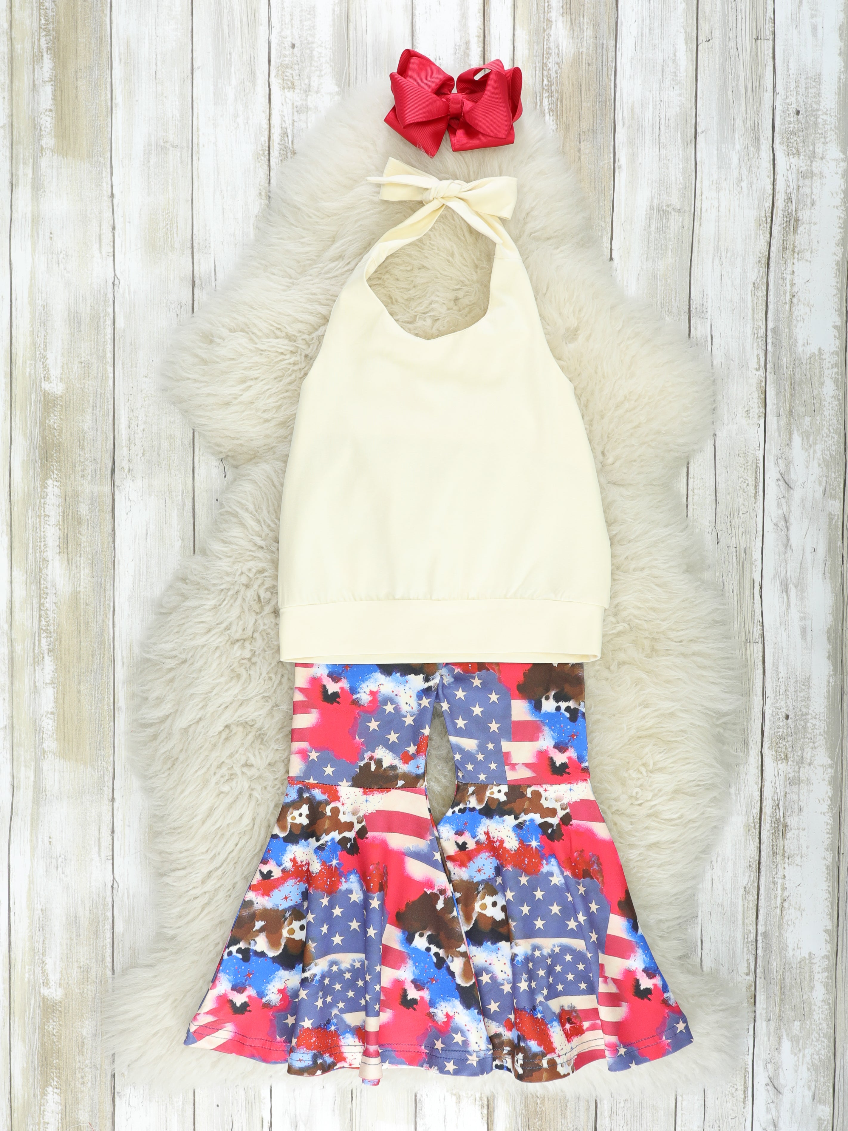 Let your little patriot show off their red, white and blue with our Tie-Top & American Flag Bell Bottoms. The cream halter tank has tie straps that give it an extra ‘pow-factor’ while the American flag bell bottoms are sure to become a showstopper! The elastic waistband adds just the right amount of comfort - so you can be sure they’ll be the most stylish and cosy at the parade.