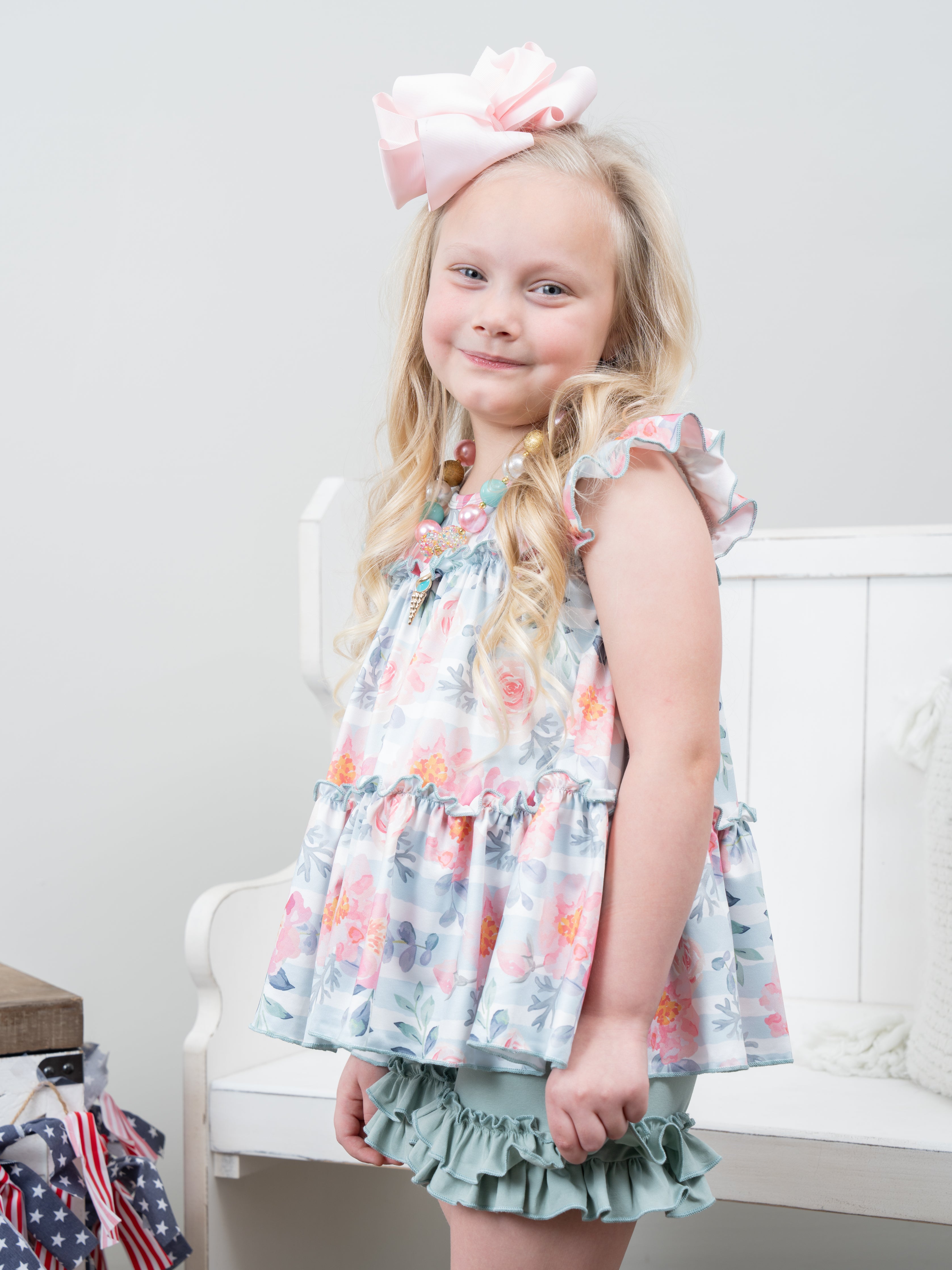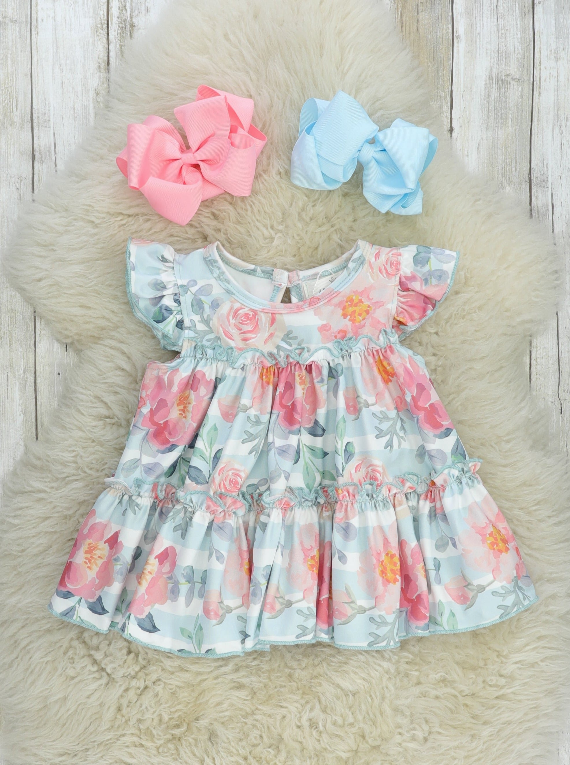 These sweet tunics are perfect for spring & summer fun! This tiered tunic features a stunning pink rose design, ruffles, flutter sleeves, & a keyhole at the nape of the neck for easy changing.