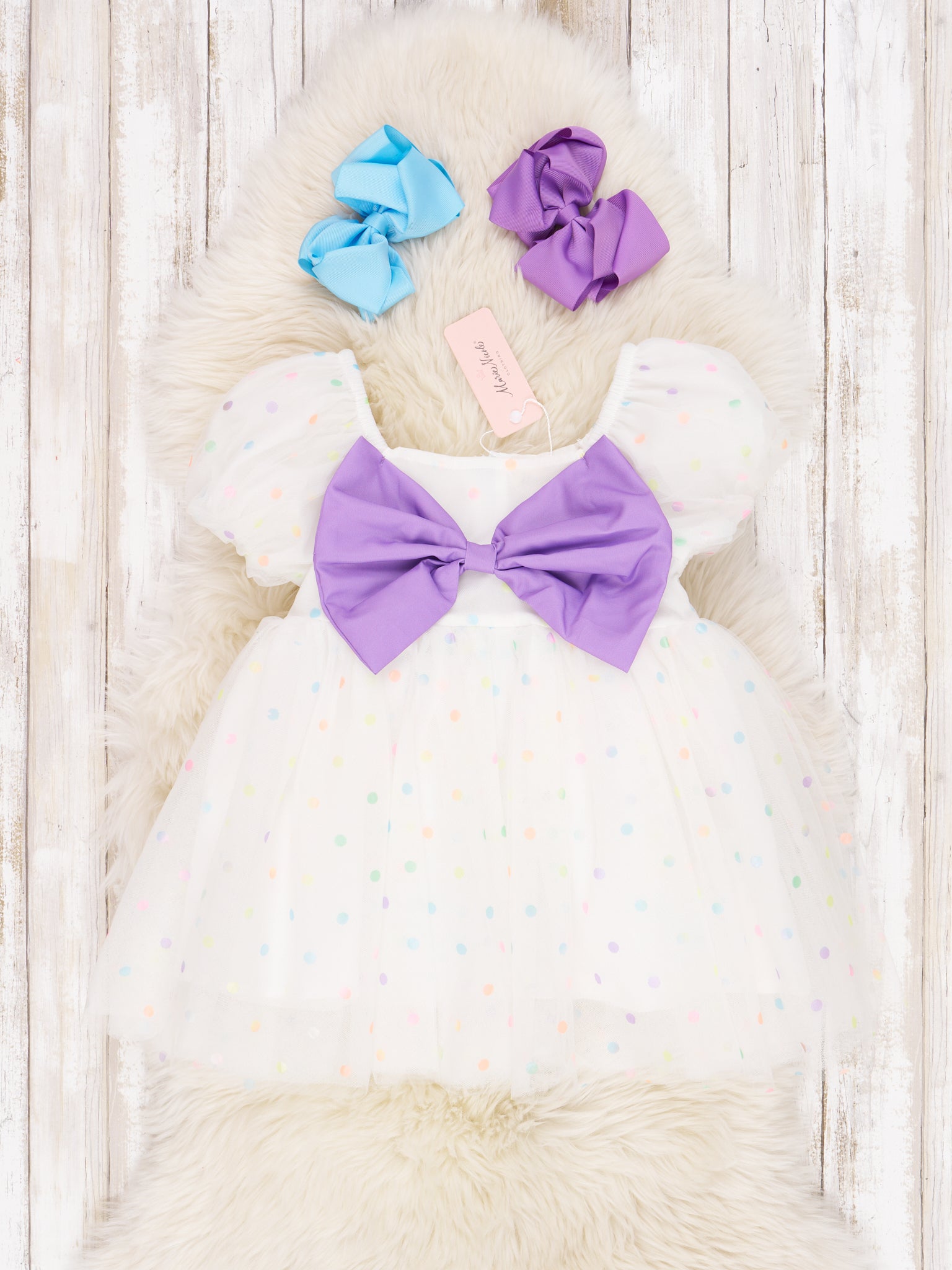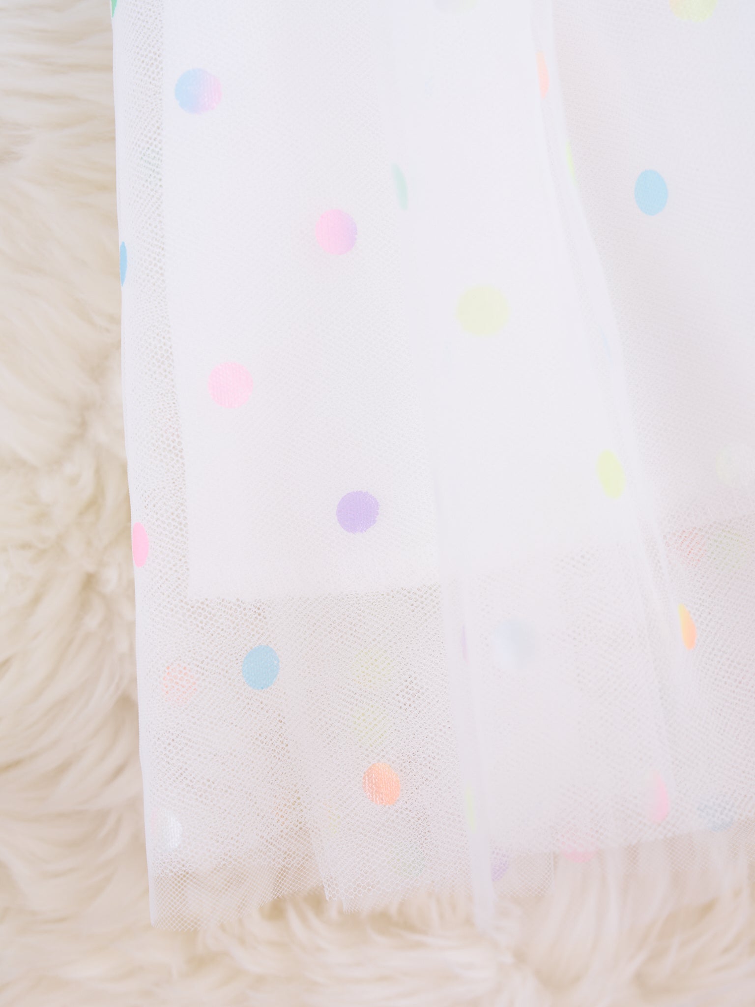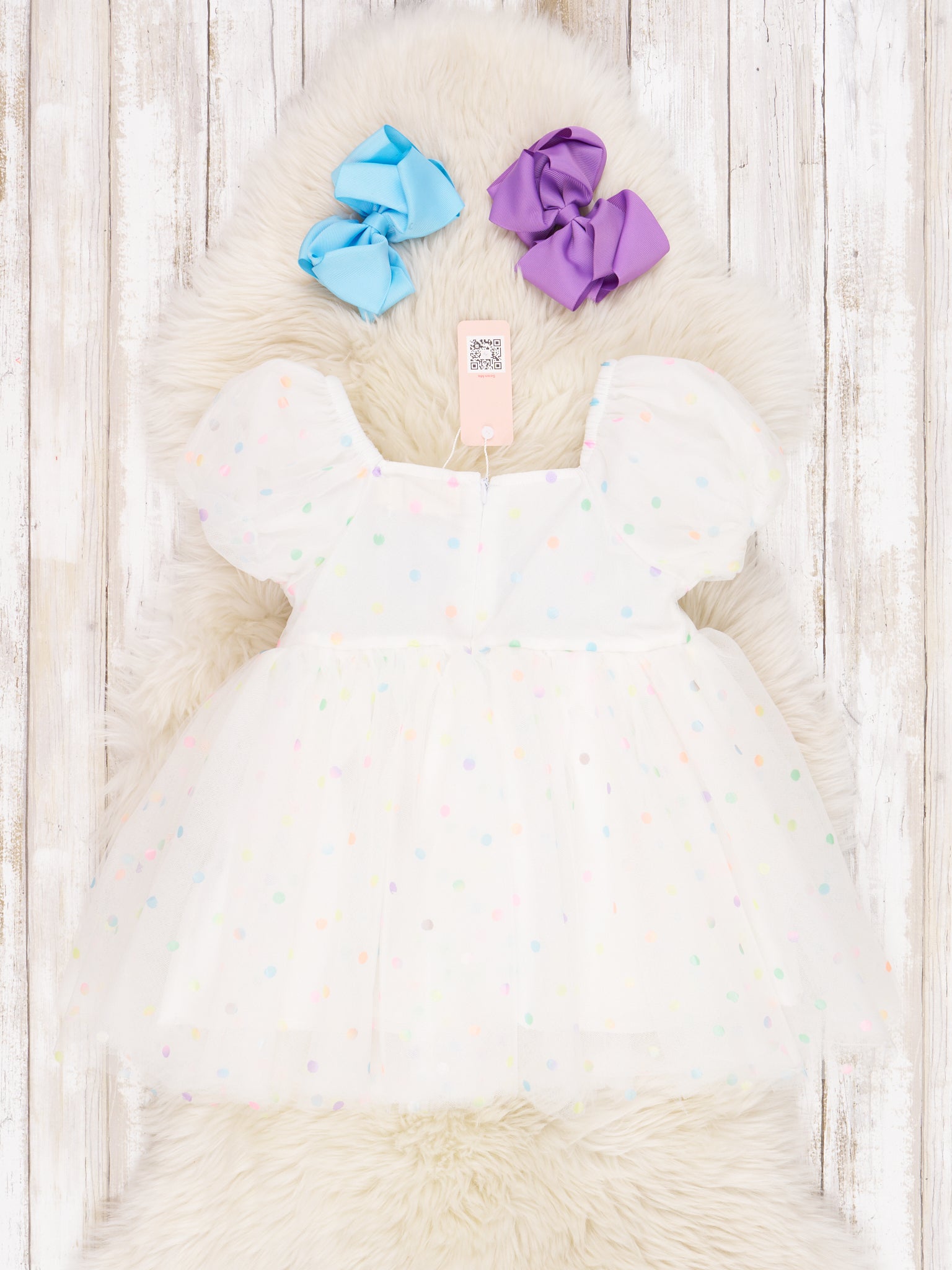 This Tulle Polka Dot Bow Dress is sure to turn heads! This adorable dress is crafted with a tulle overlay, sweet polka dot detailing, and an eye-catching bow.