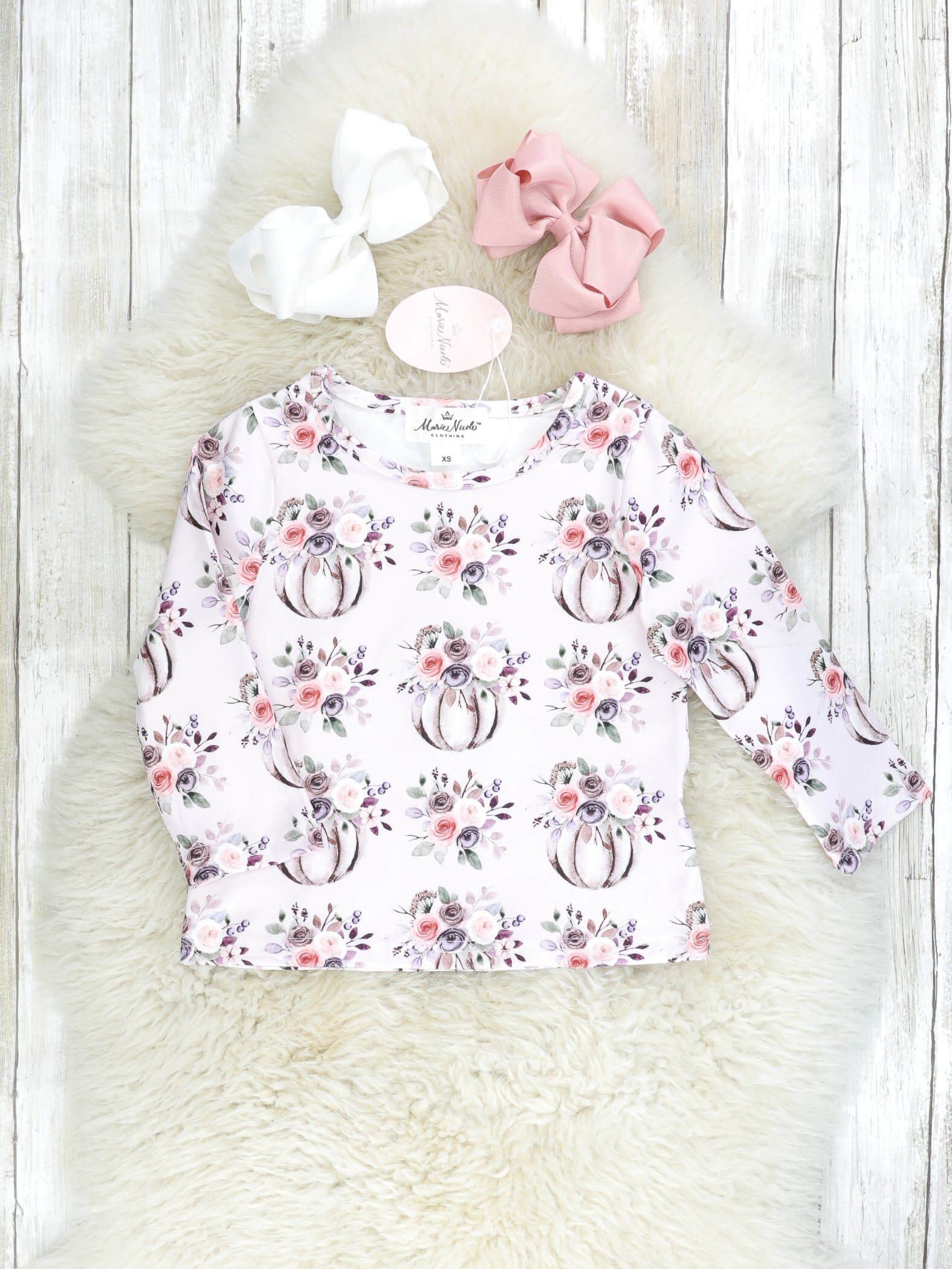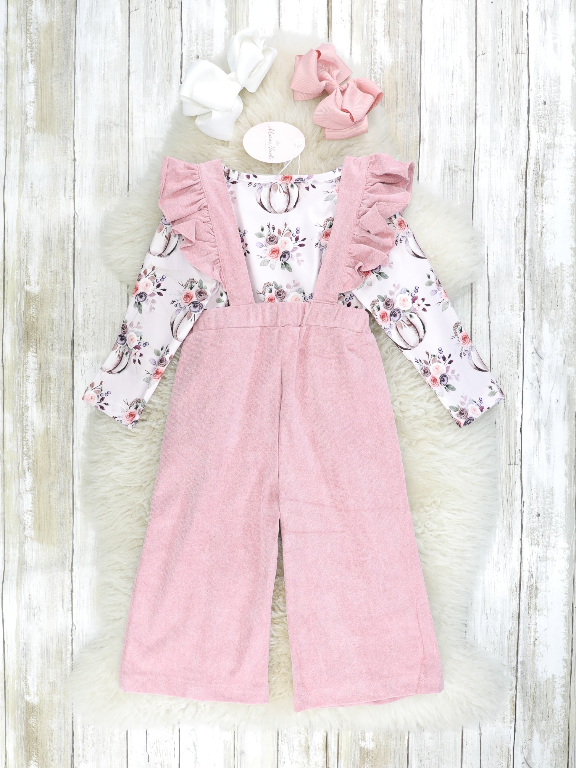 Vintage Floral Pumpkin Top & Pink Suede Ruffle Overall Set