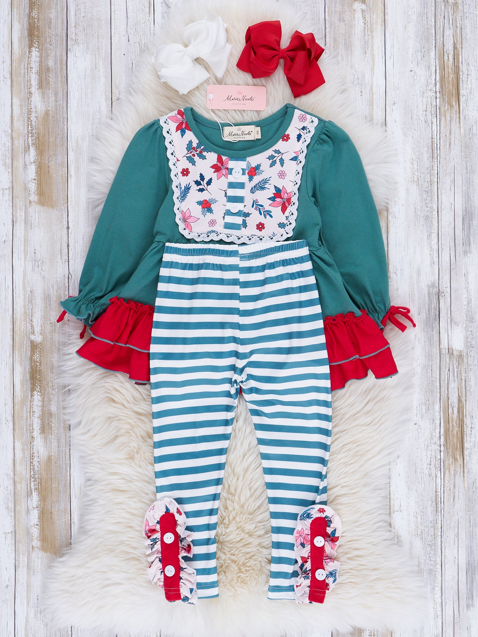 This vintage sister set is a must-have for the season! 🌺 Treat your girls to a classic look with this outfit featuring a sage green bodice with floral and lace detail and bright red ruffle hem paired with green striped leggings with ruffle ankle detail!