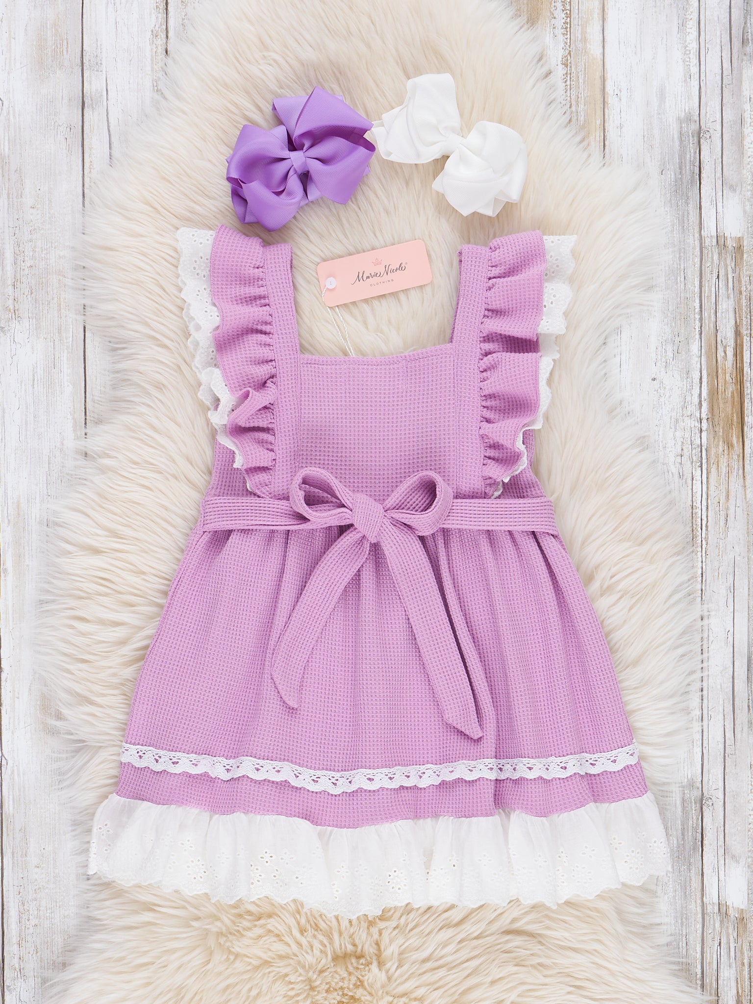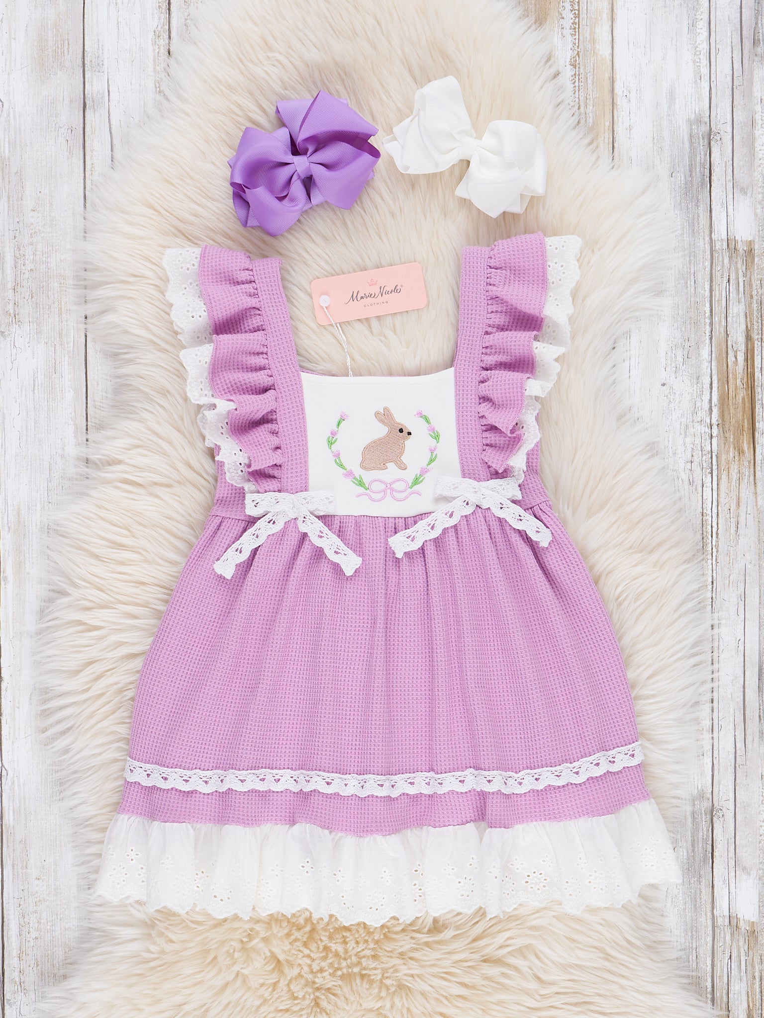 Hop into spring with this adorable Waffle Knit & Lace Bunny Ruffle Dress! Made from soft lavender waffle knit fabric with delicate lace trim and an embroidered bunny, this girls dress is perfect for Easter and beyond. Part of the sister set from Marie Nicole Clothing.