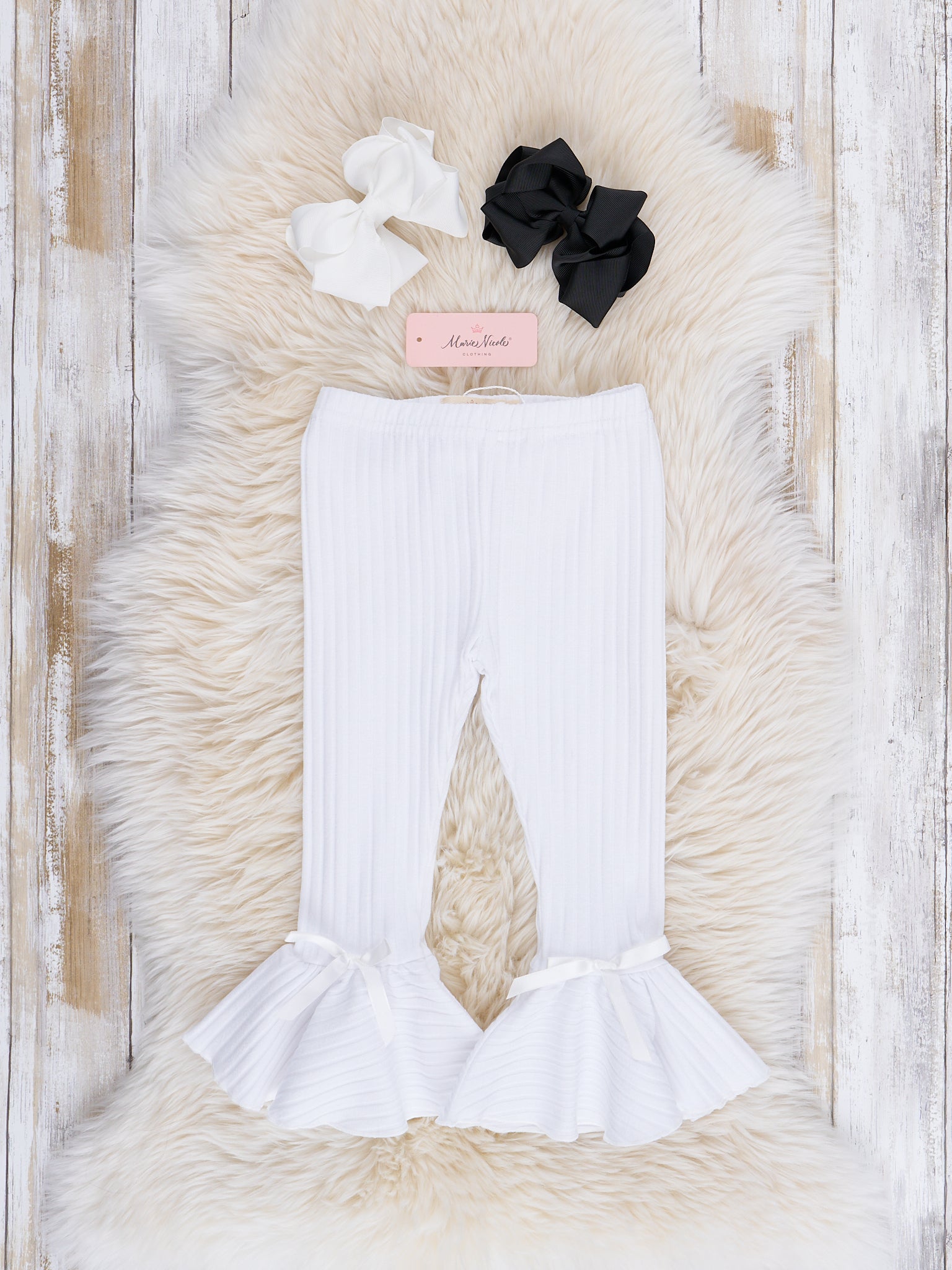 Get your little one groovin' in style with our White Ribbed Bell Bottom Leggings! These girls leggings not only offer a trendy bell bottom with bow detail, but also provide ultimate comfort with their elastic waist. Perfect for playtime or a casual day out, these leggings will quickly become a wardrobe favorite!