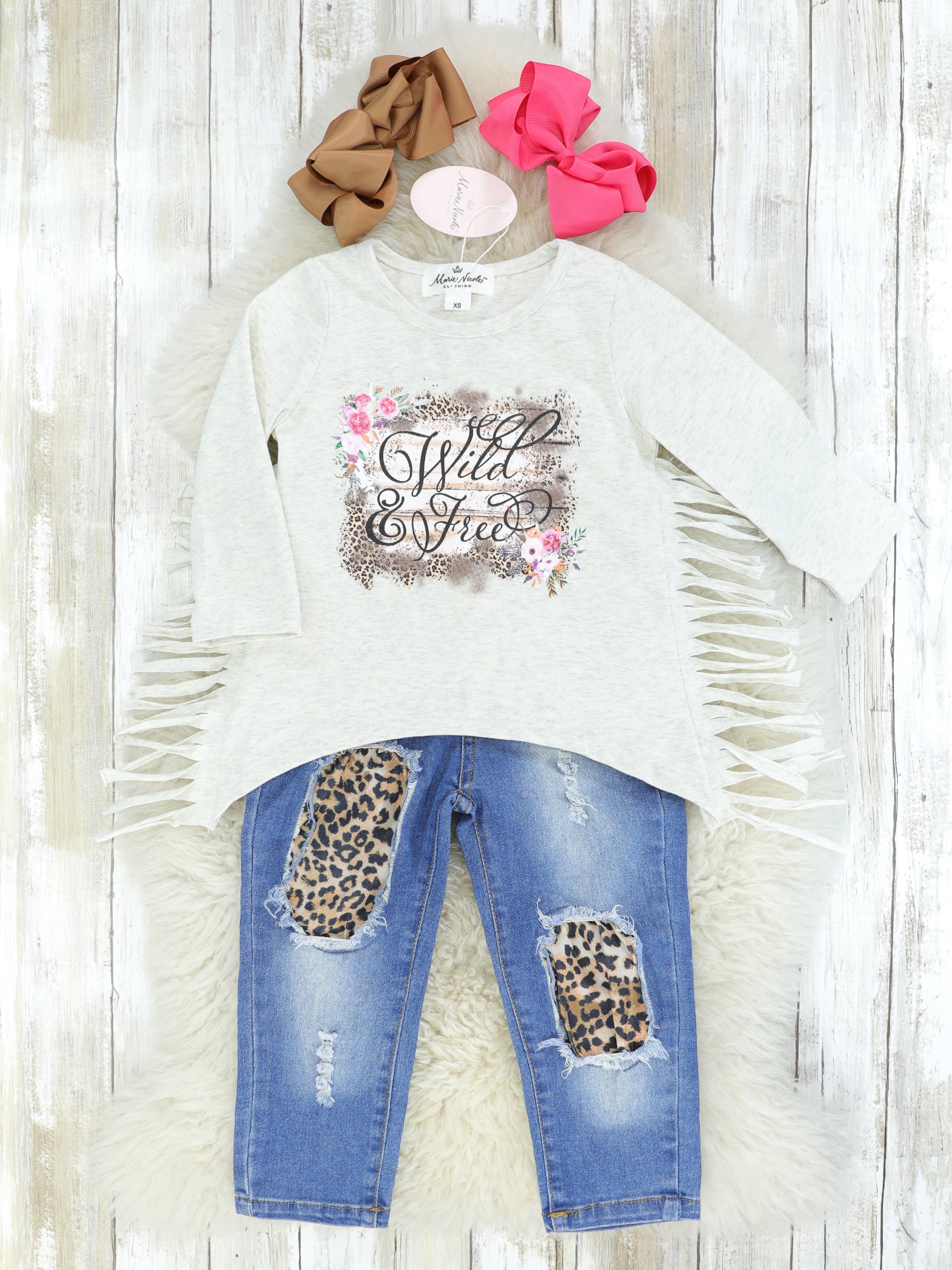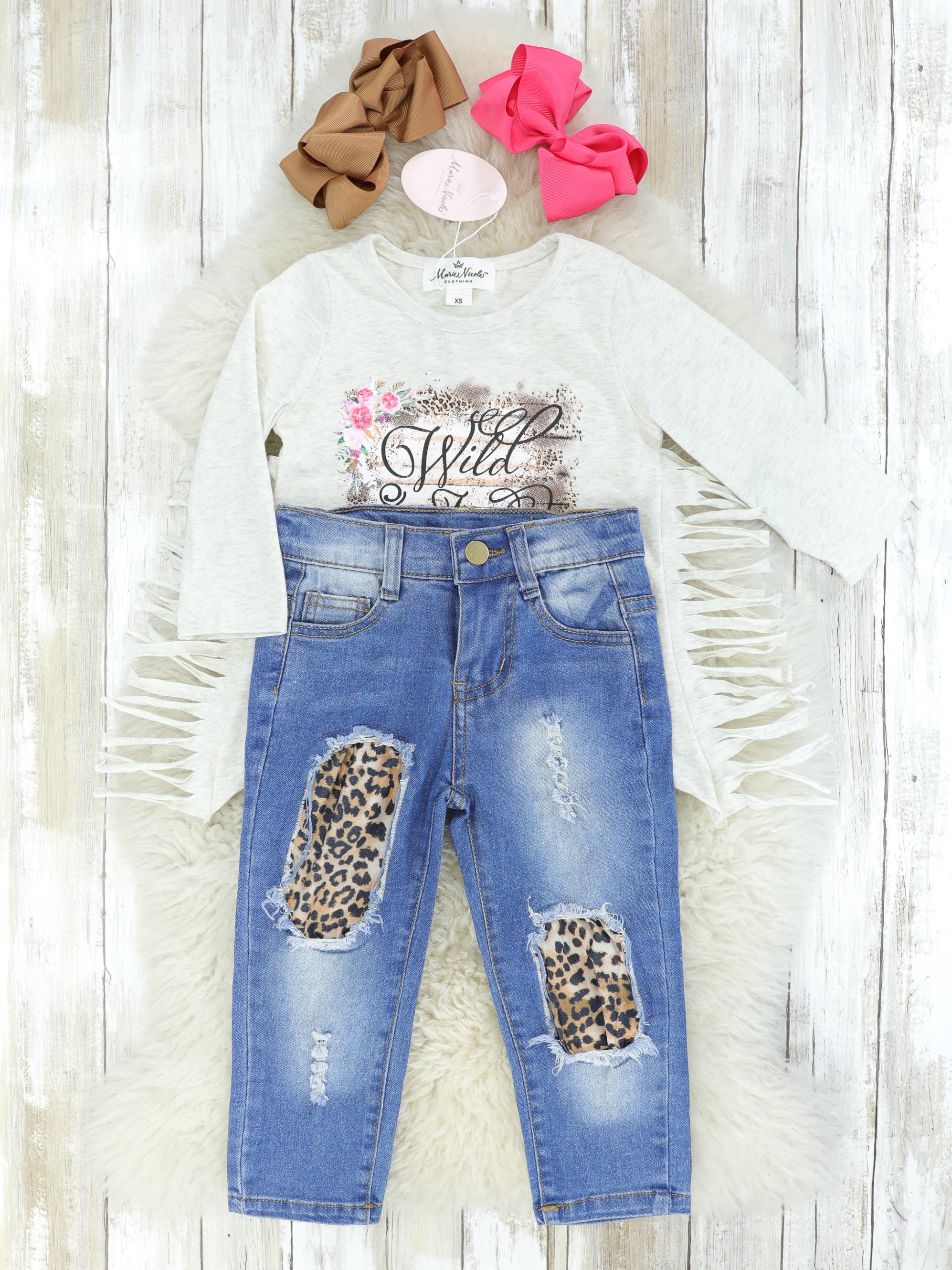 The best outfit for you wild ones! This outfit features a raw hem and fringe along the sides. The distressed denim has leopard print patches for coverage.