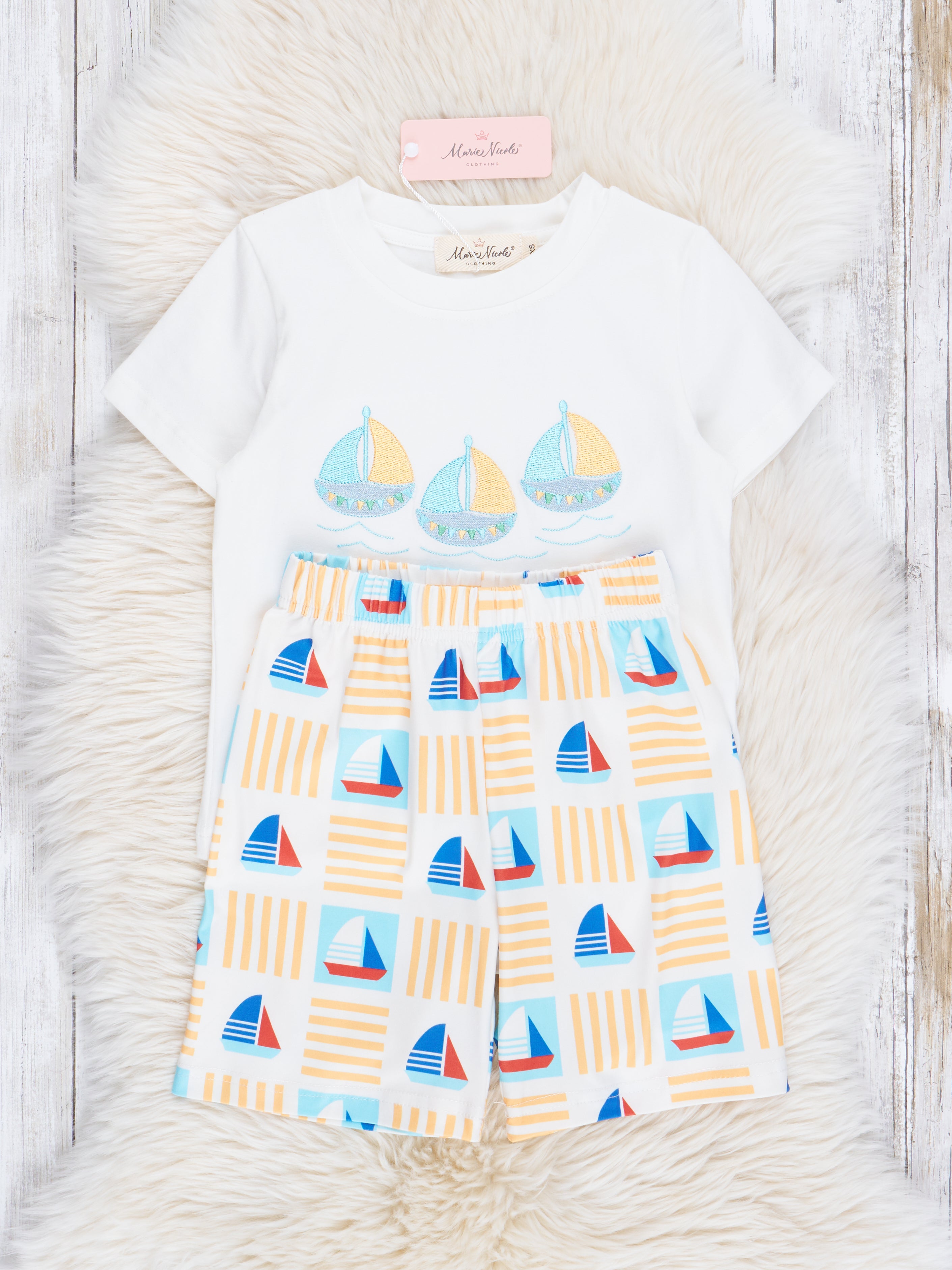 This adorable outfit features a cute embroidered sailboat design, making it perfect for your little sailor. The bright yellow and blue printed shorts add a fun touch to this look for little boys. Get ready for adventure with your little one in this charming and playful outfit. Shop the complete sibling set!