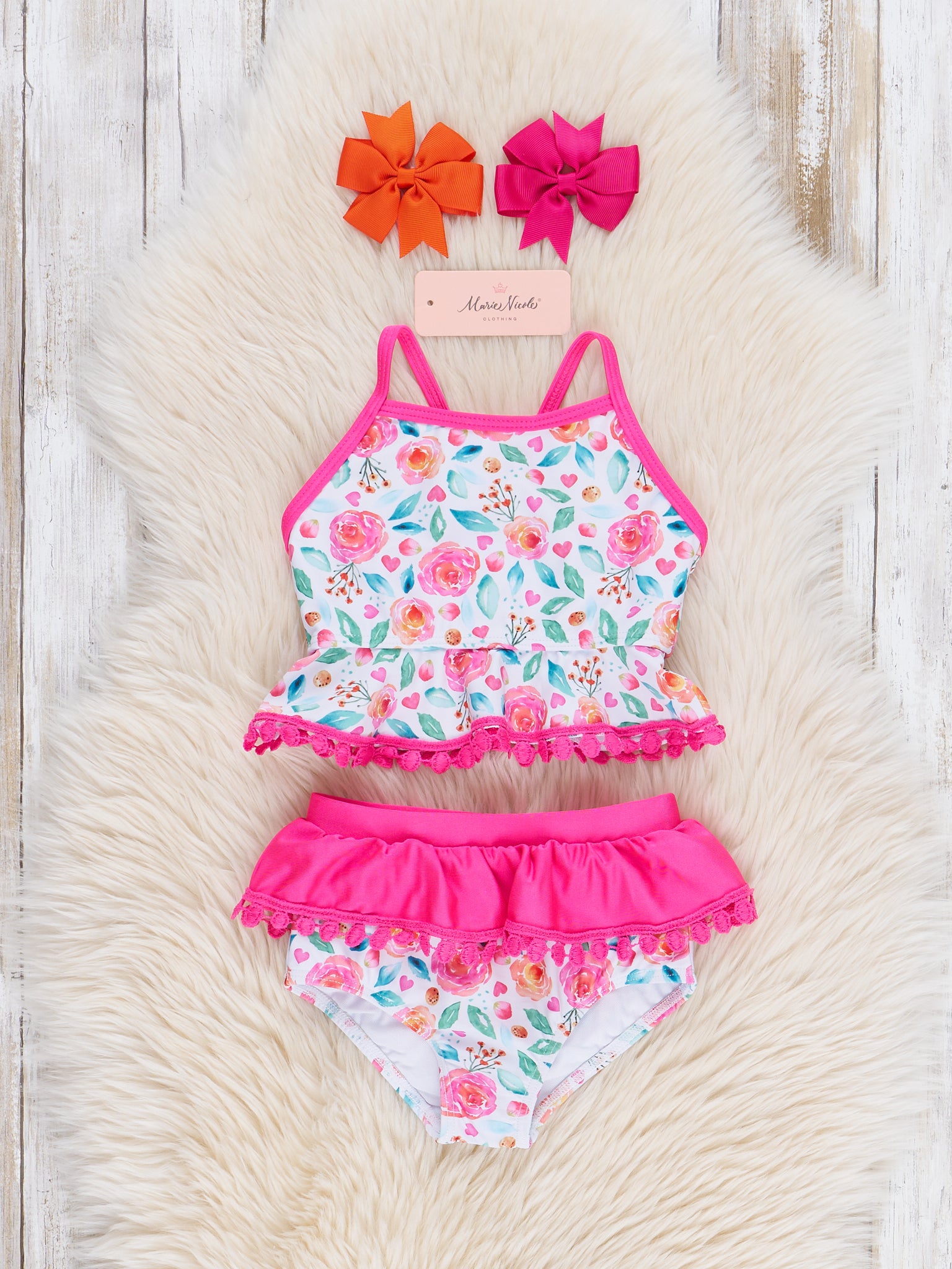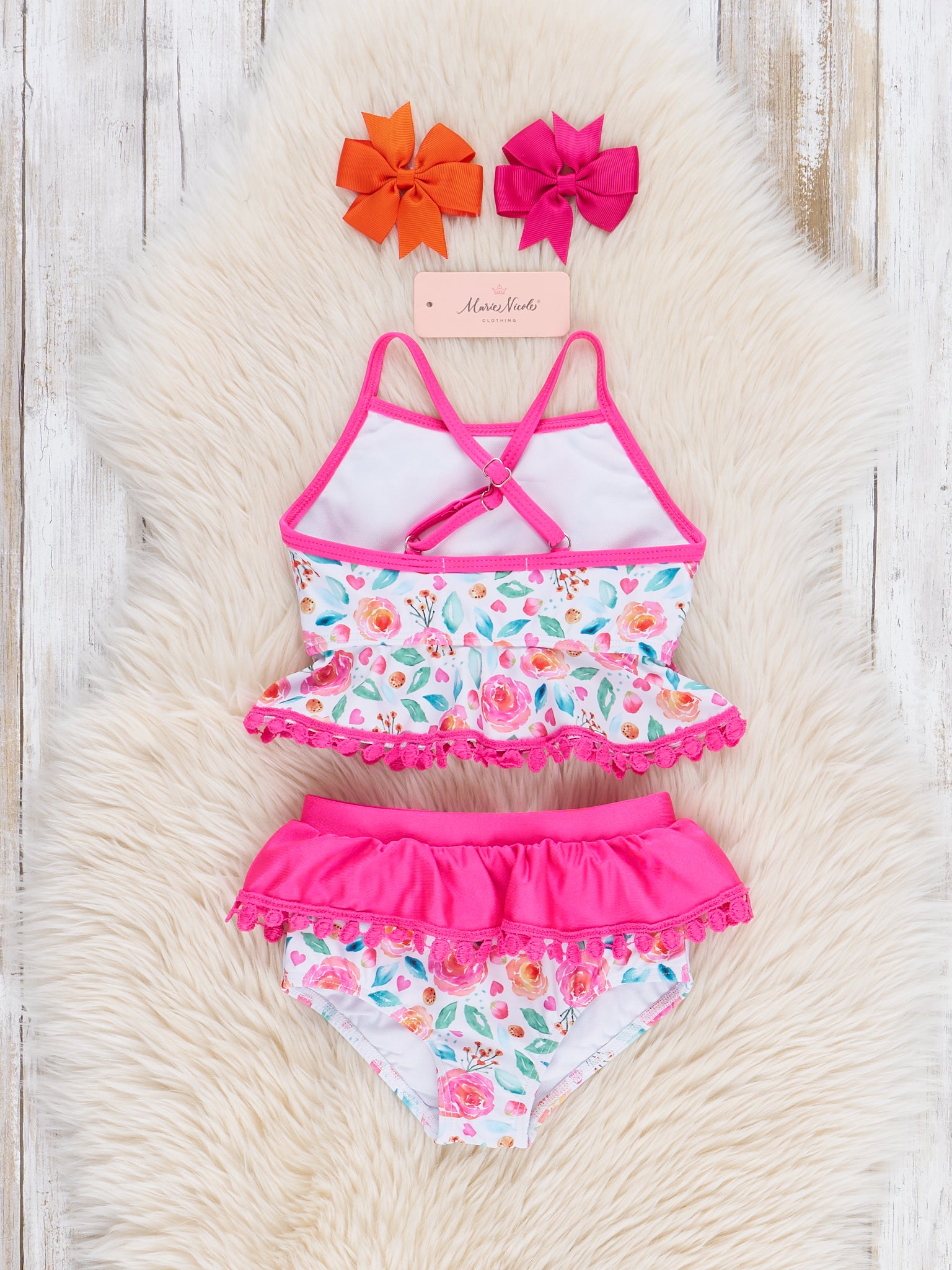 Dress your little one to impress with our Zinnia Garden Ruffle Swimsuit! Featuring a sweet zinnia print and playful pink pompom trim, this swimsuit will make a splash at any pool party. The criss-cross straps and pink peplum detail add a trendy touch, making it the perfect choice for your mini fashionista. Designed by Marie Nicole Clothing, where style meets comfort.