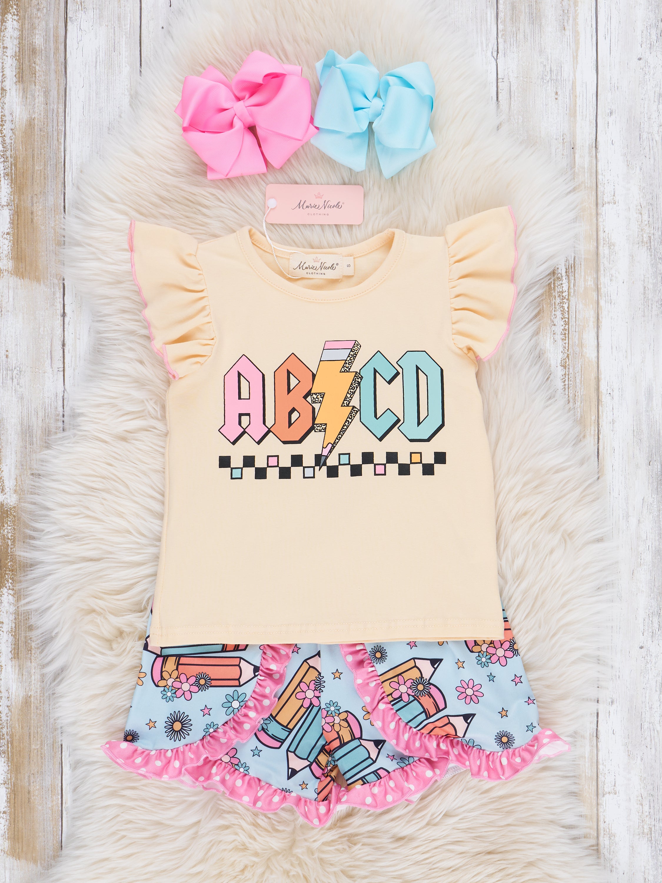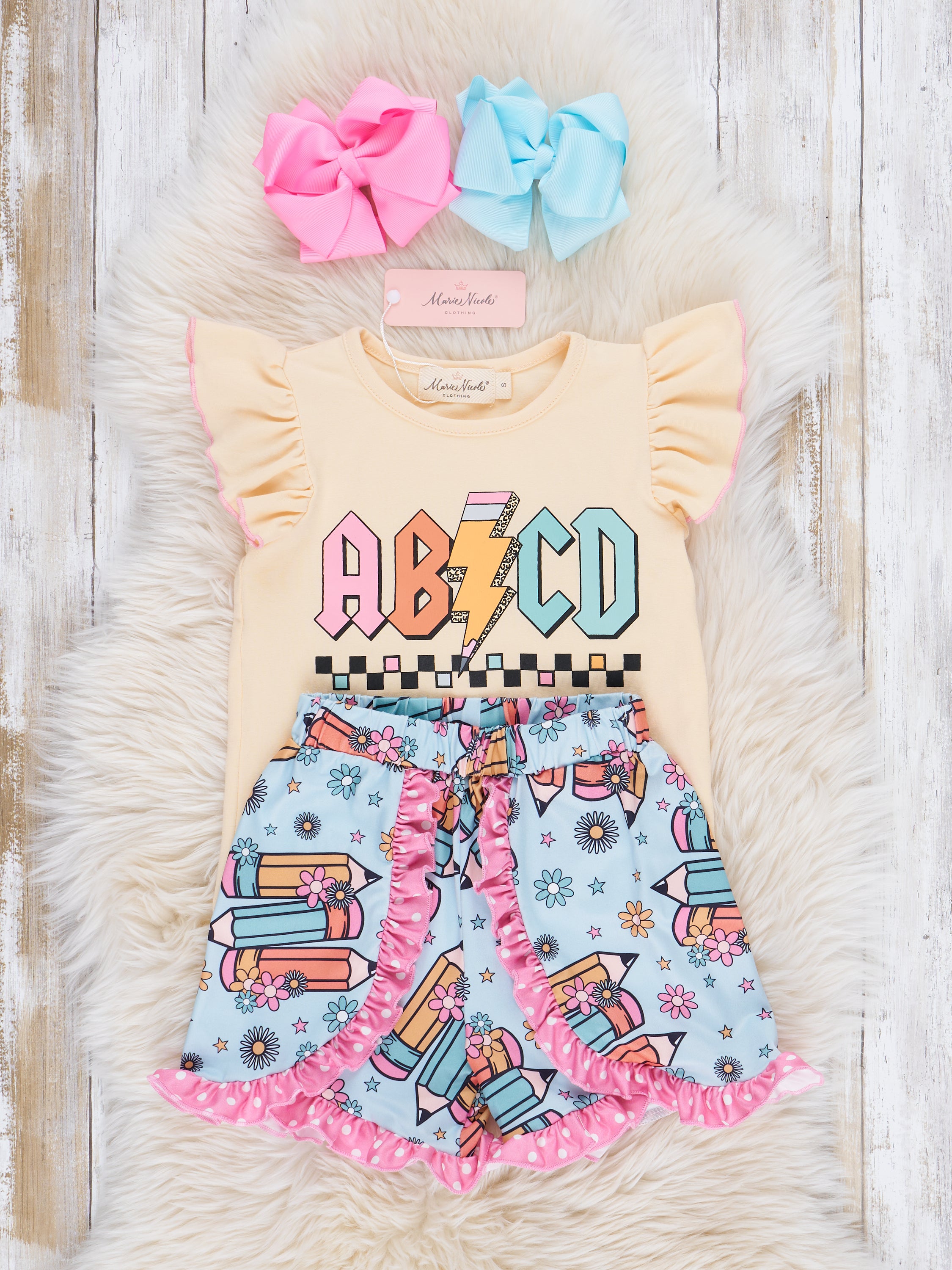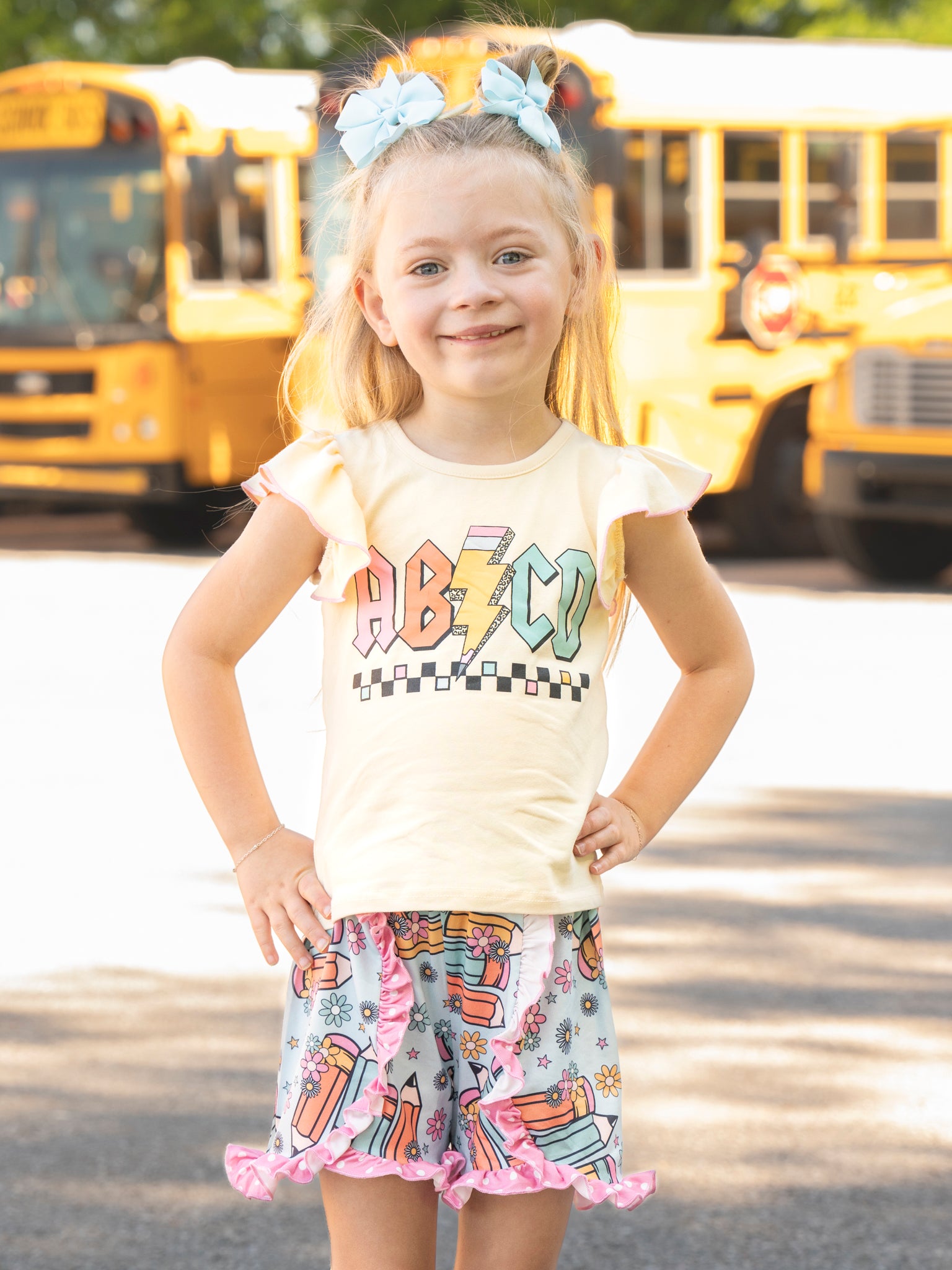 Get ready to rock the school halls with our "ABCD" Highway to School Ruffle Outfit! This quirky girls' ensemble features a printed shirt with the iconic "ABCD" logo, along with ruffle shorts adorned with school supplies. A playful and stylish way to kick off the new school year.