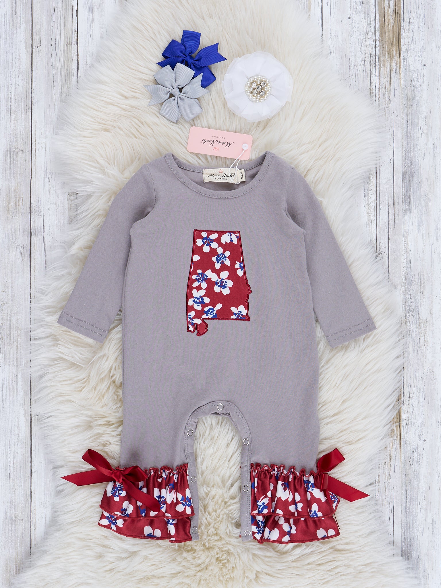 Score an instant win with this AL Crimson Sibling Set! Perfect for game-day fun or just a morning playdate, this romper is sure to help the 'Bama fans in your fam show off their state pride with delightful Alabama Crimson floral ruffles and embroidered state design.