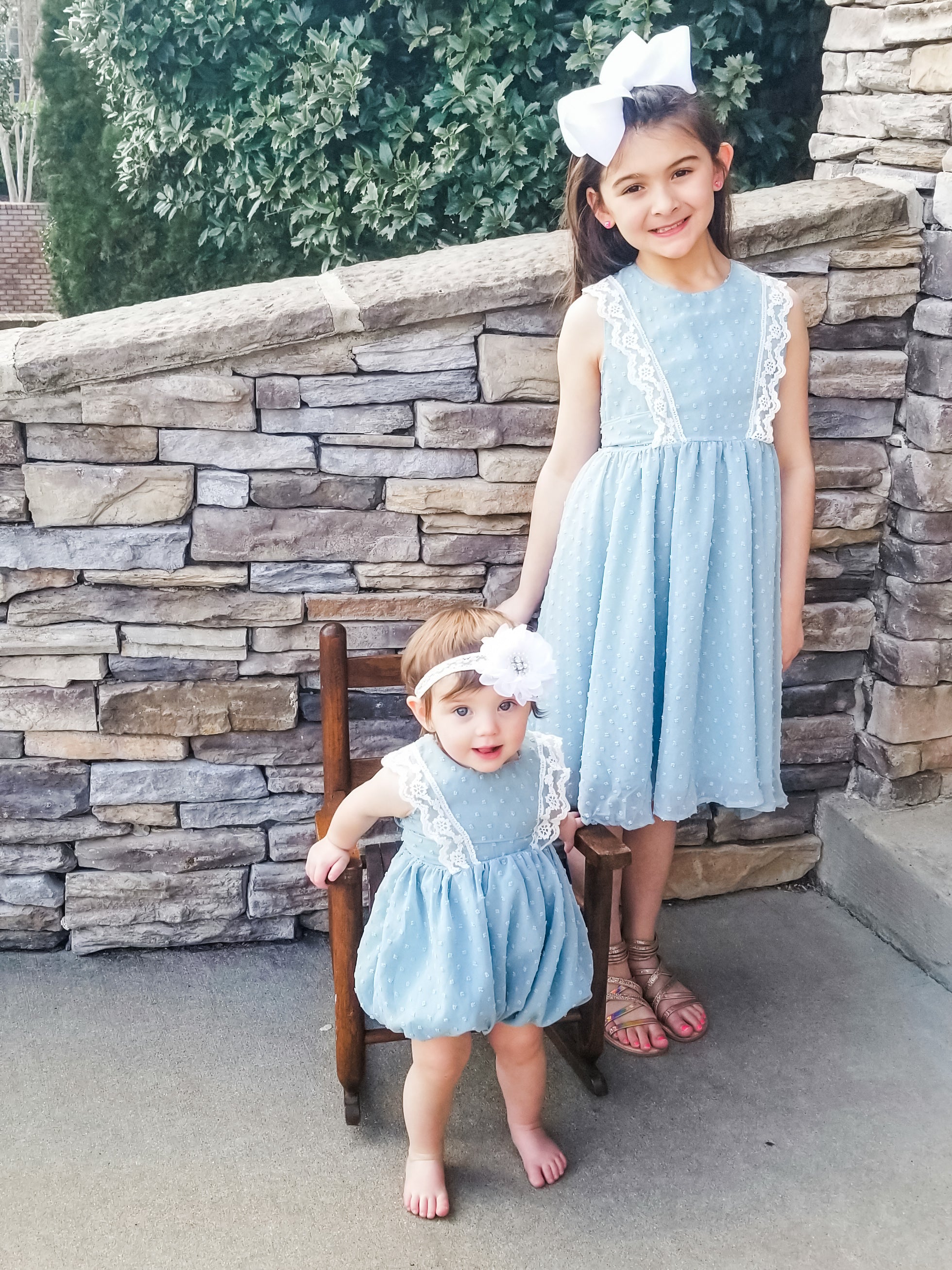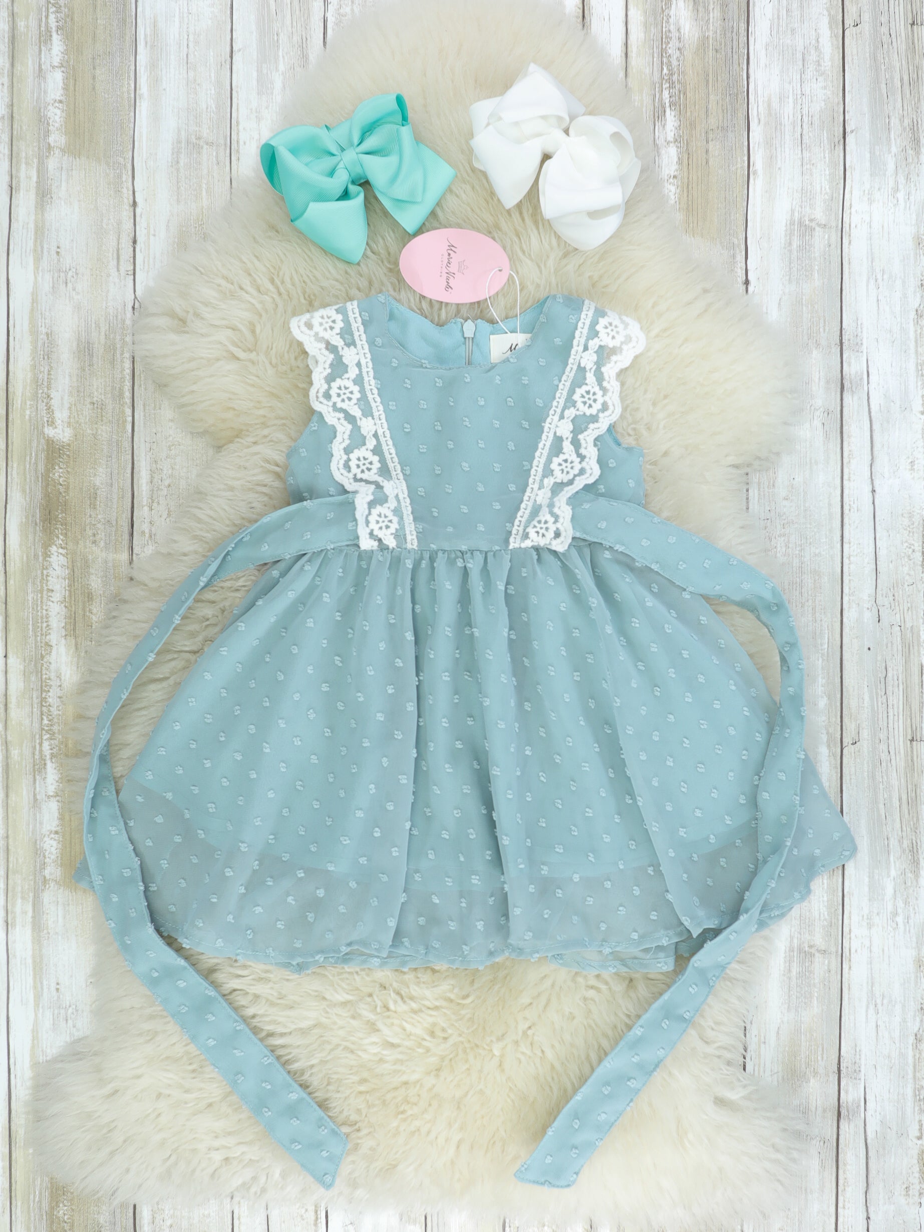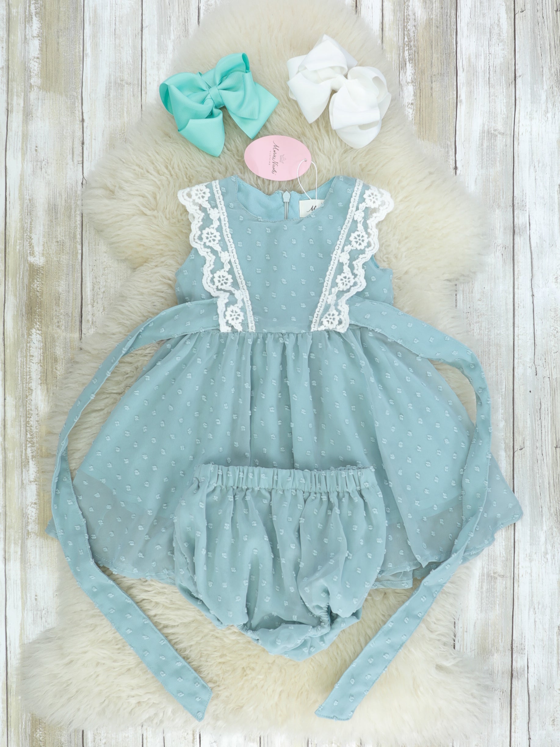 This MNC exclusive sister set is perfect for any special occasions your littles have planned during those warmer months! This ash blue dress features a precious Swiss dot pattern, embroidered lace details, an adjustable tie around the midsection, and a zippered back. Matching bloomers included with all sizes 2YRS AND UNDER.